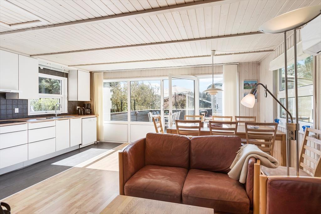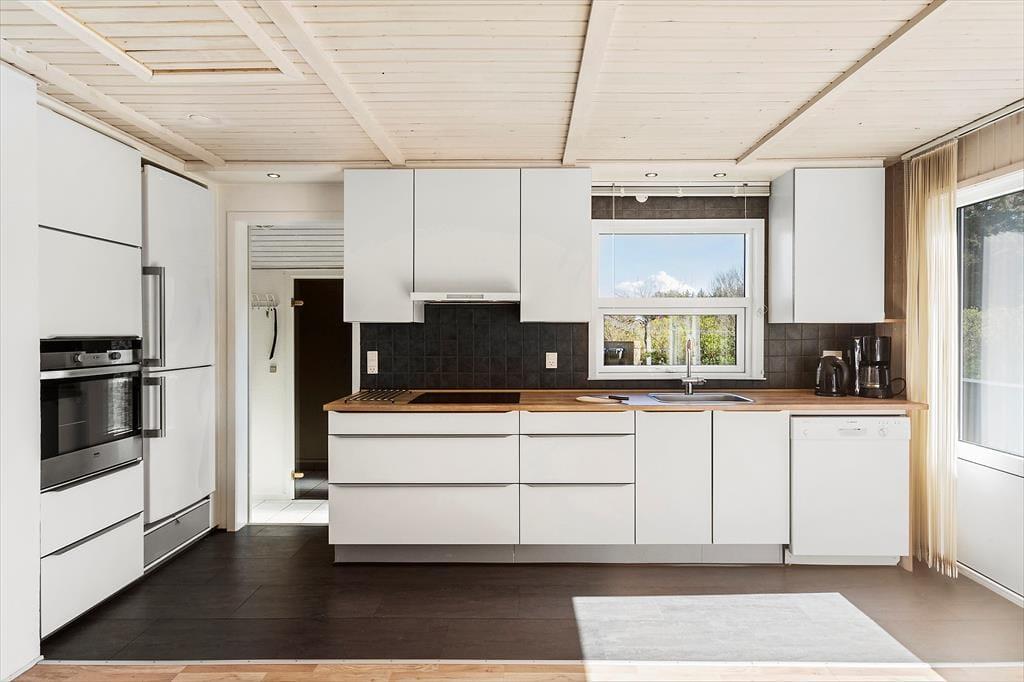 Det sortmalede træhus har en velfungerende planløsning, for mens de tre soveværelser og badeværelset er placeret i den nordlige ende, ligger opholdsrummet mod syd, så du får mest muligt ud af sollyset i løbet af dagtimerne. Køkkenet er rummeligt, så du har god plads til at bage eller skære salat, hvis det er den slags mad, du får lyst til – og når det ikke er spisetid, er bordet et godt sted at samles til et slag yatzy eller andre sjove spil. Både brændeovnen og husets sauna sørger for ekstra varme og hyggestemning på kølige dage, og når solen står højt på himlen, kan du skynde dig ud for at nyde ferielivet på de fantastiske udearealer.
