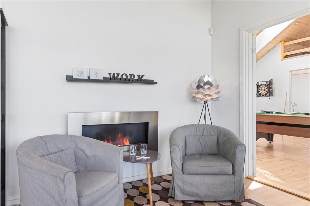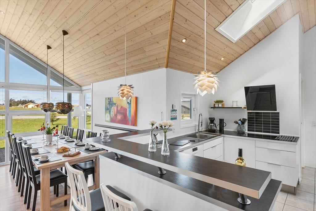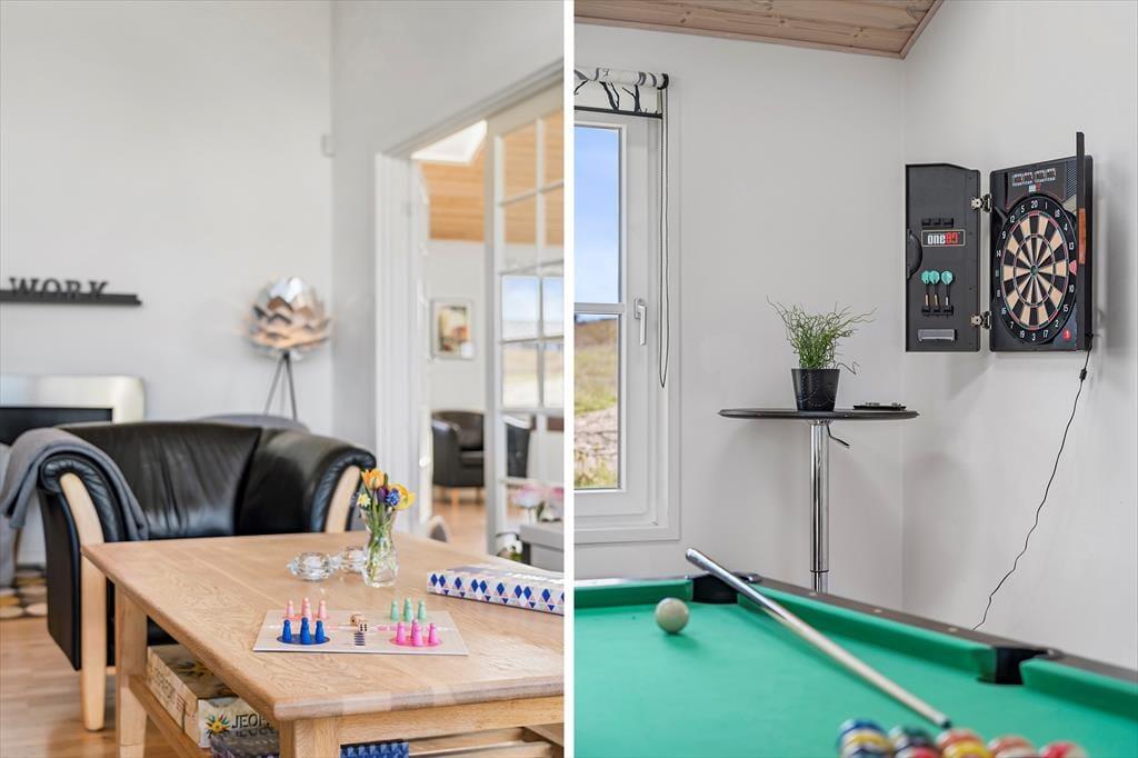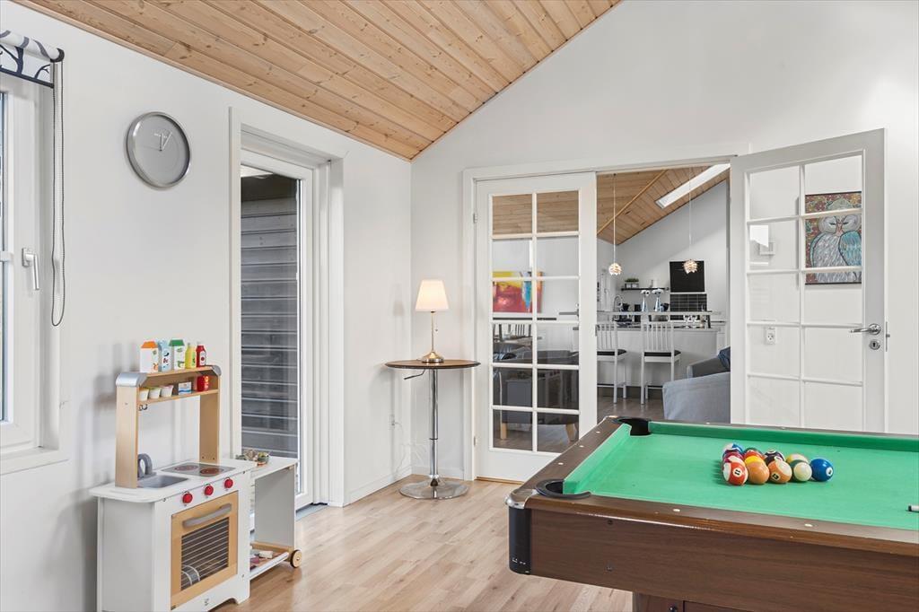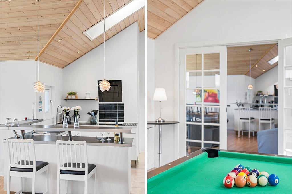 En lys og rar atmosfære møder dig, så snart du træder indenfor i sommerhuset, der har en glimrende planløsning til selv et større selskab – så hvis du vil holde rund fødselsdag med familien eller måske nyde ferielivet med en anden børnefamilie, er det oplagt at gøre det her. De fire soveværelser er fordelt i begge ender af huset, og der er endda ekstra madrasser på hemsen. De lidt større børn vil sikkert synes, at det er hyggeligt at lege og sove deroppe, mens de yngste kan hygge sig med legekøkkenet, der står i aktivitetsrummet. Her er der for øvrigt poolbord, dart og bordfodbold til familiens legebørn i alle aldre, mens spabadet og saunaen på det ene badeværelse vil glæde livsnyderne. Køkken og stue ligger i åben forbindelse lige midt i huset, så det fungerer som et naturligt samlingspunkt både morgen, middag og aften.