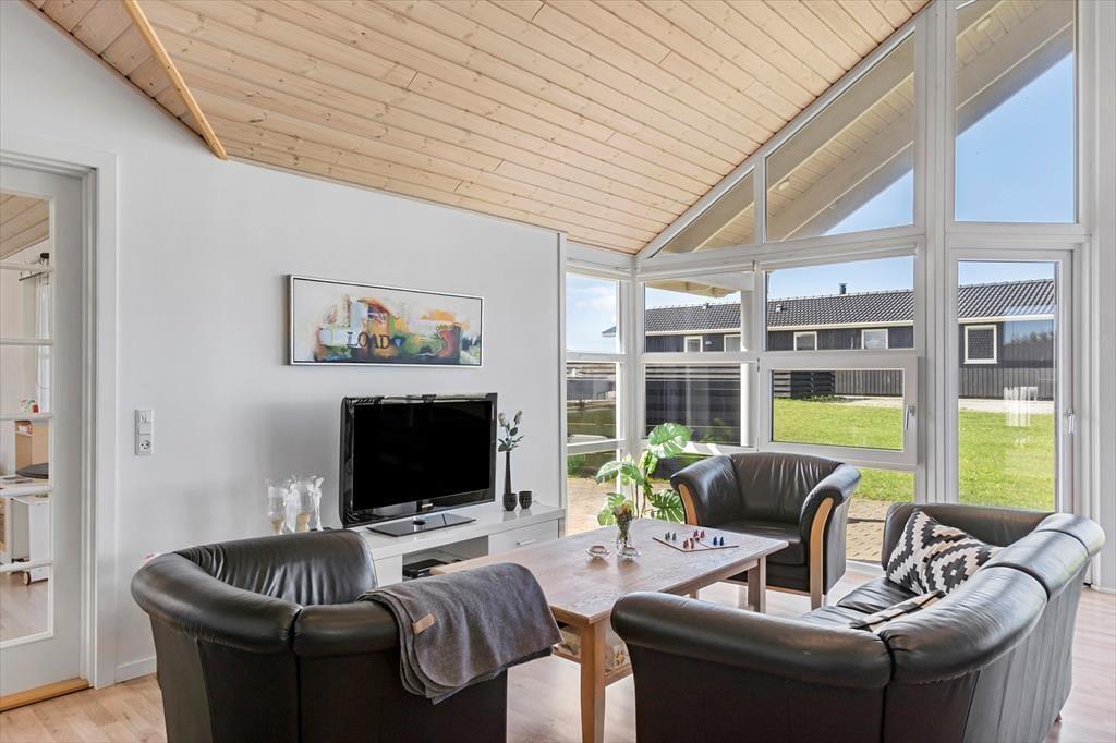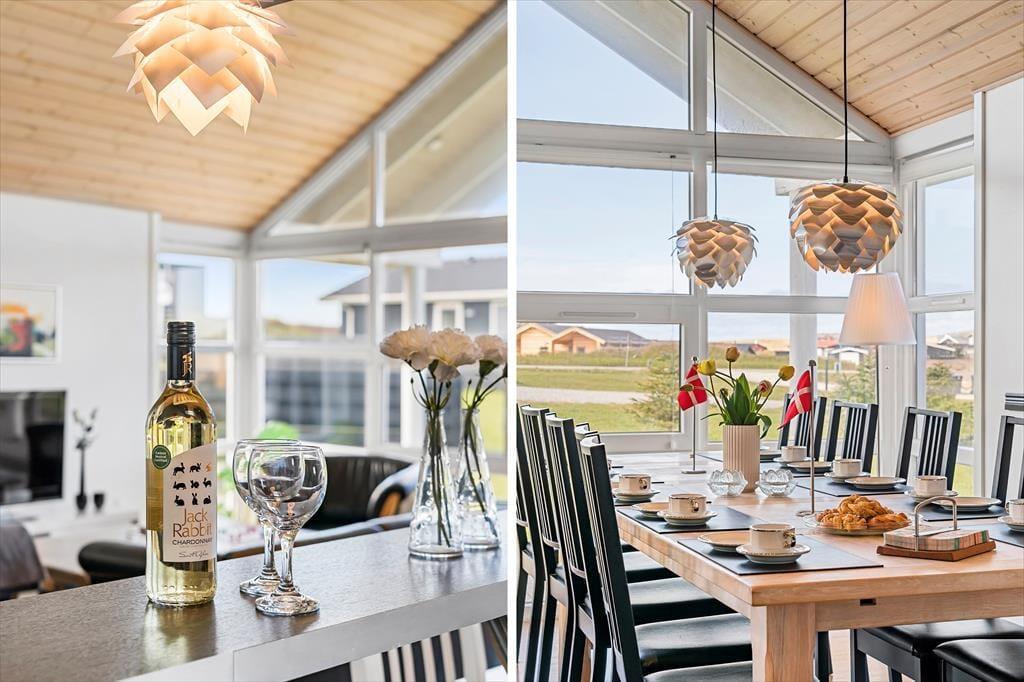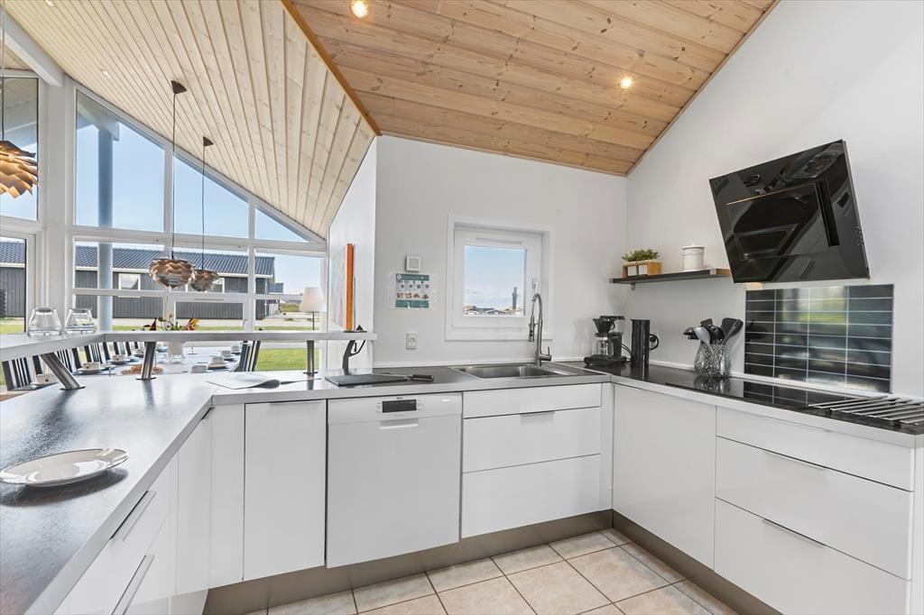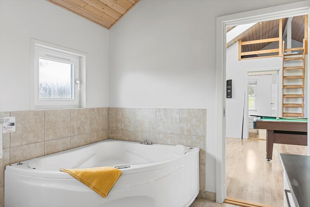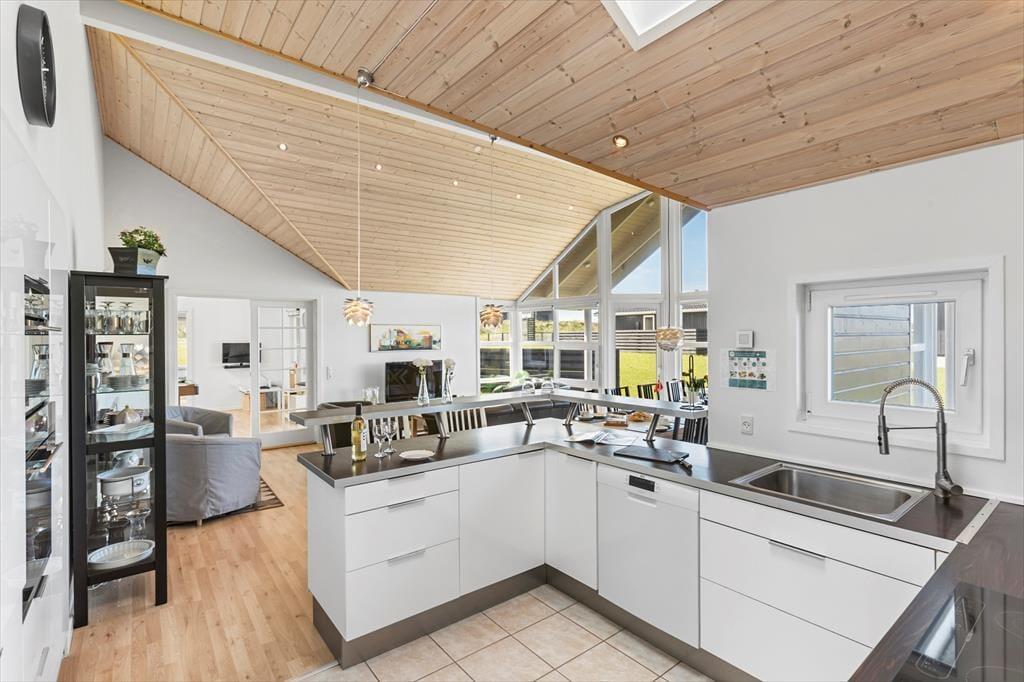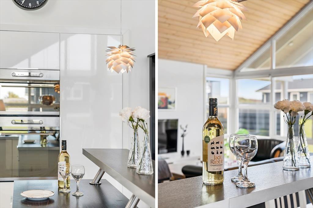 En lys og rar atmosfære møder dig, så snart du træder indenfor i sommerhuset, der har en glimrende planløsning til selv et større selskab – så hvis du vil holde rund fødselsdag med familien eller måske nyde ferielivet med en anden børnefamilie, er det oplagt at gøre det her. De fire soveværelser er fordelt i begge ender af huset, og der er endda ekstra madrasser på hemsen. De lidt større børn vil sikkert synes, at det er hyggeligt at lege og sove deroppe, mens de yngste kan hygge sig med legekøkkenet, der står i aktivitetsrummet. Her er der for øvrigt poolbord, dart og bordfodbold til familiens legebørn i alle aldre, mens spabadet og saunaen på det ene badeværelse vil glæde livsnyderne. Køkken og stue ligger i åben forbindelse lige midt i huset, så det fungerer som et naturligt samlingspunkt både morgen, middag og aften.