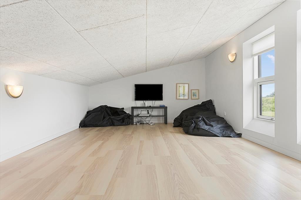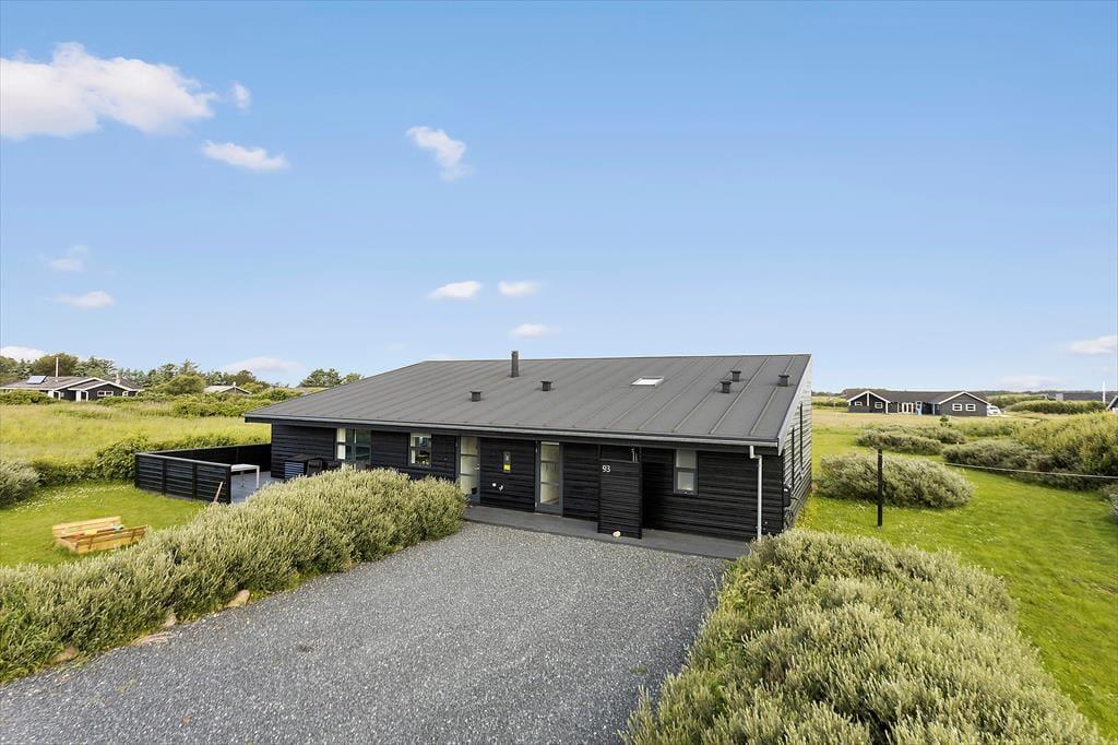 Det 125 m2 store sommerhus præsenterer sig på flot og indbydende vis med sortmalet træfacade, store vinduer og tag med ensidigt fald. Inden døre er hvid en gennemgående farve i indretningen, og der er en let og luftig atmosfære – ikke mindst i stuen, hvor dagslyset kan strømme ind fra tre verdenshjørner, og der er åben forbindelse til det veludstyrede køkken. En brændeovn står klar, hvis du får lyst til at sprede varme og ekstra hyggestemning om aftenen, og mens nogle i familien vil læse, spille brætspil eller snakke, kan legebørnene gå op på hemsen for at game og slænge sig i sækkestolene. En fredfyldt pause i spabadet kan der selvfølgelig også blive tid til, inden det er tid til at gå til ro på husets fire flotte soveværelser.