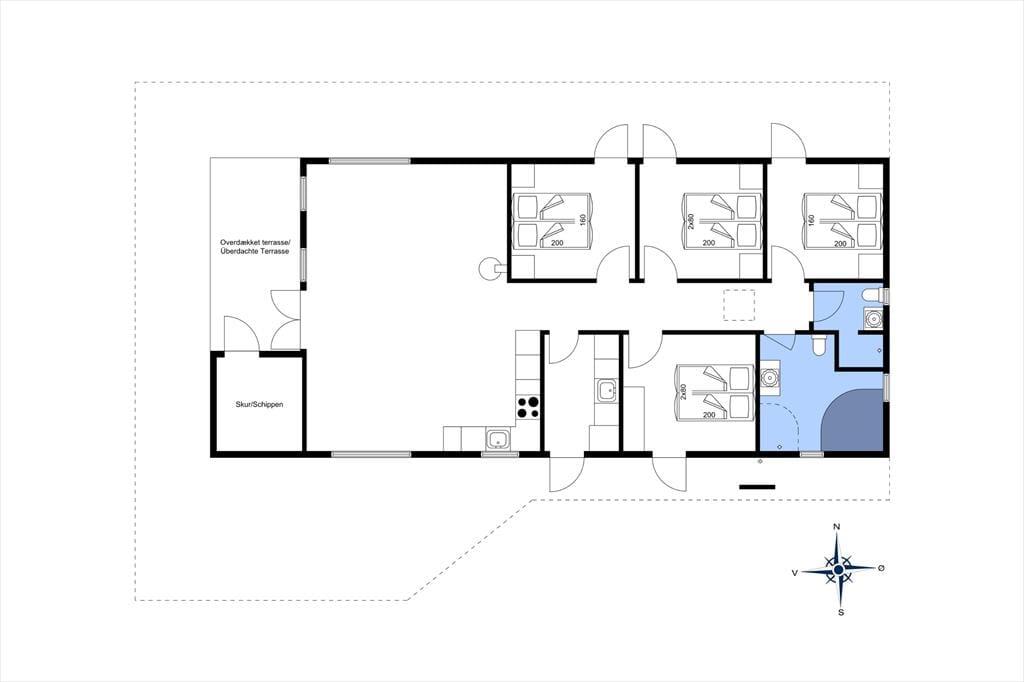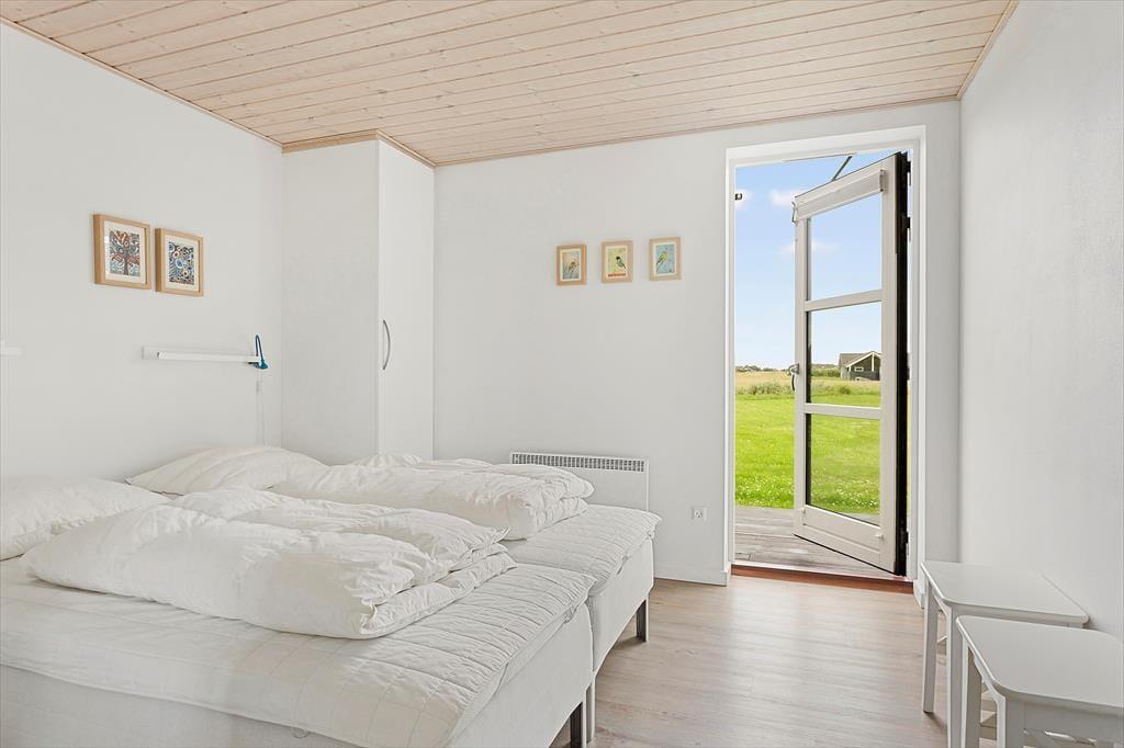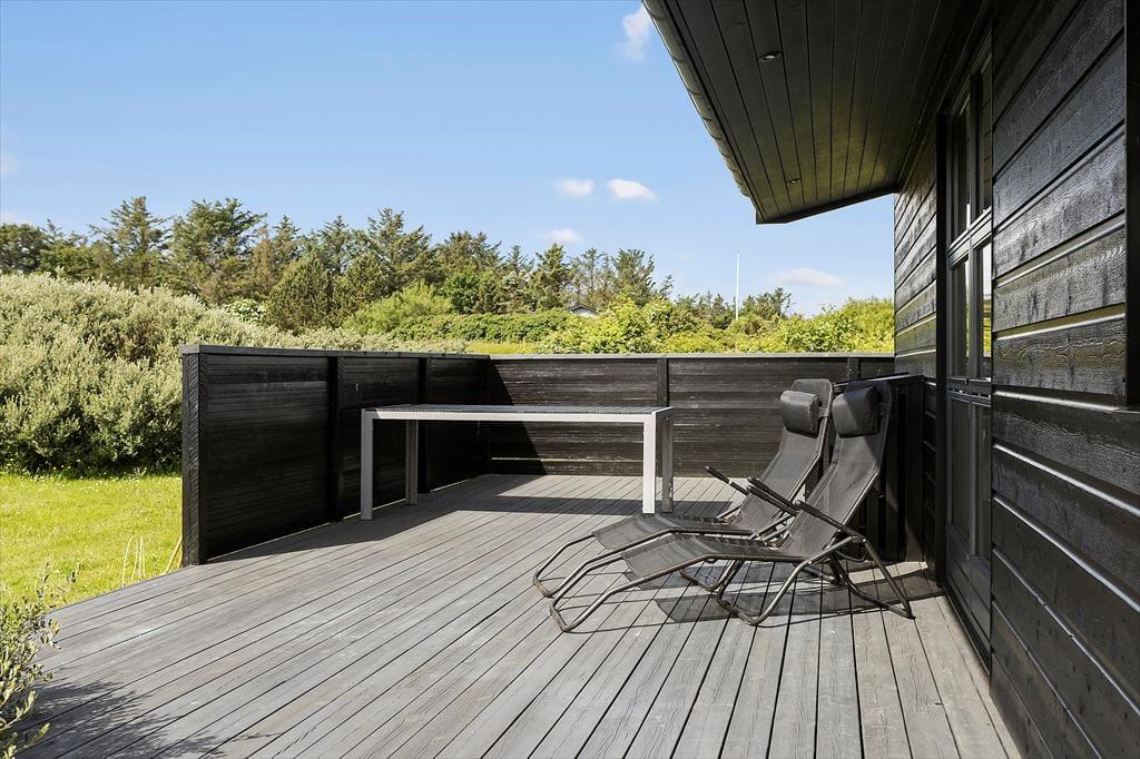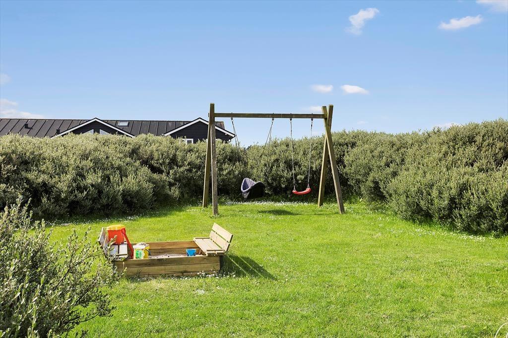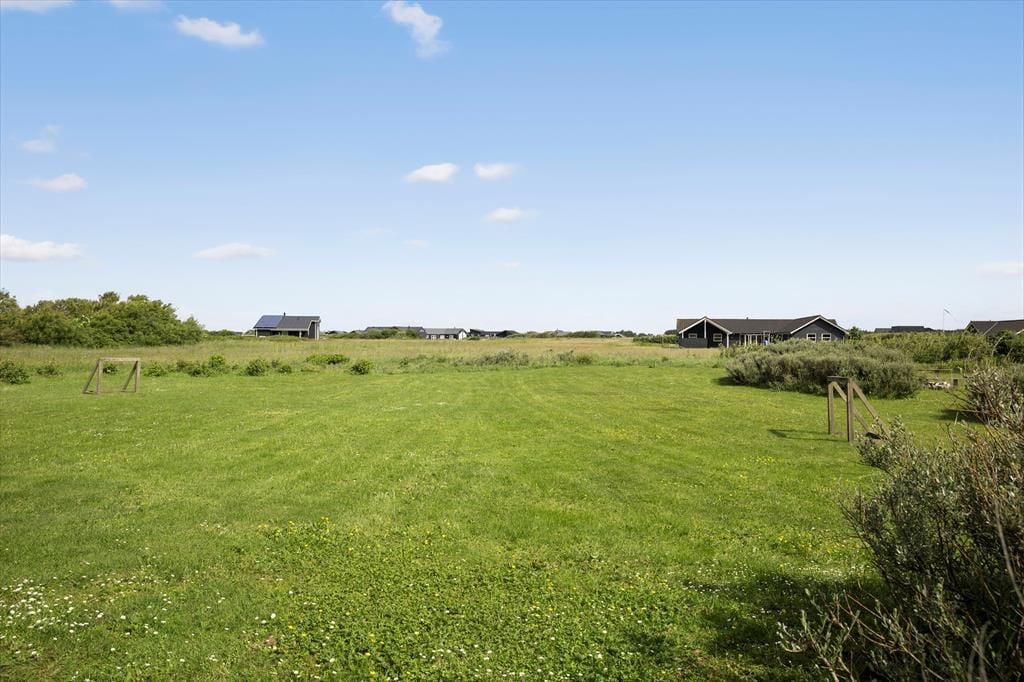 Ikke bare fra stuen, men også fra alle soveværelser er der direkte adgang til terrassen, så på en stille sommermorgen kan du passende starte med at strække kroppen i en solstråle. Du kan også tage dagens første kop kaffe med ud i det fri, og hvis du vil dække op til frokost under parasollen eller tilberede aftensmaden på grillen, kan det sagtens lade sig gøre. Derudover er naturgrunden noget af et eldorado for feriegæster i alle aldre, for der er gynger og sandkasse i et lille, hyggeligt hjørne, og på den store græsplæne er der fodboldmål, hvor hele familien kan vise, hvad de dur til med en bold. Har du fået sved på panden efter kampen, kan du blive frisket op under udebruseren, og når dagen går på hæld, kan du nyde den nærmest magiske ro ved bålstedet.