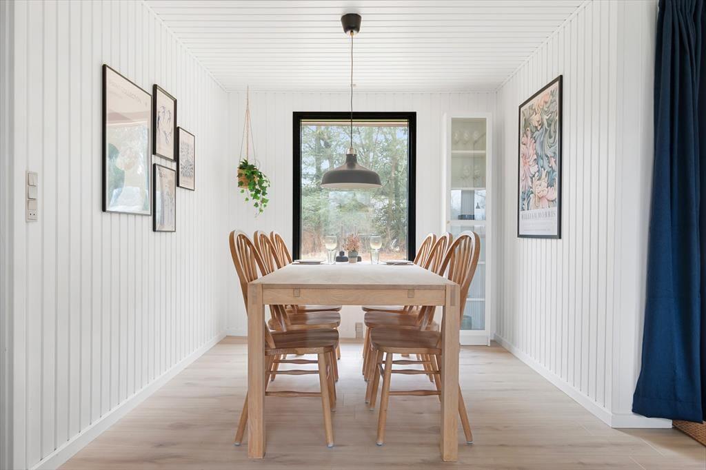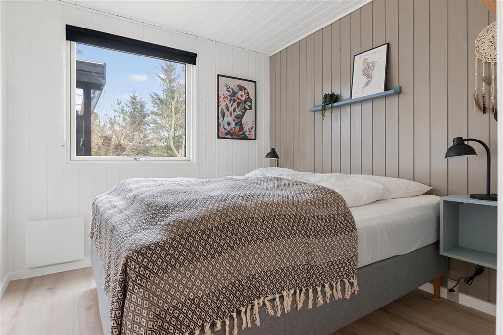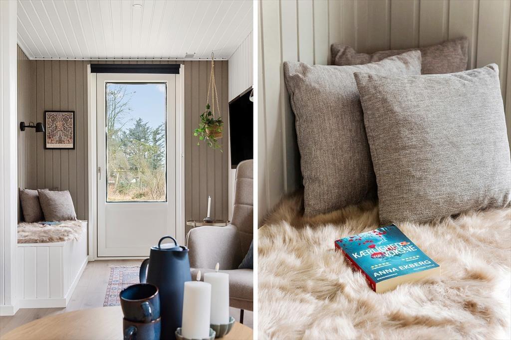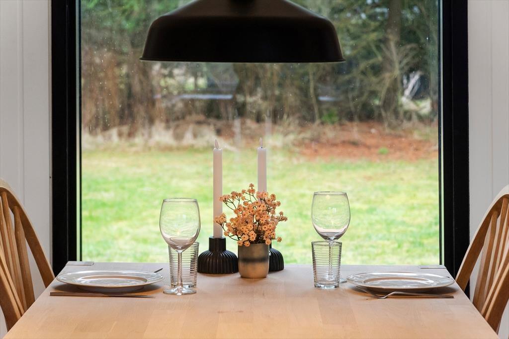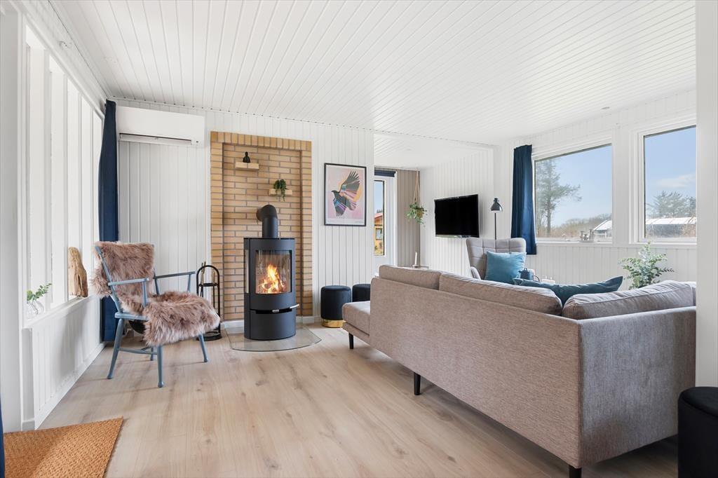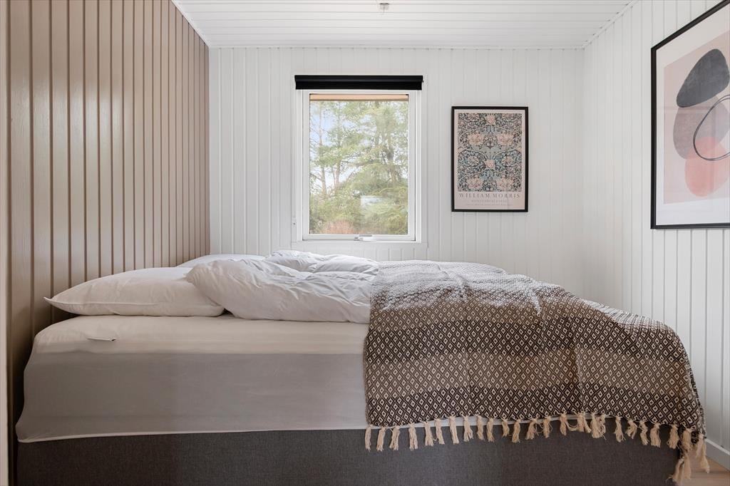 Når du træder indenfor, mødes du af et lyst og åbent rum, der indbyder til afslapning. Sommerhuset har en funktionel planløsning med tre rummelige værelser, der giver plads til op til seks personer. Det store badeværelse er både moderne og komfortabelt, og det er et skønt sted at starte eller afslutte dagen med et varmt bad. Køkkenet er veludstyret og delvist åbent mod stuen, så du kan nyde hyggelige samtaler med familien, mens du forbereder måltider. Fra stuen er der udsigt til den rolige have, og det lyse interiør gør, at der altid er masser af naturligt lys i huset – en perfekt ramme for feriedage fyldt med hygge.