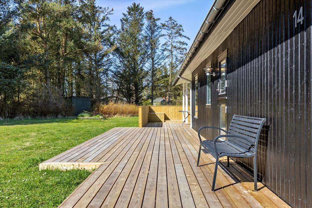 Udendørs venter der et dejligt ugenert område, hvor du kan nyde solen på den store, nyopførte terrasse. Her er rigeligt med plads til afslapning på solrige dage, og der er både skygge og sol, så alle kan finde deres egen favoritplads. Hvis du er til grillhygge, er der også plads til at tilberede lækre måltider udendørs, mens du nyder den friske luft. Huset har desuden en stor have, så børn kan boltre sig frit og trygt. Det er en perfekt oase for både ro og leg.