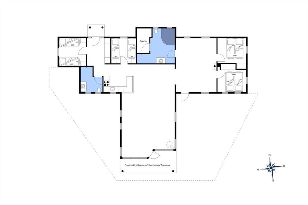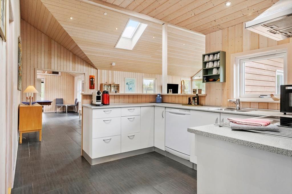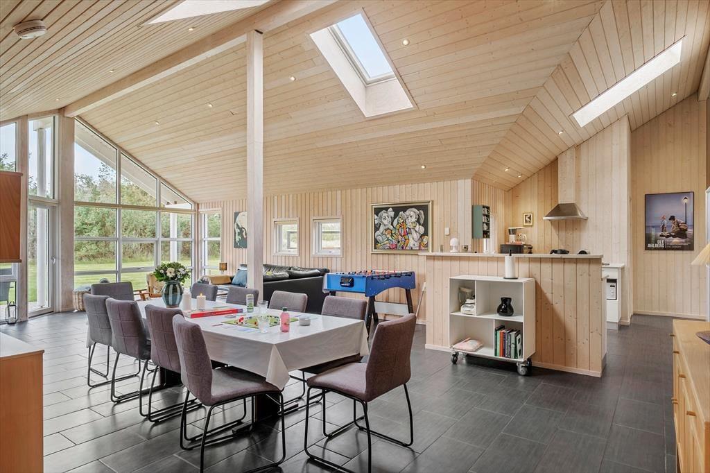 Sommerhuset er indrettet med plads til, at alle kan finde sig godt til rette – uanset om I er flere generationer afsted eller en gruppe venner, der holder ferie sammen. Det store hjerte i huset er aktivitetsrummet, hvor duften af nysavet træ og lyden af klaskende bordtennisbolde hurtigt skaber livlig stemning. Her kan I dyste i pool, bordfodbold eller bordtennis, mens grin og latter fylder rummet. Når I trænger til ro, venter wellnessafdelingen med både spa og sauna, hvor I kan synke ned i det varme vand eller mærke varmen brede sig i kroppen efter en lang gåtur ved havet. Køkken og stue hænger naturligt sammen, så madlavning og samvær går hånd i hånd, og efter middagen kan aftenen fortsætte med film, brætspil eller en stille stund med en god bog.