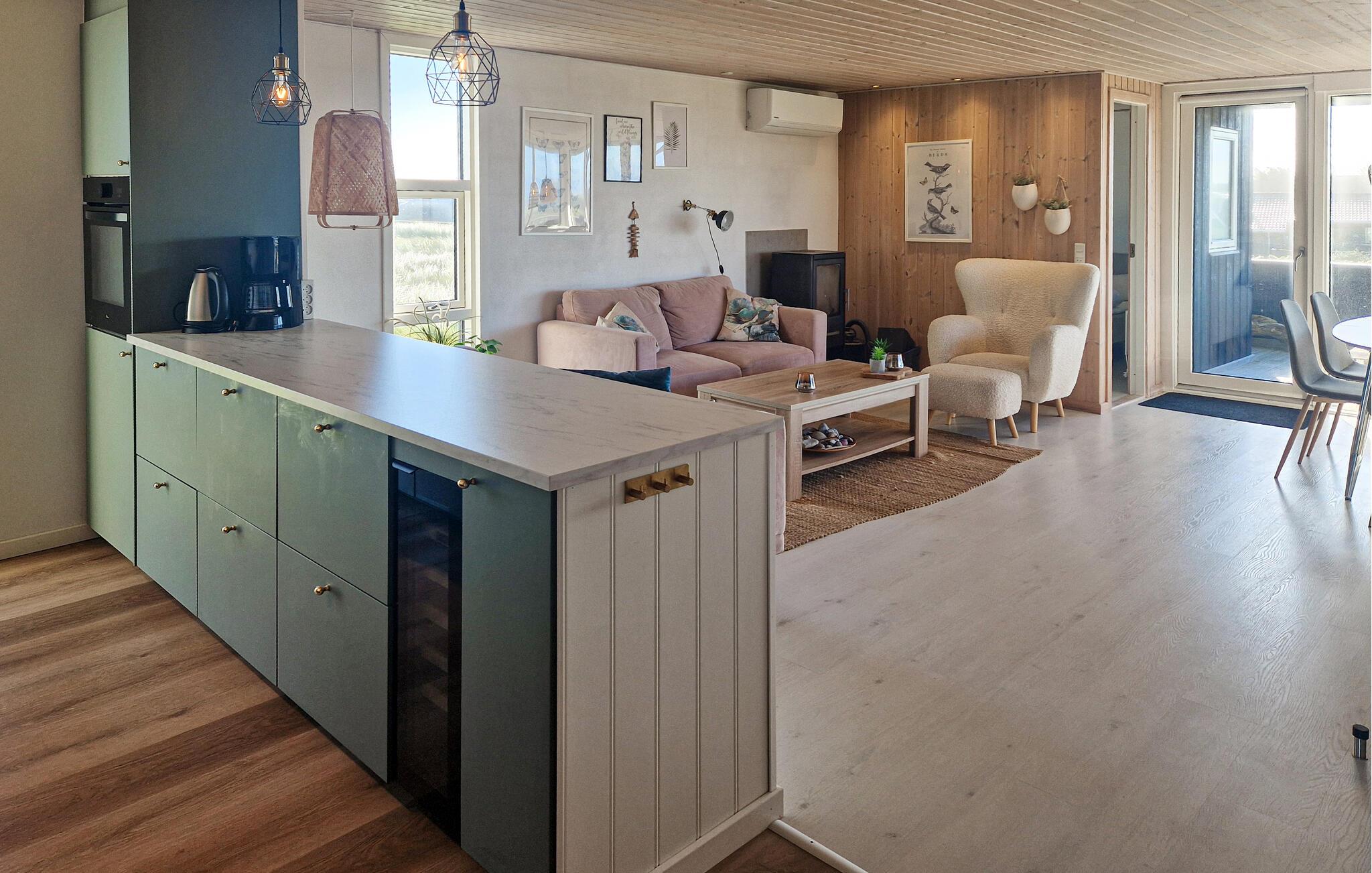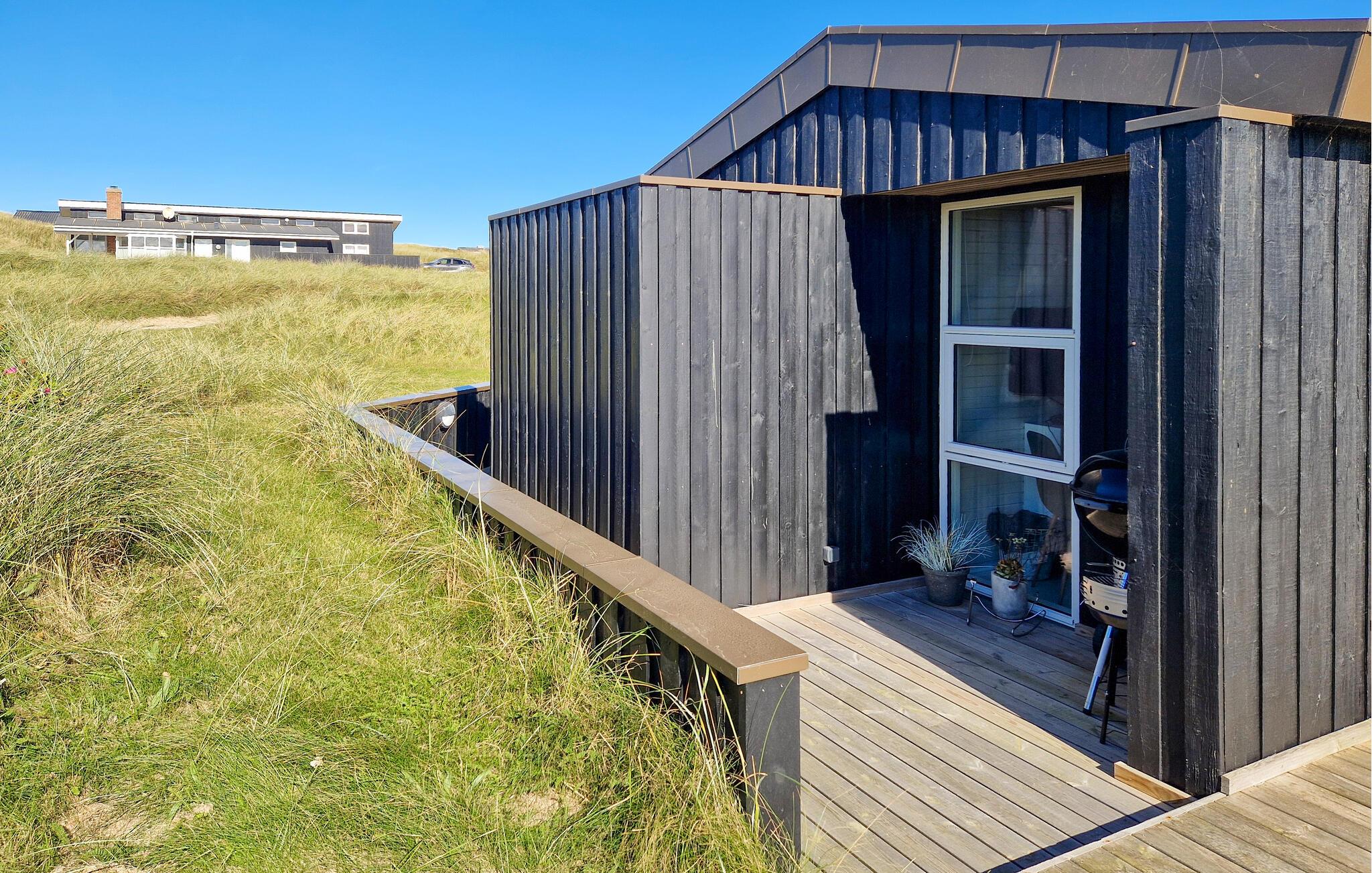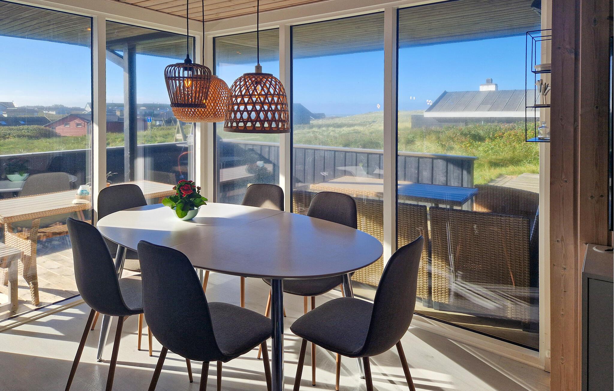 Jeres feriehus er det ideelle sted at kombinere fred, natur og komfort. Beliggende i det nordjyske klitlandskab blander det moderne boligkomfort med skandinavisk hygge. Find jer til rette i de stilfulde sofaer i stuen. Lad blikket vandre gennem de store panoramavinduer og nyd det naturlige lys, der strømmer ind i rummet. Tænd brændeovnen, læs en bog i den behagelige lænestol eller se en film sammen på det store fjernsyn. Tilbered jeres måltider i det moderne køkken og nyd dem derefter ved spisebordet med udsigt over klitterne. Om aftenen kan I slappe af i spabadet eller saunaen og mærke den travle hverdag forsvinde.