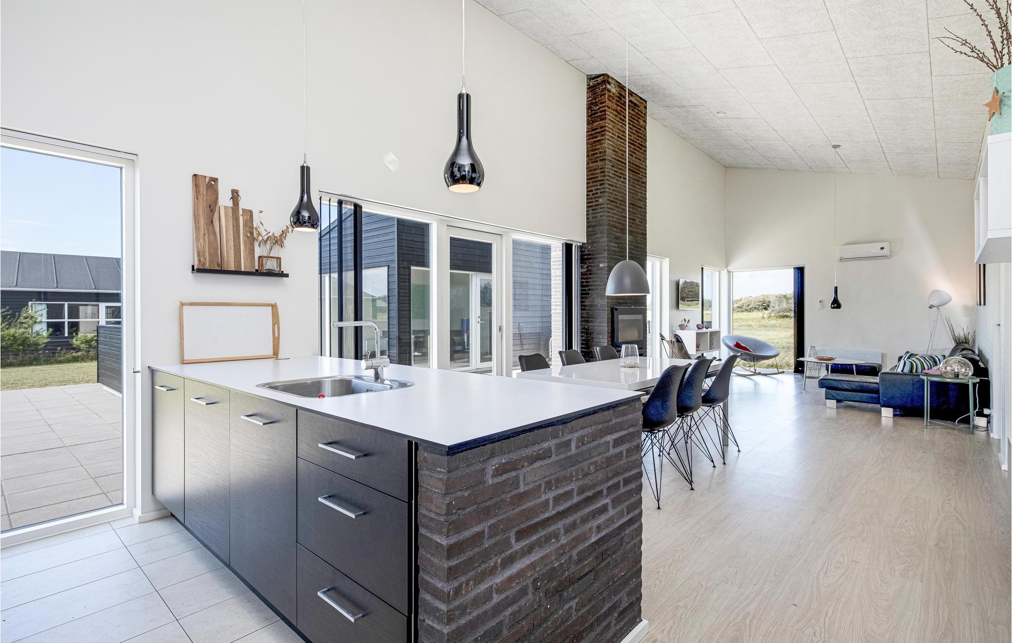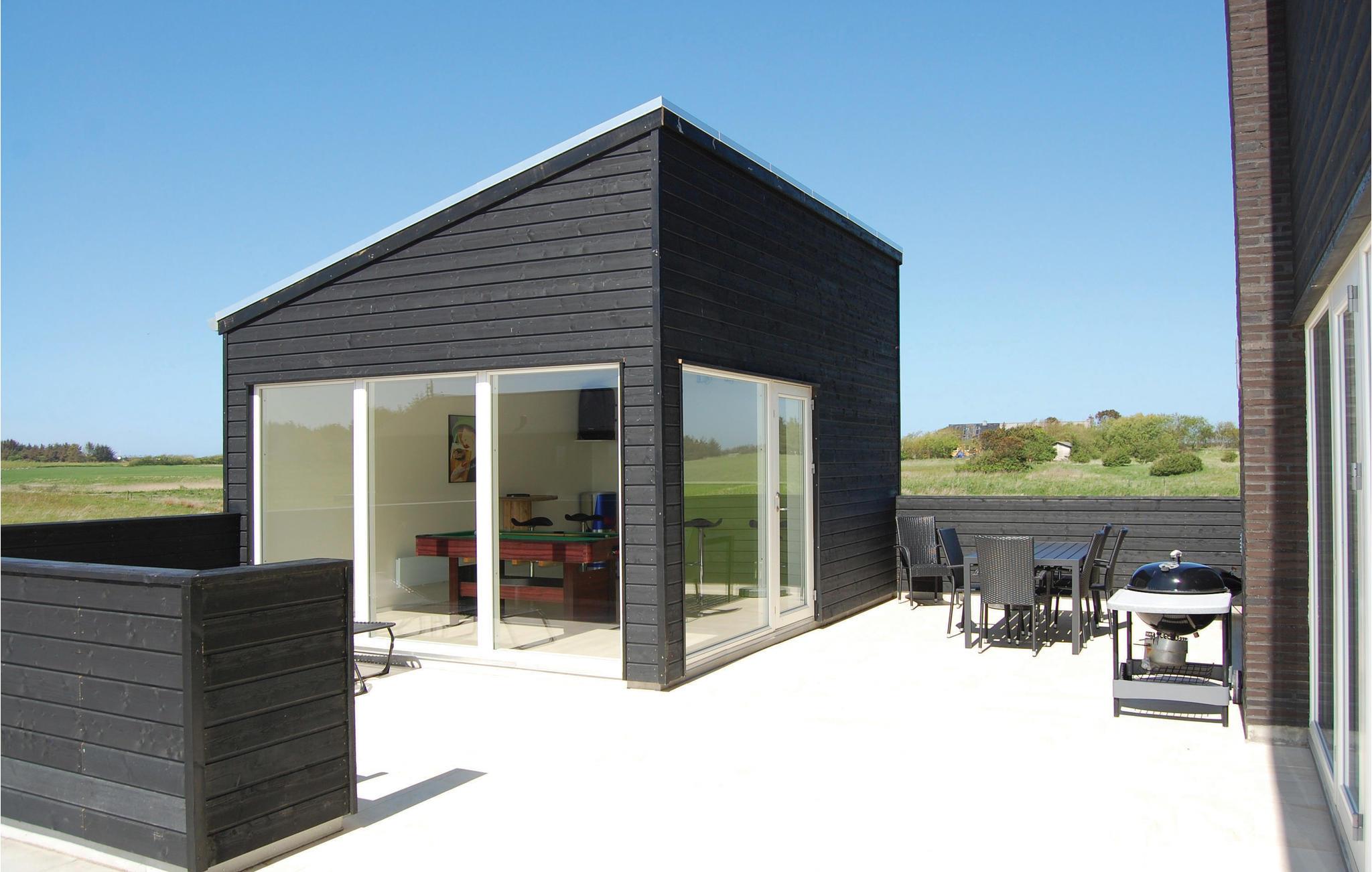 På en åben naturgrund i Nr. Lyngby nord for Løkken, ligger dette sommerhus med tilhørende separat bygning, hvor der er lavet et flot aktivitetsrum. I huset er der store vinduespartier, det er rummeligt og har hvidmalede vægge, der tilsammen gør huset utroligt lyst og indbydende. Her findes en flot stue med afstemt møblering og en muret pejs til varme og hygge. Køkkenet er yderst veludstyret, og ligger i åben forbindelse med den dejlige stue. Endvidere 2 meget flotte badeværelser i samme stil - det ene stort med dobbeltbruser og lækkert 2 personers spabad. I alle rum er der enten klinke- eller trægulve. Med adgang fra terrassen ligger den separate bygning med billardbord, musikanlæg og dartspil.