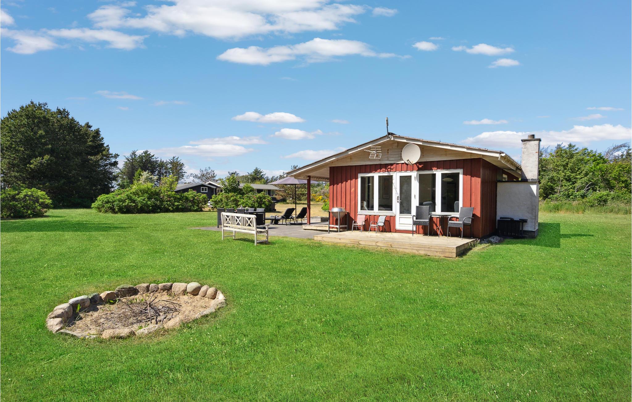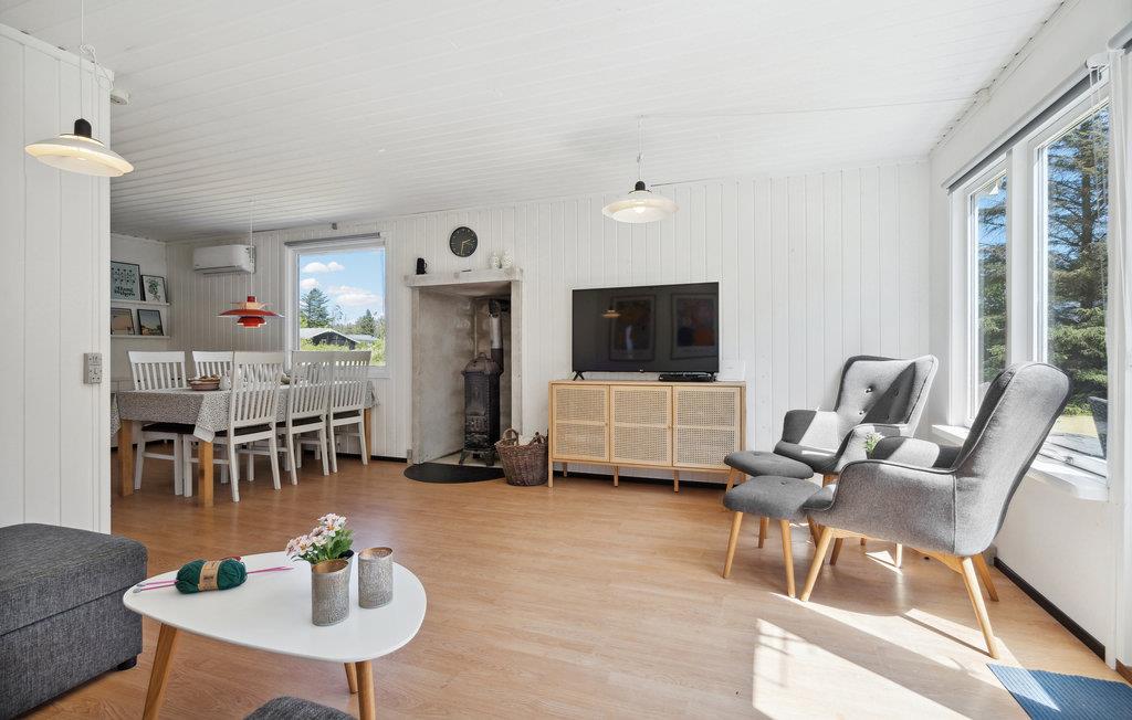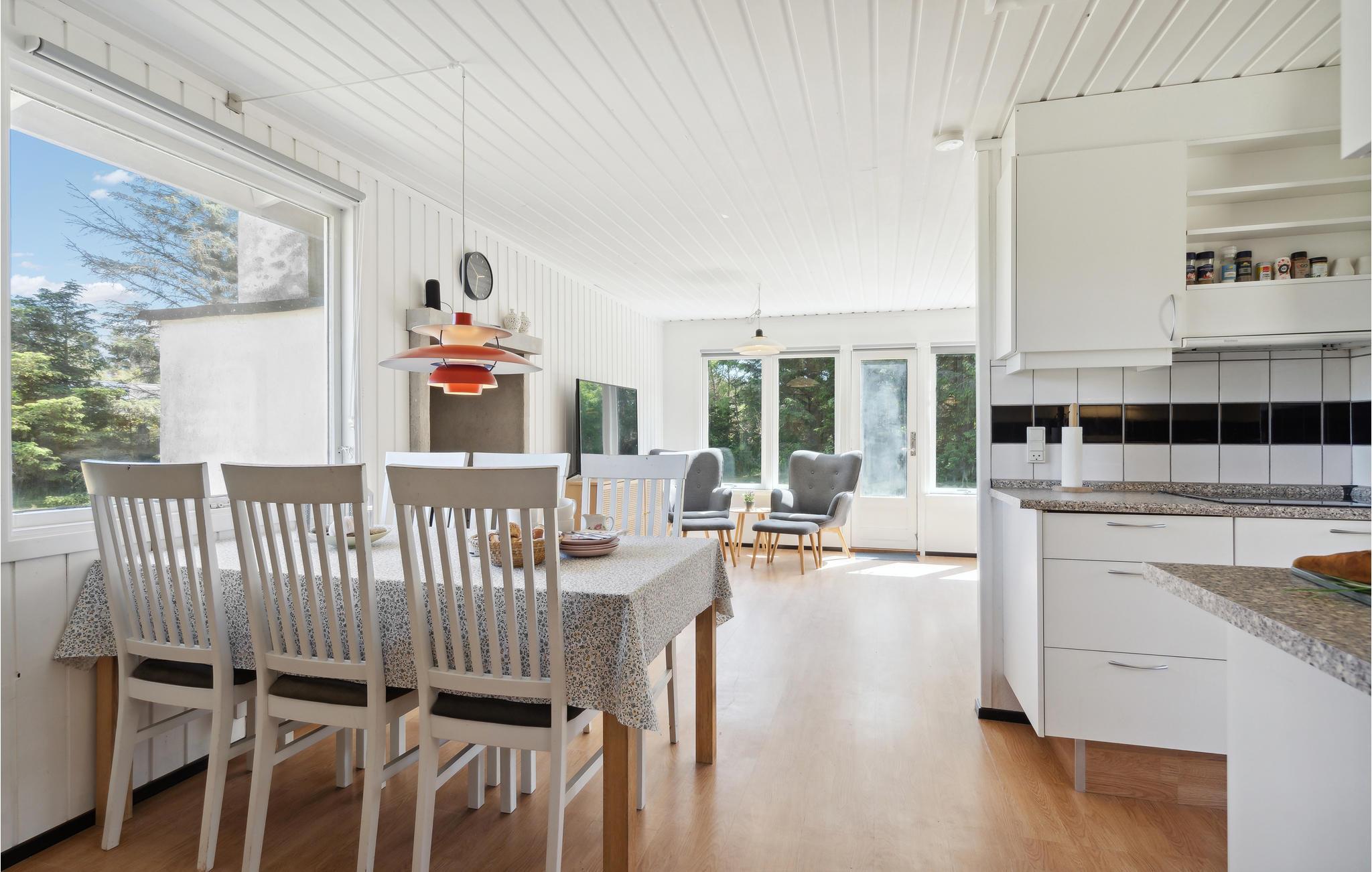 Dette sommerhus i Nr Lyngby byder på ro og afslapning nær Danmarks smukkeste strande. Med sin enkle, funktionelle indretning er huset ideelt for familier eller par, der leder efter et afslappende ophold. Husets hjerte er den lyse stue med store vinduespartier, der giver en smuk udsigt over det grønne. Find jer godt til rette på de komfortable lænestole eller i sofahjørnet og nyd afslappende timer foran fjernsynet. Den åbne spiseplads støder op til køkkenet, som har praktiske arbejdsflader og moderne hårde hvidevarer. Her kan I tilberede jeres måltider i fred og ro.
