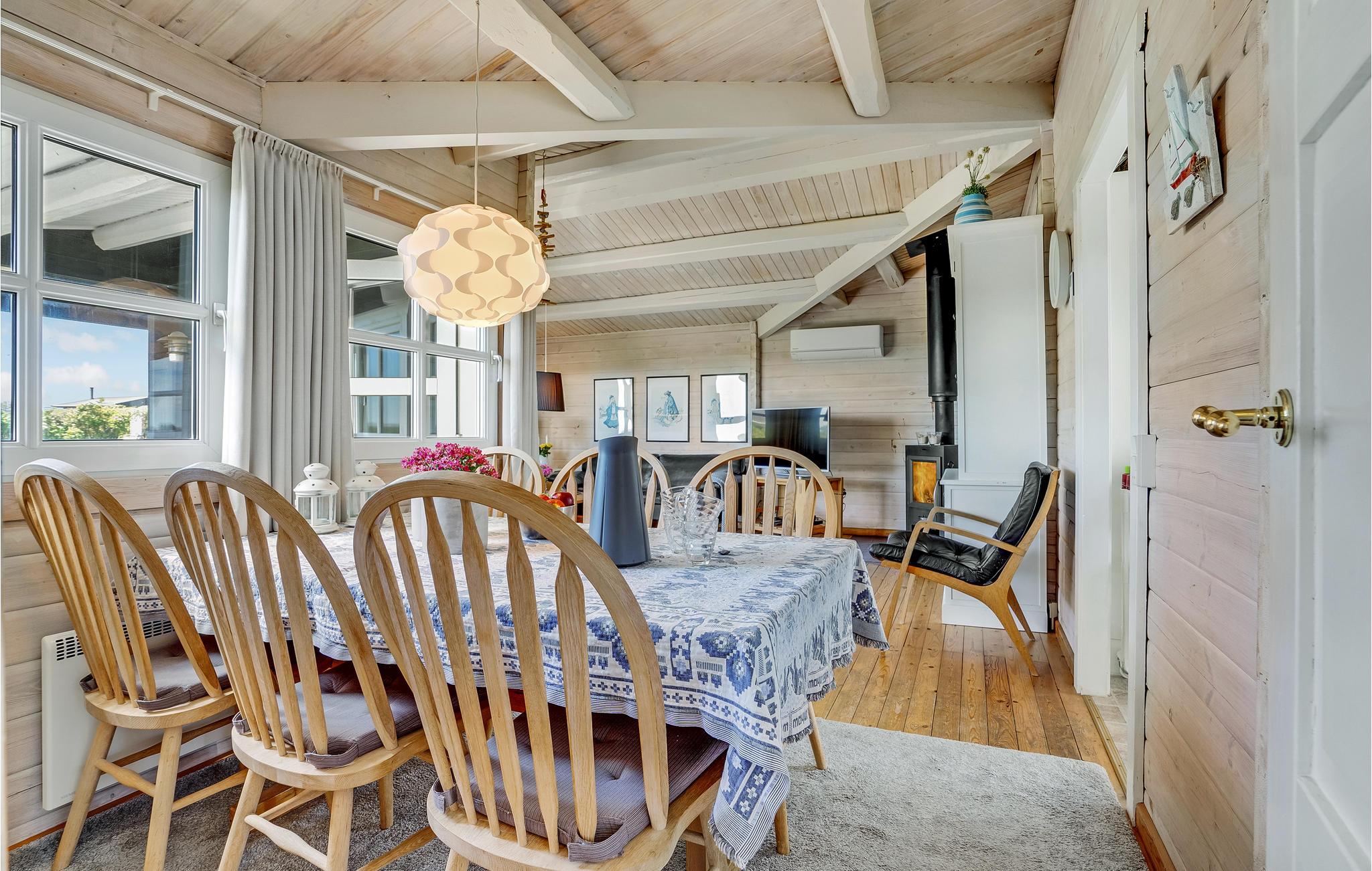 Der er udsigt til åbne arealer og det altid betagende Vesterhav fra dette velholdte bjælkehus, der er lyst og hyggeligt møbleret. Nyd livet på terrassen der er afskærmet af huset på to sider, så her er dejligt læ. Sid under den overdækkede del også længe efter duggen og mørket er faldet er faldet. Til børnene er der gynge og sandkasse til mange timers leg og god plads til boldspil og andre sjove udendørs aktiviteter. Løkken er en af de mest klassiske badebyer ved vestkysten, med sine hvide badehuset ved den brede sandstrand, hvor I kan køre helt ud til vandet. Her er fiskerbåde hvor I kan købe pivfrisk fisk, de karakteristiske bunkere og en frisk vind, som både windsurfere, paraglidere og jer der vil sætte en drage op, sætter pris på.