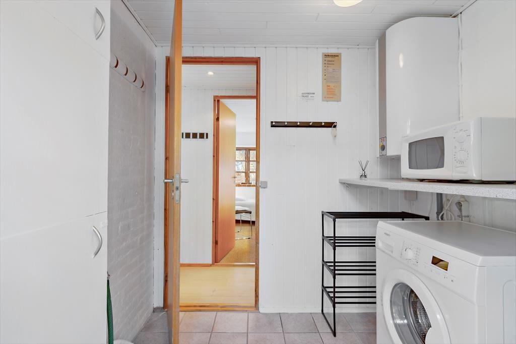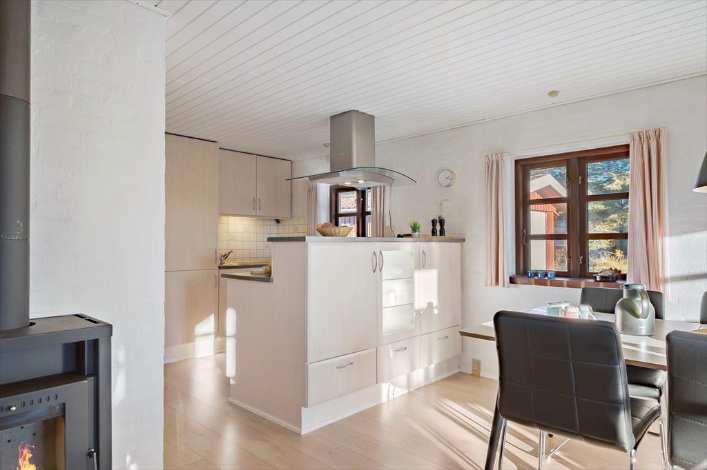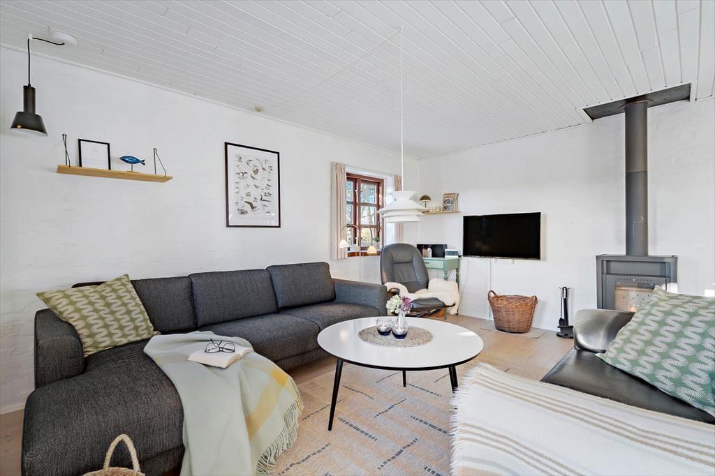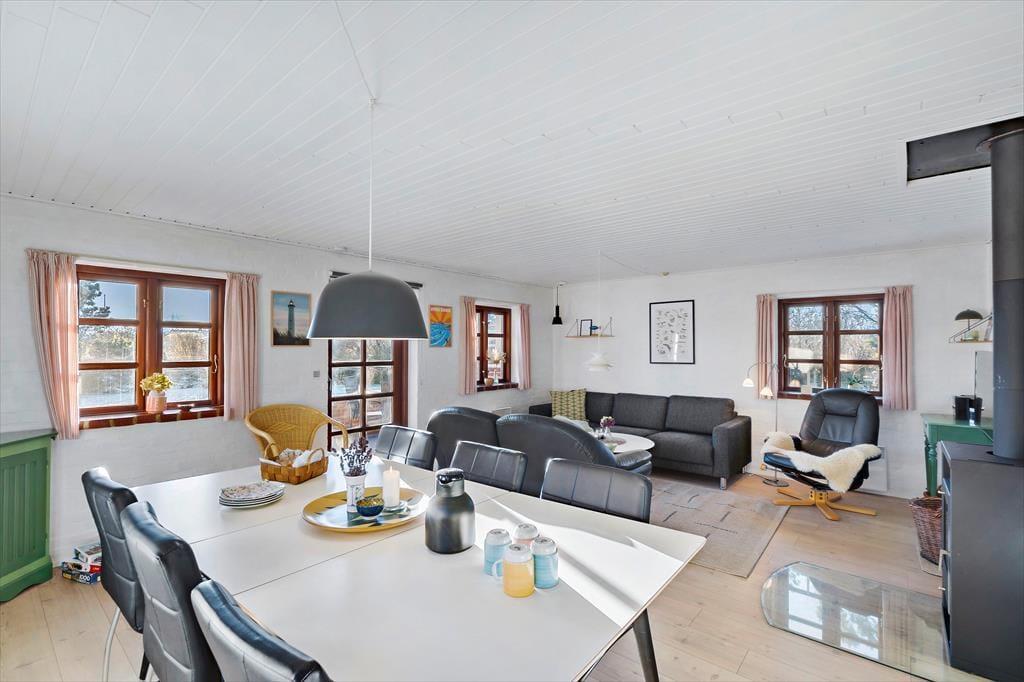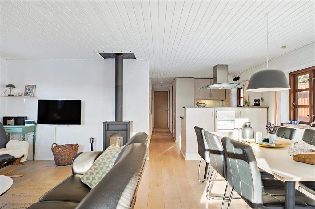 Feriehuset er lyst og luftigt, og her får I en behagelig ramme om fridagene. De seks sengepladser er fordelt på tre soveværelser, der er placeret i samme del af huset som badeværelset og bryggerset. Badeværelset er indrettet med gulvvarme og bruseniche, mens der i bryggerset er vaskemaskine, så I altid har friskt tøj klar. Resten af huset består af et stort, åbent opholdsområde, hvor der et et mindre, men funktionelt køkken og stuen ligger i åben forbindelse med køkkenet, og her har I masser af plads til at nyde feriedagene sammen. Stuen er indrettet med et spisebord og et sofaarrangement, og I har god plads til at slappe af med lækre måltider, hyggelige filmaftener eller eftermiddage med boller, varm te og en god bog, mens ilden knitrer i brændeovnen.