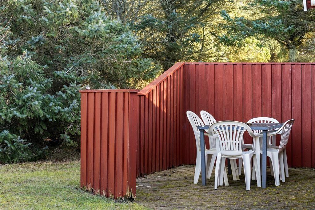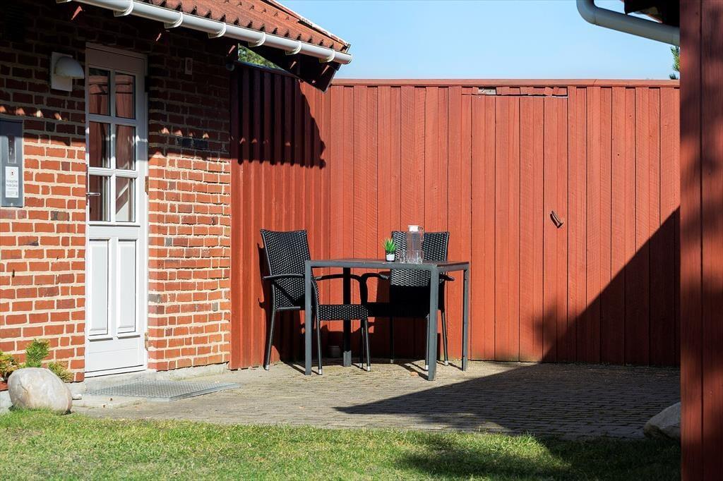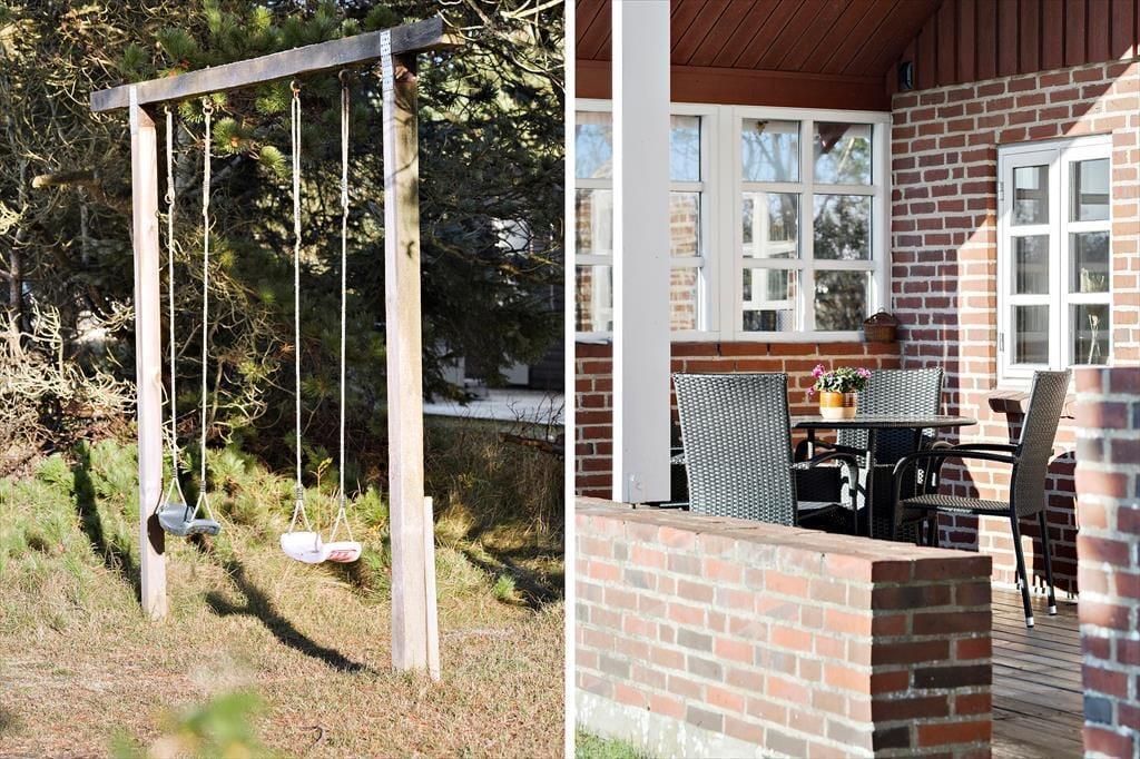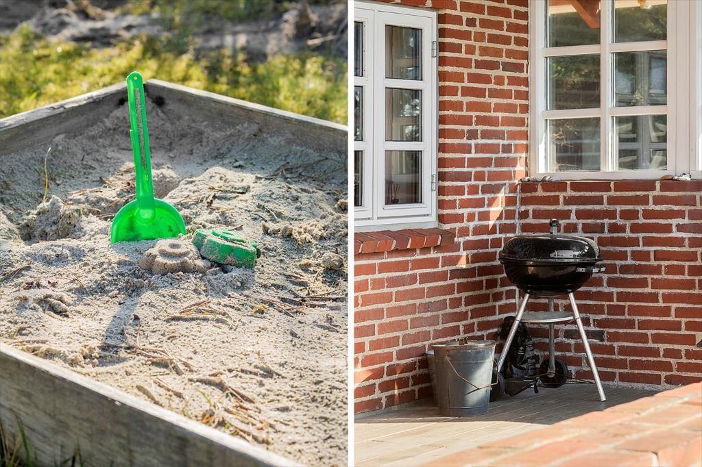 I de lune måneder er det oplagt at åbne op til den sydvendte terrasse og lade inde og ude smelte sammen. Terrassen er overdækket og afskærmet mod øst og vest, så I kan finde læ for vinden og ly, hvis en byge trækker forbi. Åbningen mod syd lukker dagens sol ind på terrassen, og her har I det oplagte sted at servere dagens måltider i det fri. På den tilstødende græsplæne kan familiens yngste lege, gynge og spille bold. Mellem huset og skuret findes yderligere en terrasse, der er godt afskærmet og solrig det meste af dagen.