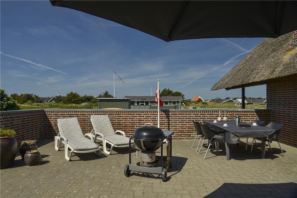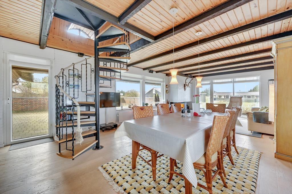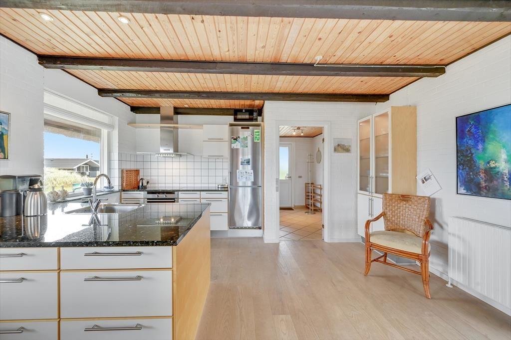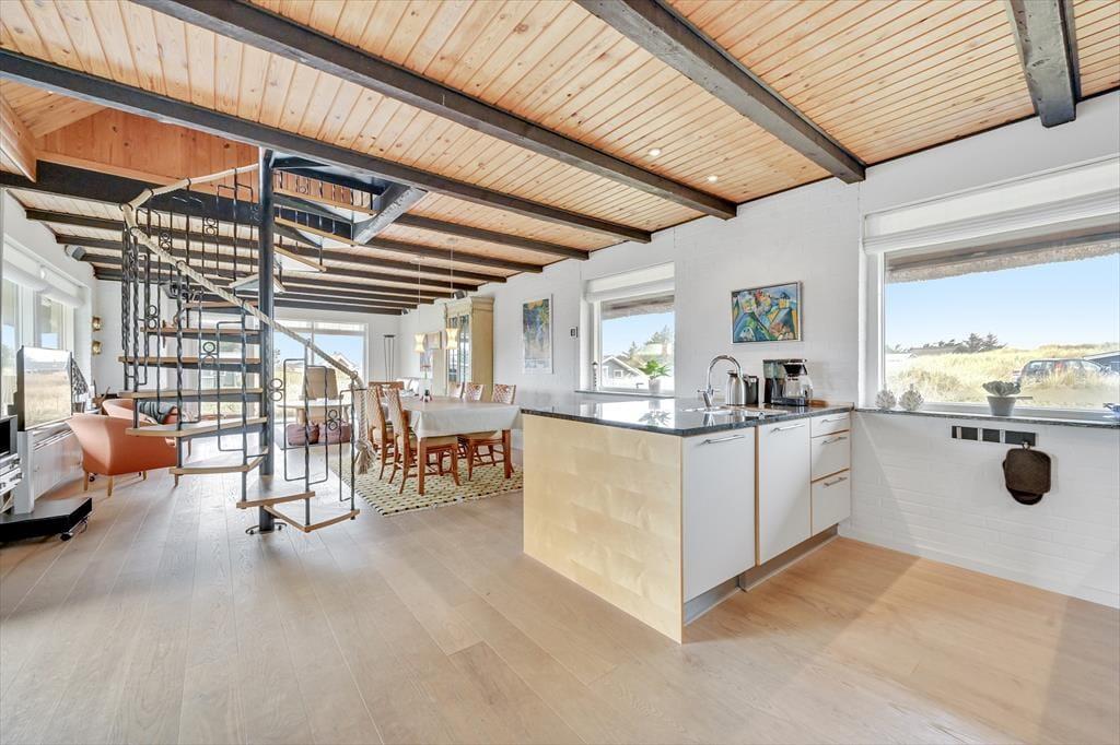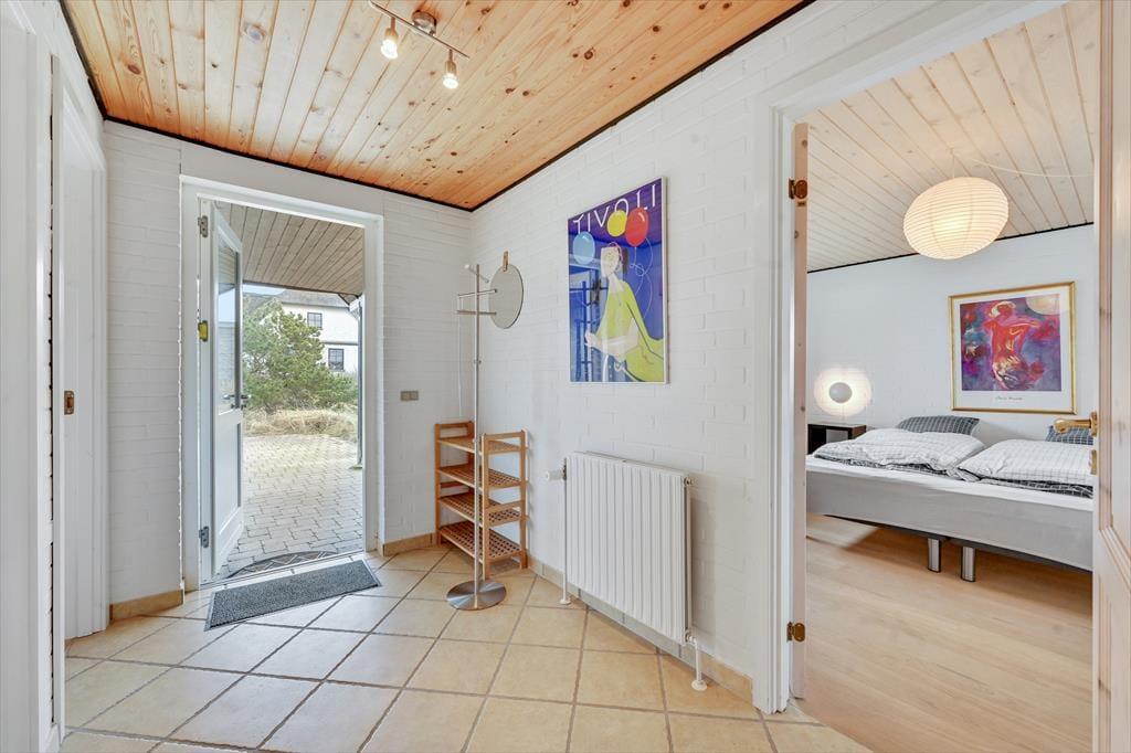 Huset der har plads til 6 personer, er indrettet med en stor og lys entre med klinkegulv og god plads til sko og overtøj. Dejligt, lyst og veludstyret nyere køkken, med åben forbindelse til den hyggelige og rummelige spise-/ opholdsstue, med spisebords-møblement, og en dejlig komfortabel sofagruppe. Her kan ilden og varmen fra den indbyggede pejs rigtig nydes efter en gåtur vedfjorden. I stuen er der desuden stort 40" fladskærms-tv med danske og tyske tv-kanaler. Fra stuen er der adgang til en stor og dejlig lukket syd/vestvendt terrasse, hvoraf en del er overdækket. Desuden er der en overdækket terrasse mod vest samt delvis overdækket mod øst, så både morgen- og aftensol kan nydes i læ for vinden. På terrassen er der gode havemøbler, grill og liggestole til rådighed. Fra køkkenet og spisestuen, kan den skønne udsigt til Ringkøbing Fjord nydes, mens maden tilberedes. Der er i alt 3 soveværelser, to i stueplan, og et værelse ovenpå. Soveværelserne i stuetagen har begge en dobbeltseng. Soveværelset ovenpå, kommer I til, via spindeltrappen fra stuen. Her er der to enkeltsenge. Loftshøjden på 1.sal er kun ca. 1,90 m., og derfor ikke velegnet til voksne. Lækkert og vel indrettet badeværelse med lyse fliser, klinkegulv med gulvvarme, bruseniche og toilet. Der er rengøringsvenlige trægulve i stue, køkken og værelserne, samt klinkegulve i entre og badeværelse. Huset opvarmes med centralvarme. Sammenbygget med huset findes et fint udhus, hvor vaskemaskinen er placeret. Barnestol og puslebord er også til rådighed på 1. sal.