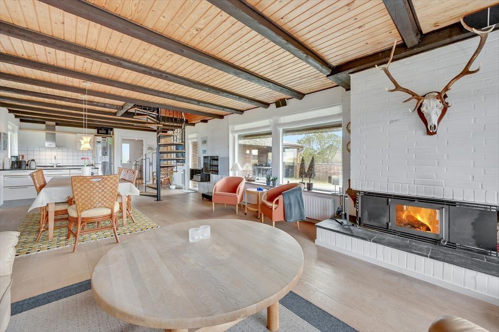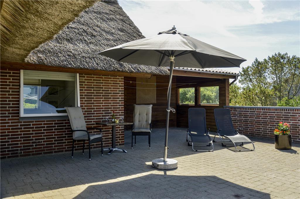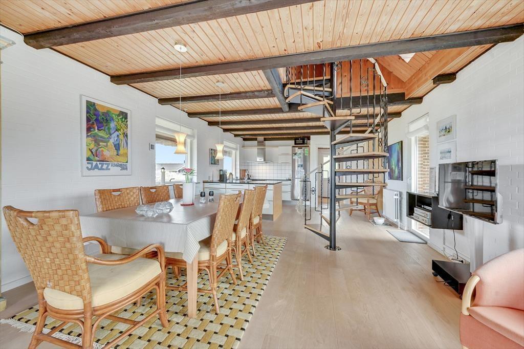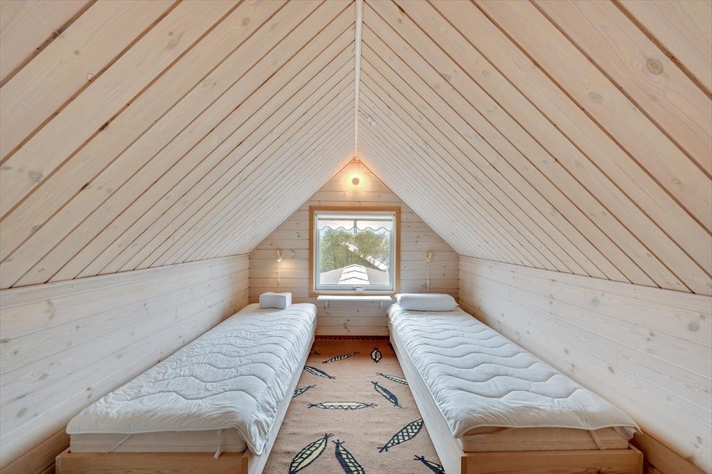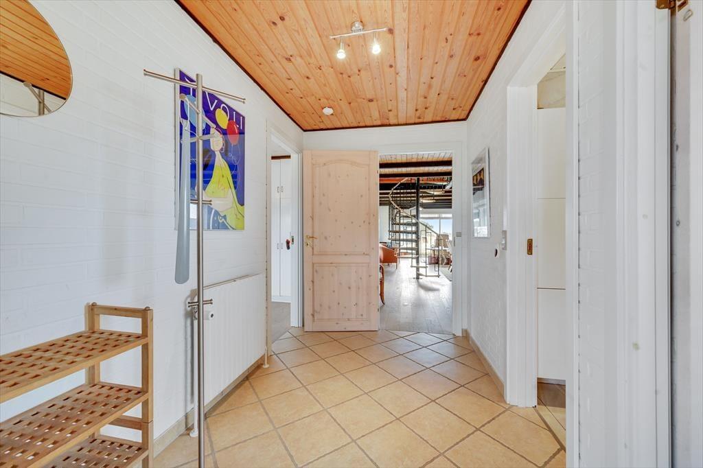 Huset der har plads til 6 personer, er indrettet med en stor og lys entre med klinkegulv og god plads til sko og overtøj. Dejligt, lyst og veludstyret nyere køkken, med åben forbindelse til den hyggelige og rummelige spise-/ opholdsstue, med spisebords-møblement, og en dejlig komfortabel sofagruppe. Her kan ilden og varmen fra den indbyggede pejs rigtig nydes efter en gåtur vedfjorden. I stuen er der desuden stort 40" fladskærms-tv med danske og tyske tv-kanaler. Fra stuen er der adgang til en stor og dejlig lukket syd/vestvendt terrasse, hvoraf en del er overdækket. Desuden er der en overdækket terrasse mod vest samt delvis overdækket mod øst, så både morgen- og aftensol kan nydes i læ for vinden. På terrassen er der gode havemøbler, grill og liggestole til rådighed. Fra køkkenet og spisestuen, kan den skønne udsigt til Ringkøbing Fjord nydes, mens maden tilberedes. Der er i alt 3 soveværelser, to i stueplan, og et værelse ovenpå. Soveværelserne i stuetagen har begge en dobbeltseng. Soveværelset ovenpå, kommer I til, via spindeltrappen fra stuen. Her er der to enkeltsenge. Loftshøjden på 1.sal er kun ca. 1,90 m., og derfor ikke velegnet til voksne. Lækkert og vel indrettet badeværelse med lyse fliser, klinkegulv med gulvvarme, bruseniche og toilet. Der er rengøringsvenlige trægulve i stue, køkken og værelserne, samt klinkegulve i entre og badeværelse. Huset opvarmes med centralvarme. Sammenbygget med huset findes et fint udhus, hvor vaskemaskinen er placeret. Barnestol og puslebord er også til rådighed på 1. sal.