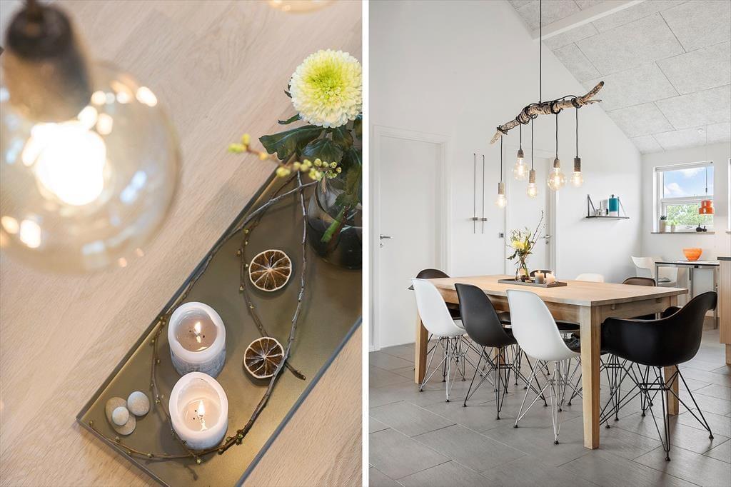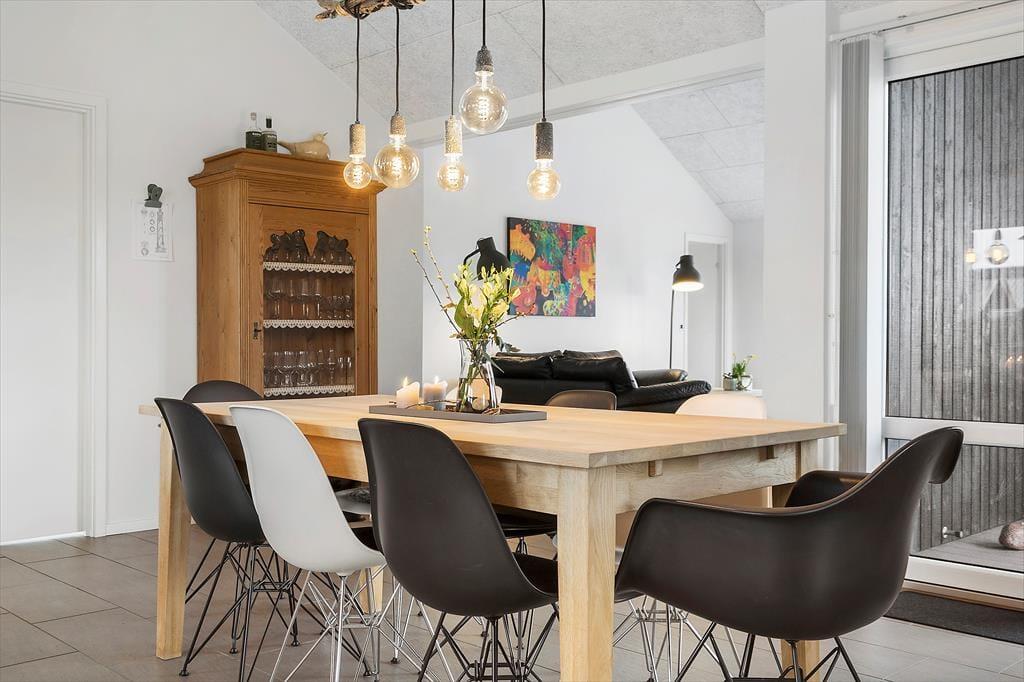 Med to badeværelser og tre soveværelser i selve sommerhuset og et ekstra soverum i annekset er det muligt at være otte personer – så hvis du gerne vil invitere bedsteforældrene med eller er ved at arrangere en ferie for to børnefamilier, kan det fint lade sig gøre. Feriens hyggestunder, der blandt andet kan byde på brætspil og varm kakao, boglæsning nær brændeovnen og langstrakte aftensmåltider med lækker mad og gode samtaler, kan oplagt foregå i husets store opholdsrum. Der er god plads til jer alle, og det både pæne og komfortable møblement skal nok sørge for, at I får det behageligt. I entréen finder du for øvrigt en fin detalje: Her hænger der nemlig et danmarkskort fra den gamle Nr. Lyngvig Skole, der tidligere lå her på grunden.