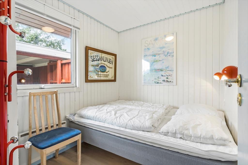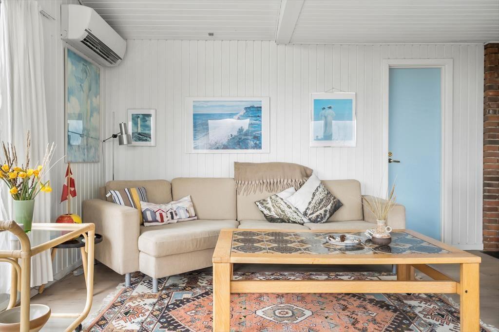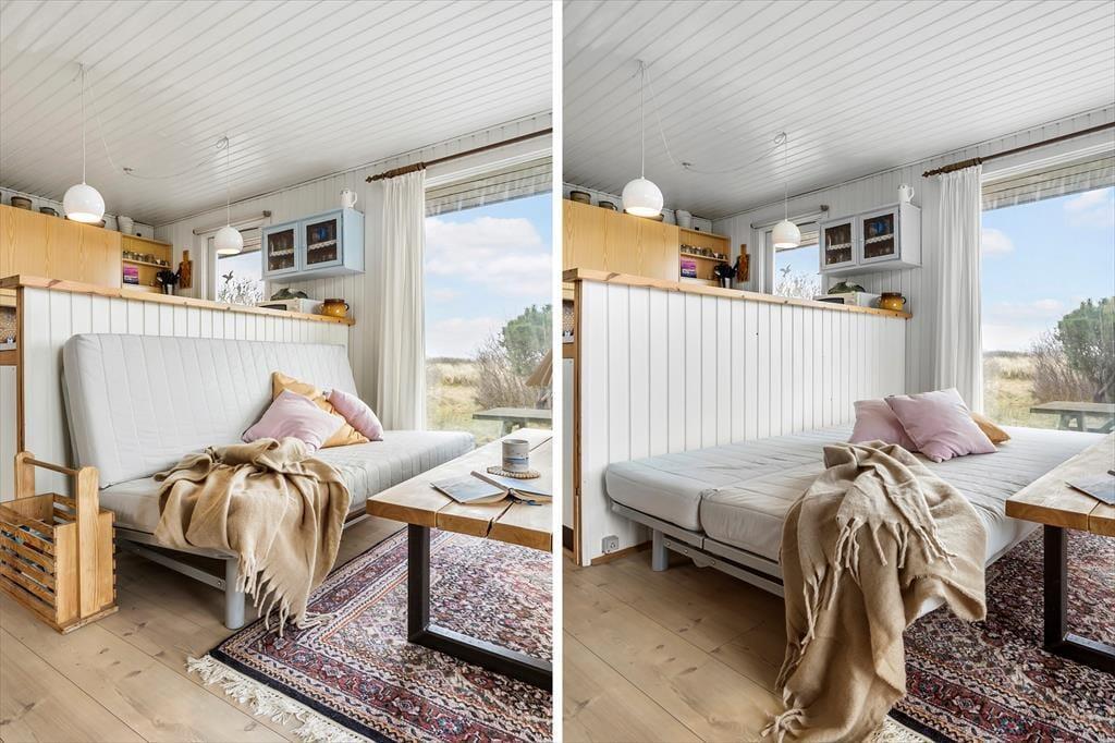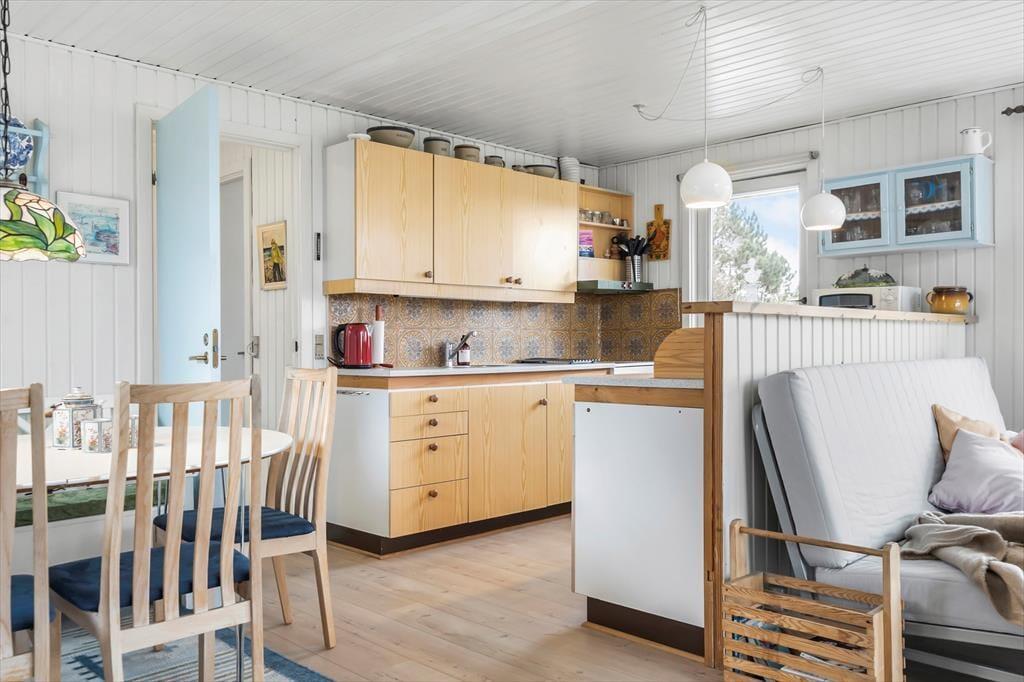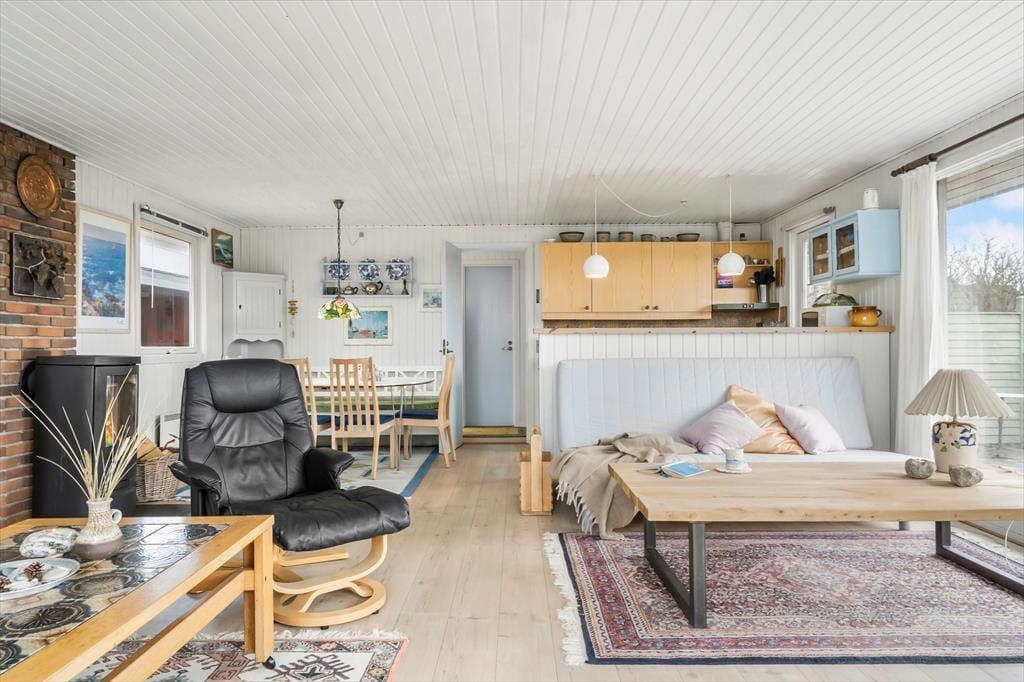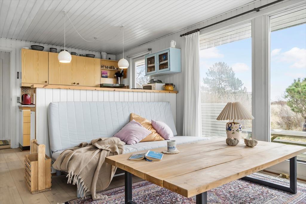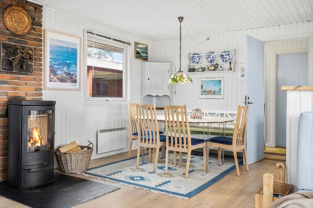 Med store vinduespartier, hvide vægge og pæne gulve er atmosfæren lys og indbydende inden døre i stuen. En hyggelig spiseplads er placeret lige ved det åbne køkken, så der er ikke mange skridt, hvis du vil hente mere kaffe for at fylde kopperne op under morgenmaden. Er det køligt i vejret, kan du tage varmepumpen i brug og tænde op i brændeovnen – hvis der er brænde i huset, må du for øvrigt gerne benytte dig af det – inden du sætter dig godt til rette i sofaen med en spændende bog eller en film på fladskærms-tv’et. Og med mindre du får lyst til at komme ud for at udforske Nr. Lyngvig og omegn, kan du blive siddende i timevis, indtil det er tid til at gå til ro på et af sommerhusets tre soveværelser.