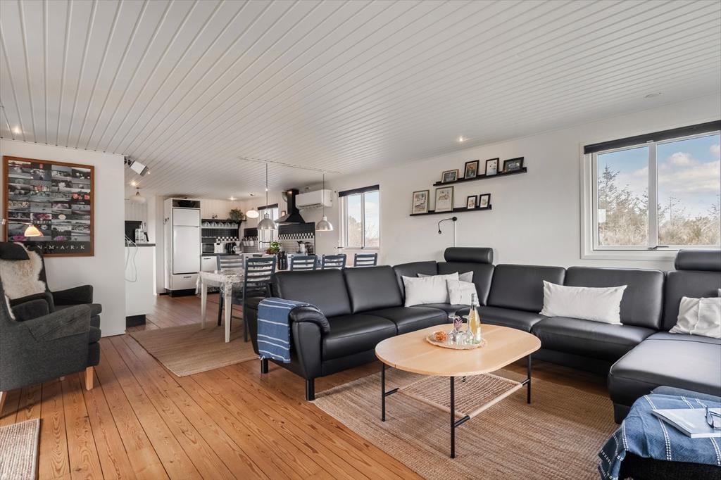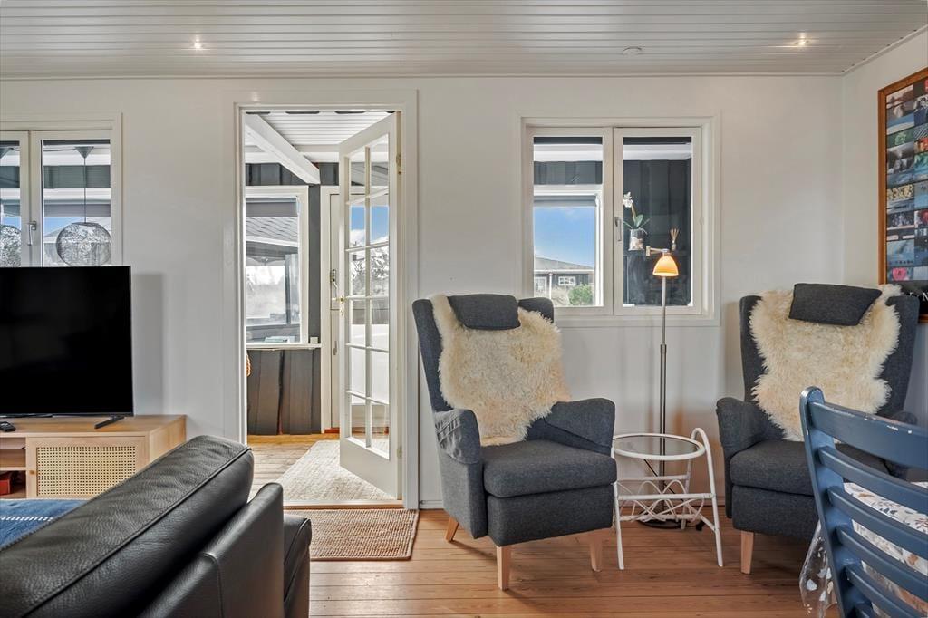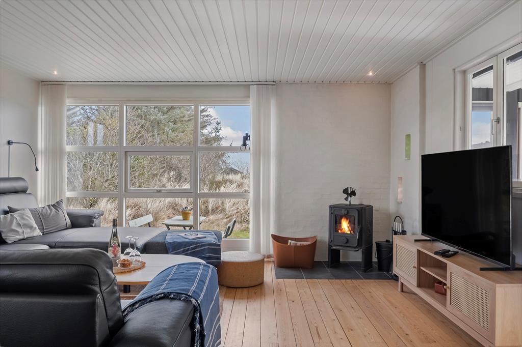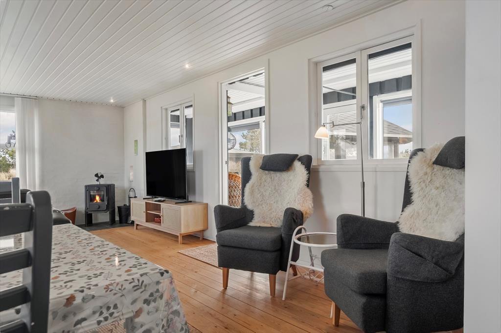 I kan sagtens holde ferie to børnefamilier sammen, for der er to soveværelser i annekset såvel som i selve sommerhuset. Der er også to badeværelser at gøre godt med, hvoraf sommerhusets er udskiftet i 2023, mens anneksets baderum har en praktisk pusleplads. Indretningen i de to bygninger giver jer mulighed for at få lidt privatliv, og samtidig har I god plads til at være sociale i sommerhusets store opholdsafdeling. Den består af køkken og stue i åben forbindelse, og fra stuen har I direkte adgang til en udestue, der er indrettet med spisebord og en hyggelig briks, der inviterer til en middagslur efter sommerfrokosten. I stuen har I udsigt til Ringkøbing Fjord gennem det store, østvendte gavlvindue, og med brændeovn og stort fladskærms-tv er der lagt op til mange gode hyggestunder. Når der skal laves mad, har I gode arbejdsforhold i det pæne og veludstyrede køkken.