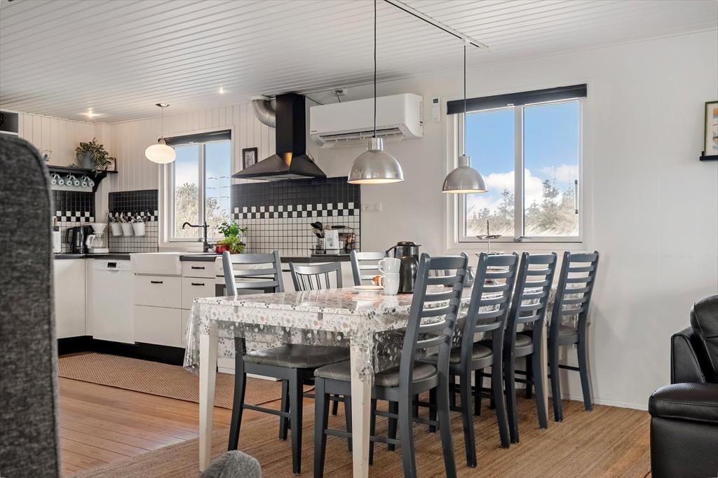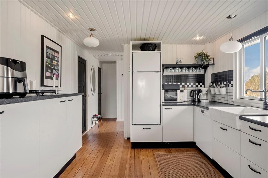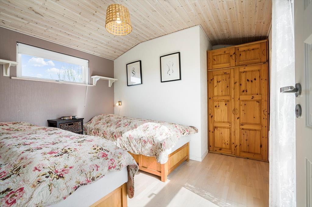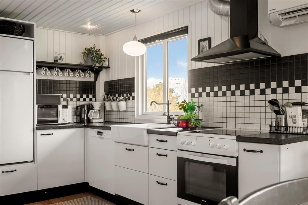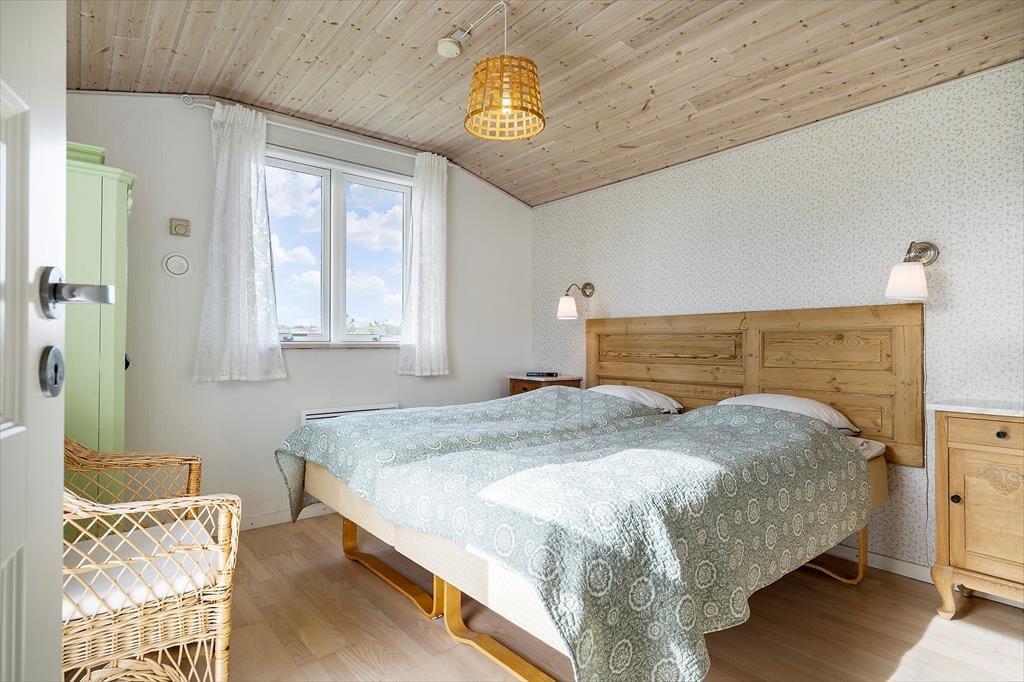 I kan sagtens holde ferie to børnefamilier sammen, for der er to soveværelser i annekset såvel som i selve sommerhuset. Der er også to badeværelser at gøre godt med, hvoraf sommerhusets er udskiftet i 2023, mens anneksets baderum har en praktisk pusleplads. Indretningen i de to bygninger giver jer mulighed for at få lidt privatliv, og samtidig har I god plads til at være sociale i sommerhusets store opholdsafdeling. Den består af køkken og stue i åben forbindelse, og fra stuen har I direkte adgang til en udestue, der er indrettet med spisebord og en hyggelig briks, der inviterer til en middagslur efter sommerfrokosten. I stuen har I udsigt til Ringkøbing Fjord gennem det store, østvendte gavlvindue, og med brændeovn og stort fladskærms-tv er der lagt op til mange gode hyggestunder. Når der skal laves mad, har I gode arbejdsforhold i det pæne og veludstyrede køkken.