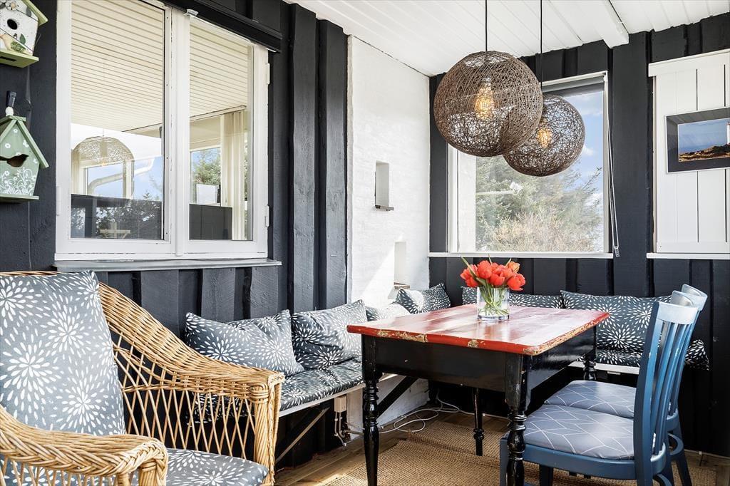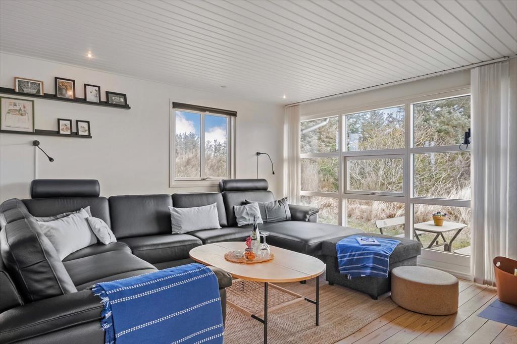 Stuens brændeovn, udestuen og den sekskantede havepavillon er med til at gøre ferieoplevelsen ekstra hyggelig i dette dejlige sommerhus til otte personer. Det pynter selvfølgelig også, at der er udsigt til Ringkøbing Fjord fra huset, og fra naturgrunden kan I nyde synet af Lyngvig Fyr.