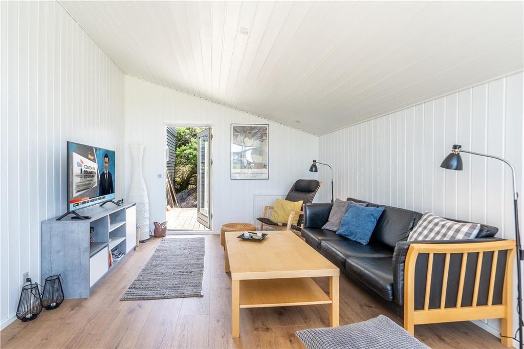 Det komfortable driverliv kan også foregå ude på træterrassen, der breder sig rundt om sommerhuset. Terrassen er stor og solrig, og den er udstyret med havemøbler, liggestole og grill, så I kan få mest muligt ud af det skønne sommervejr. På naturgrunden er der gyngestativ til de yngste i familien, og hvis I har medbragt hund, starter de gode vandrestier bare 100 meter fra huset.