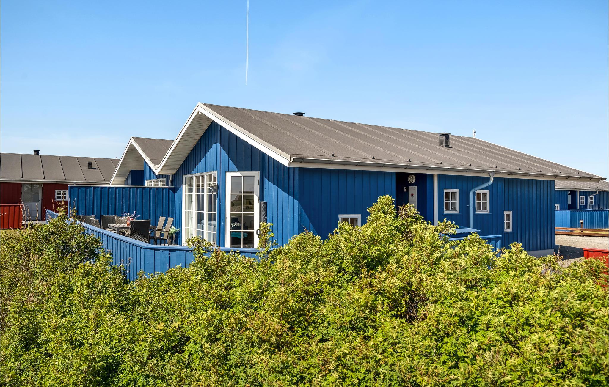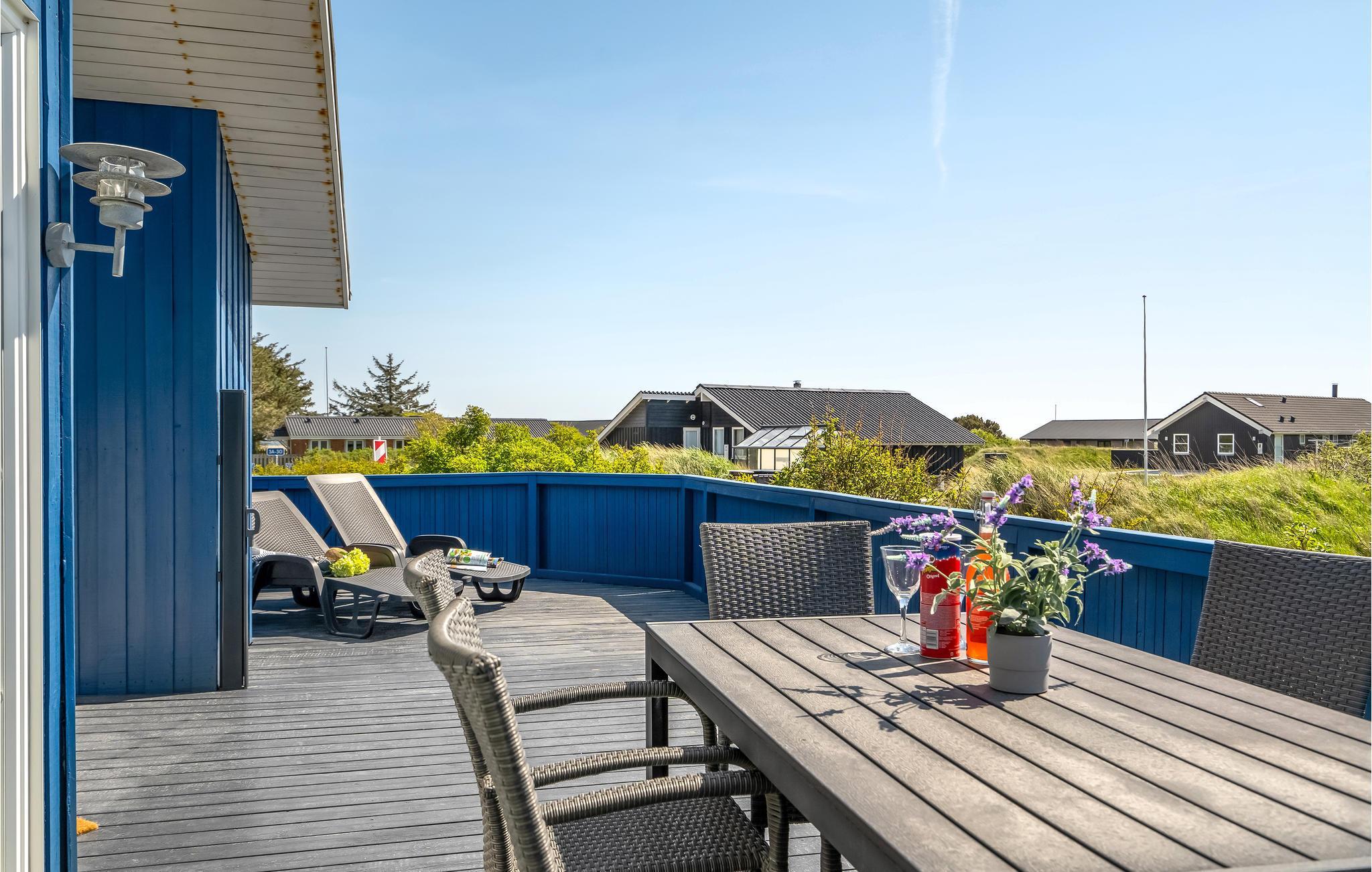 I Nørre Lyngvig ligger dette flotte hus, som virkelig springer i øjnene med sin friske, havblå farve. Huset har store glaspartier ud mod området, så der er et fantastisk lys overalt, og ikke mindst i opholdsrummet, hvor I får en skøn ramme om dagens måltider. Begynd jeres morgener med en kop friskbrygget kaffe og tag den med ud på terrassen, hvor I kan planlægge dagens aktiviteter. Om eftermiddagen er det skønt at smide sig i en liggestol med en god krimi, mens børnene leger i haven. Hvis I skal gøre noget godt for jer selv oven på dagens mange indtryk, kan I læne jer tilbage i den udendørs whirlpool.