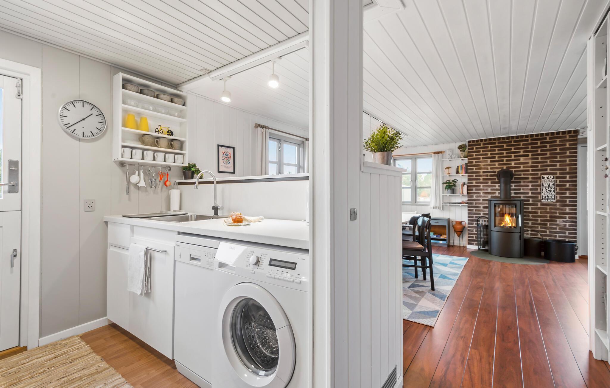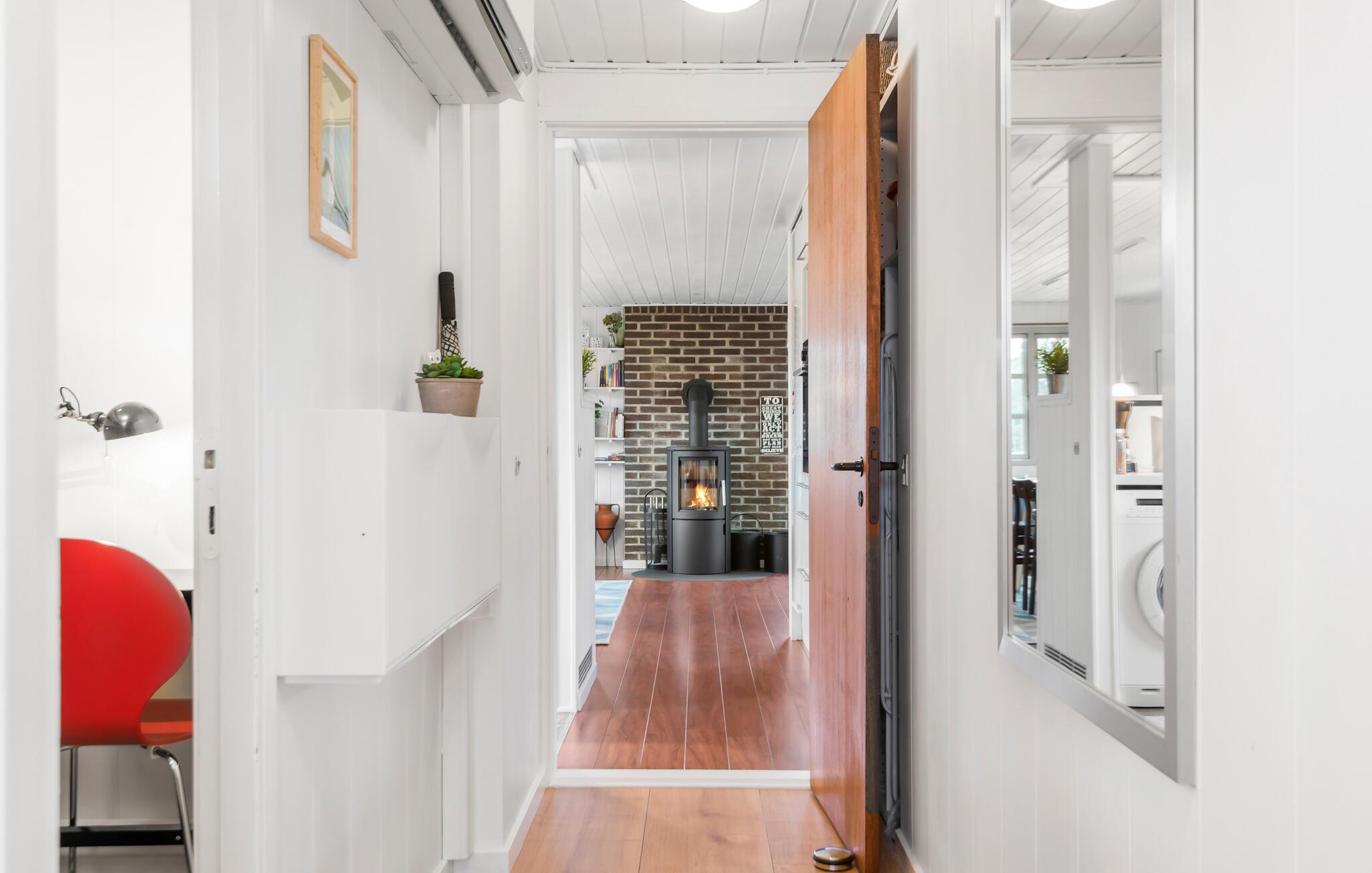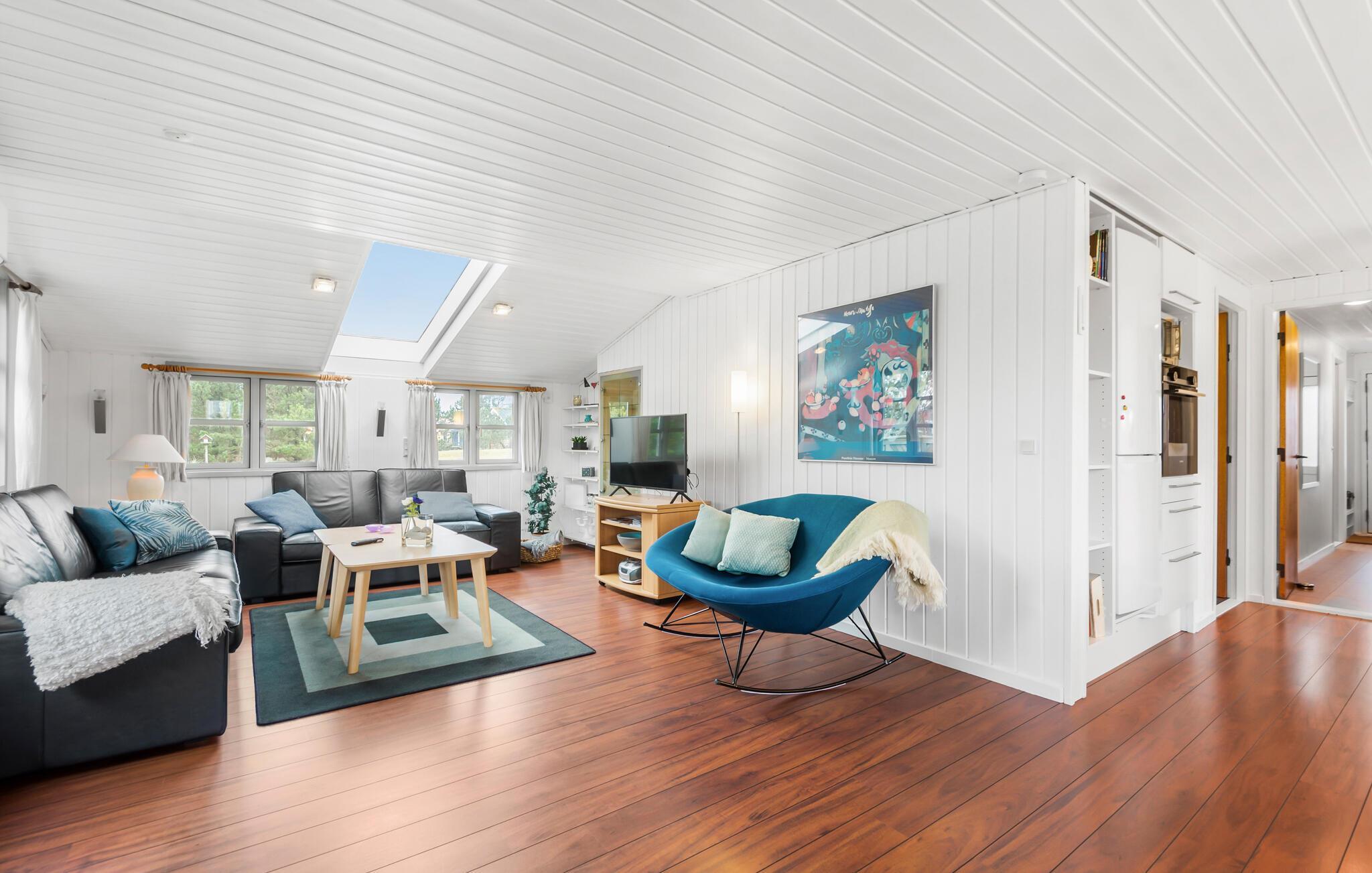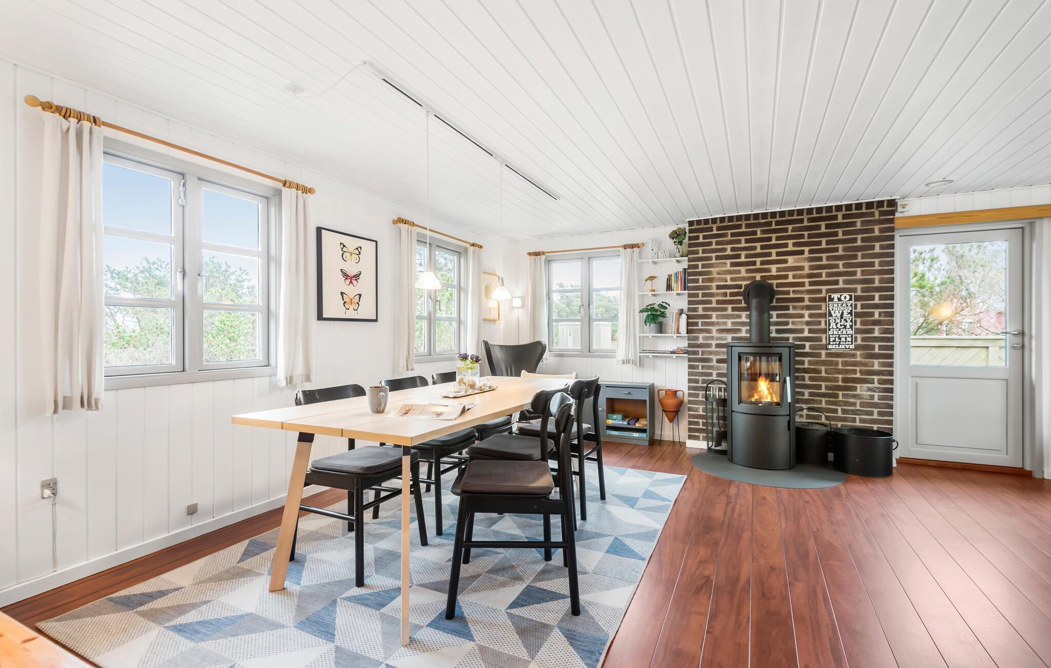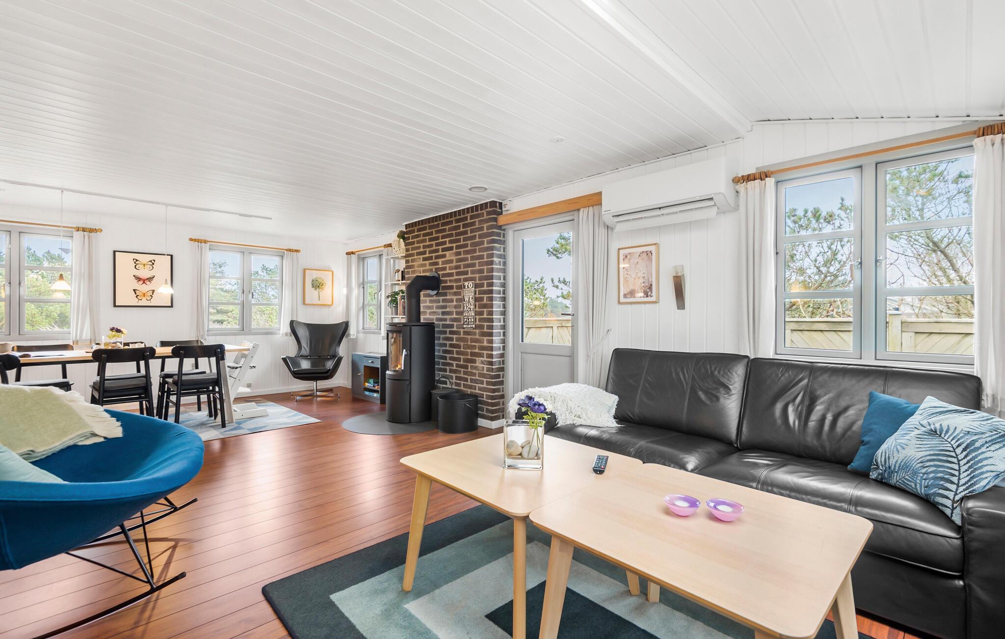 Hyggeligt feriehus i Nr. Lyngvig med lys atmosfære, brændeovn og terrasse nær Vesterhavet og Ringkøbing Fjord.