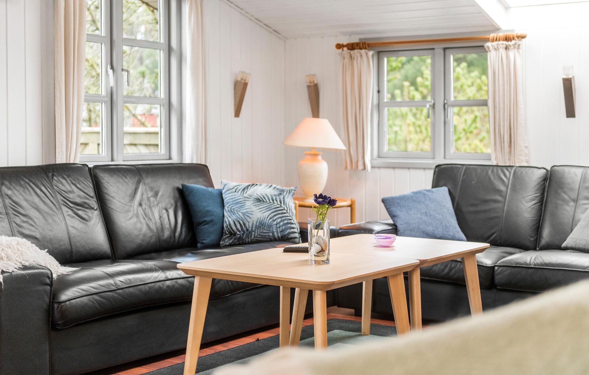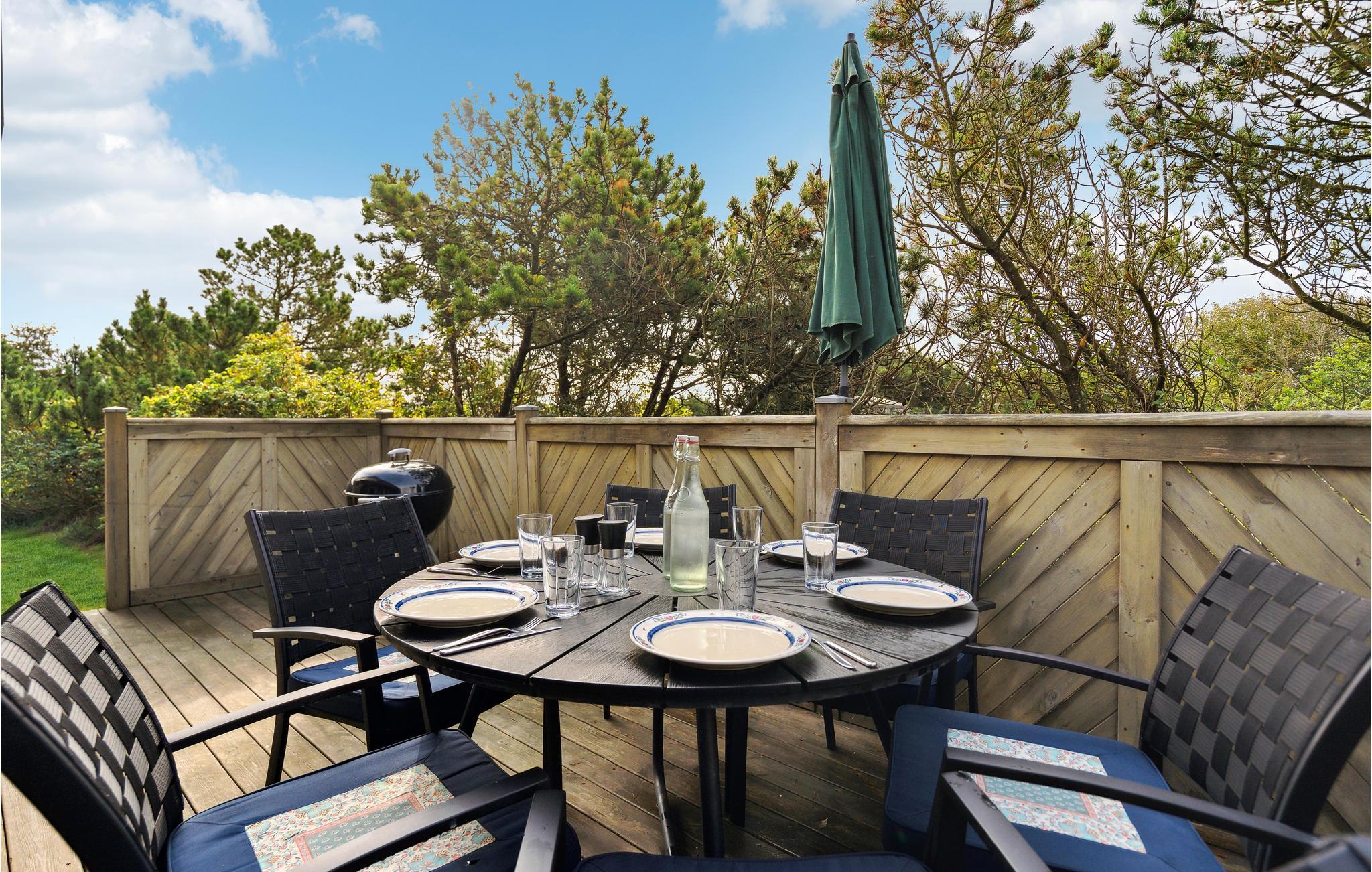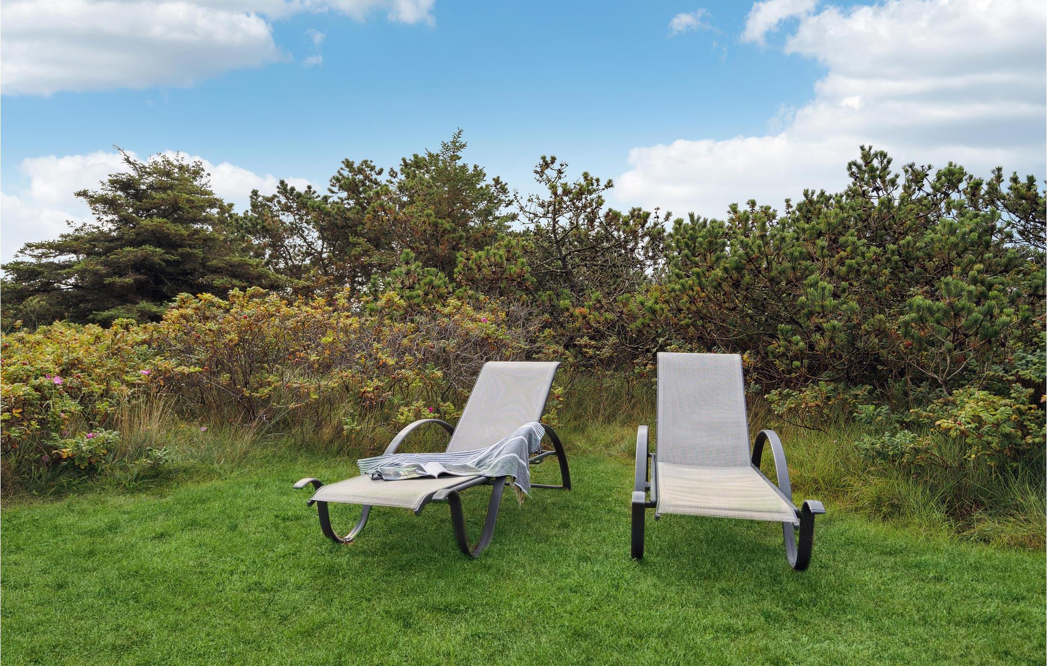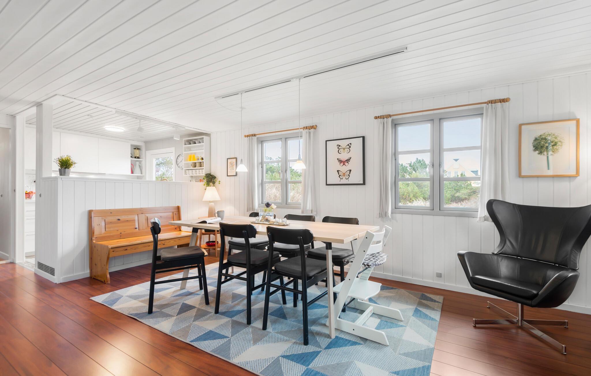 Nyd en velfortjent pause fra hverdagen i dette hus i Nr. Lyngvig. Huset skaber de ideelle rammer for, at I kan slappe af og tilbringe tid sammen med jeres nærmeste. Den gode indretning og det naturlige lys, der kommer ind gennem de mange vinduer og ovenlysvinduer skaber en behagelig lys atmosfære med kig til himlen. Brændeovnen, som spreder hygge på køligere dage, fuldender den gode oplevelse. Afhængigt af vejret kan I vælge mellem en solrig eller vejrbeskyttet terrasse. Her kan I samles for at grille og spille et slag kort. Måske rykker I også morgenmaden udenfor? Nyd solen i haven og luk øjnene på solstolene.
