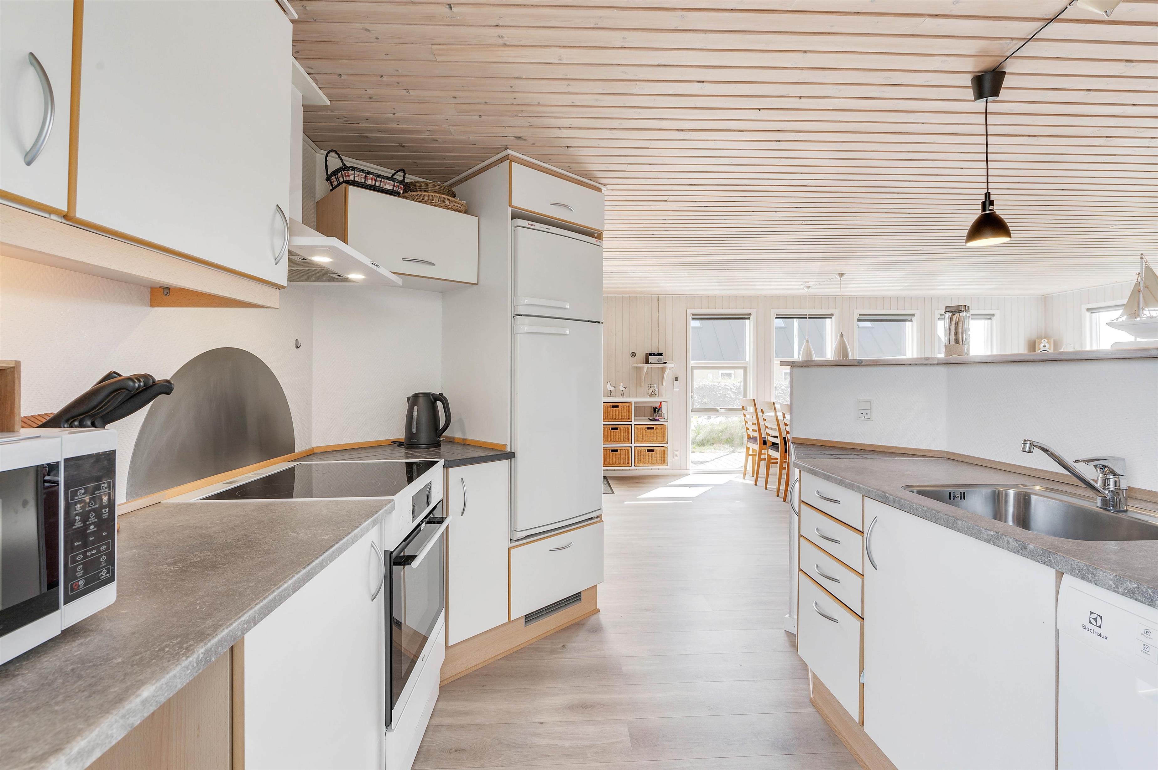 Køkkenet ligger i forbindelse med stuen og er udstyret med en mikroovn, fryser og opvaskemaskine. På den måde har I mulighed for altid at tilbringe tid med hinanden. En tilbereder aftensmaden, mens en anden slapper af i sofaen med en god bog, eller en film på smart-tv ’et hvor der også er tilhørende chromecast.