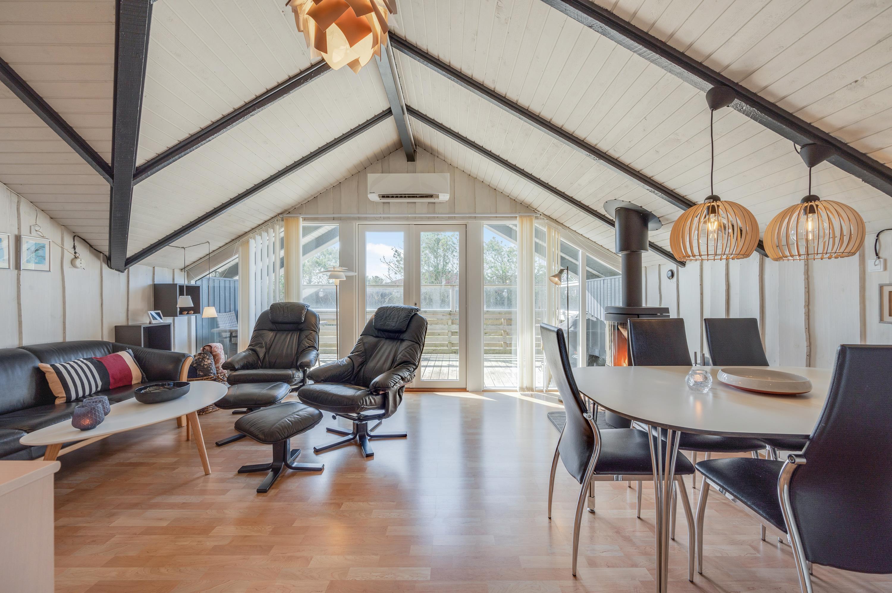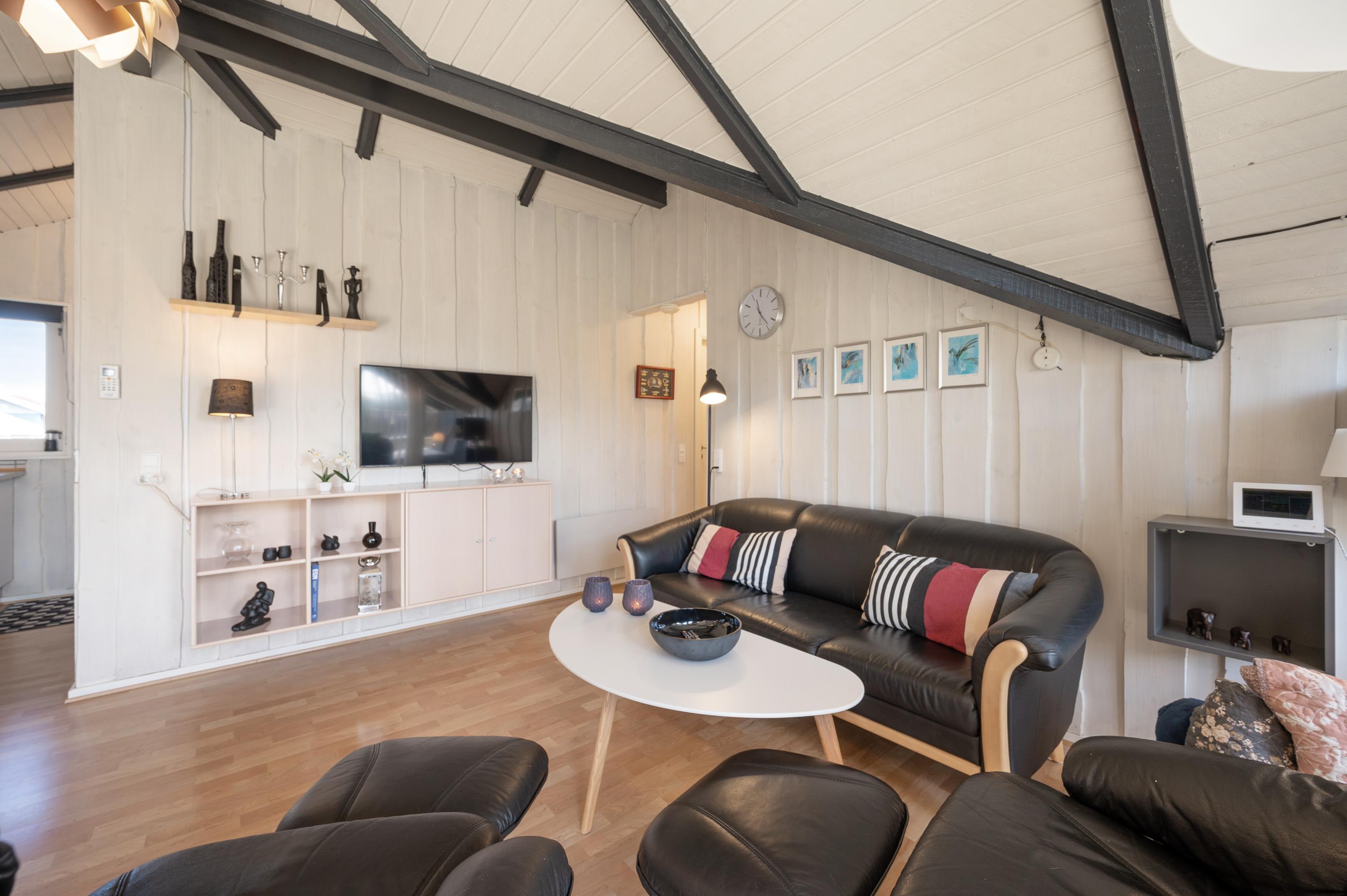 Stuen er hjemligt indrettet, og især på de køligere dage er der lagt op til familiehygge foran den knitrende ild i brændeovnen, måske med kort- og brætspil.