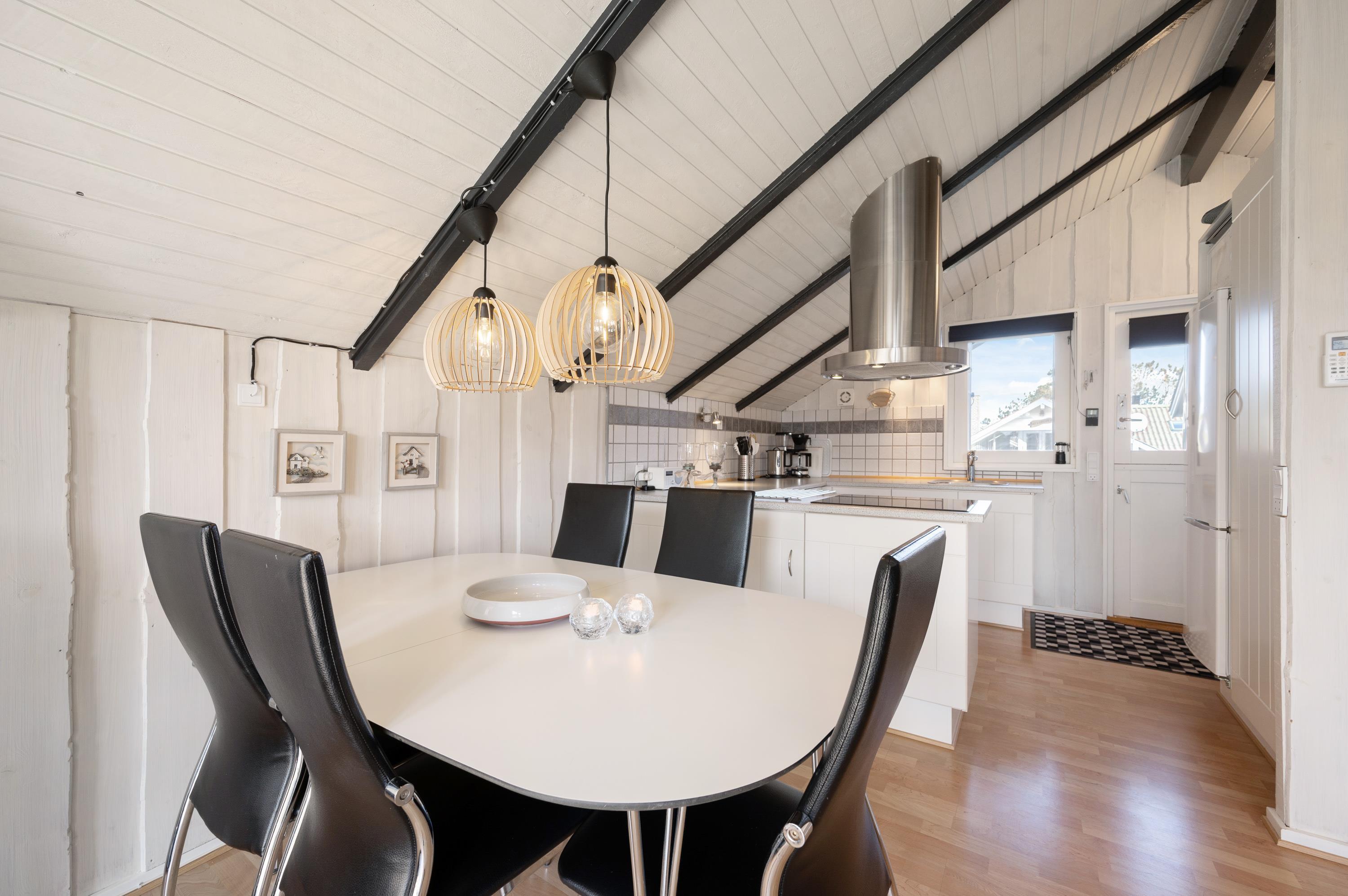 Sommerhusets hjerte er det åbne opholdsrum med stue og køkkenafdeling. Her er alle med i fællesskabet - også når man står i køkkenet. Køkkenafdelingen er praktisk indrettet med bl.a. 60 l. fryser, mikroovn og opvaskemaskine