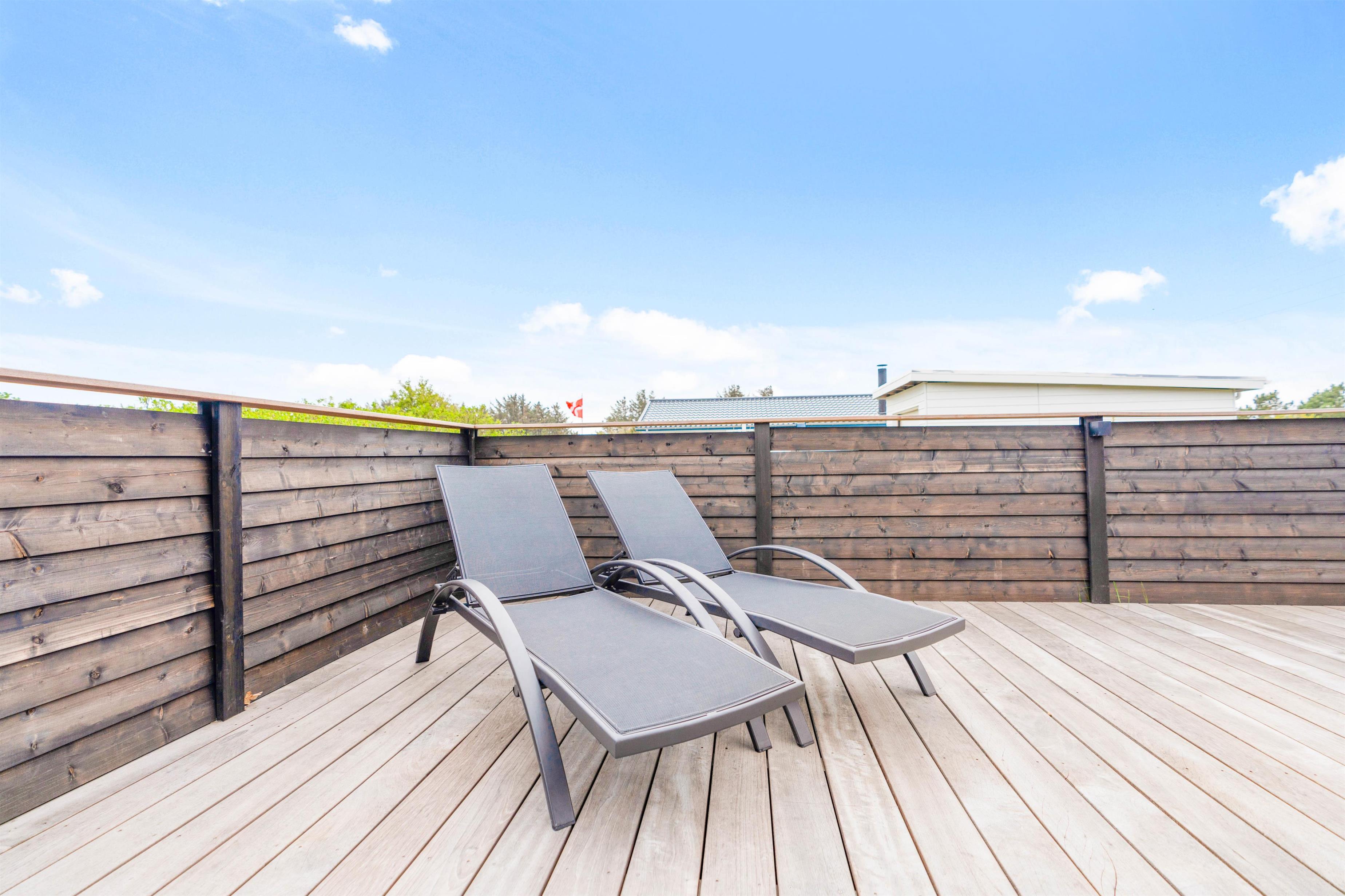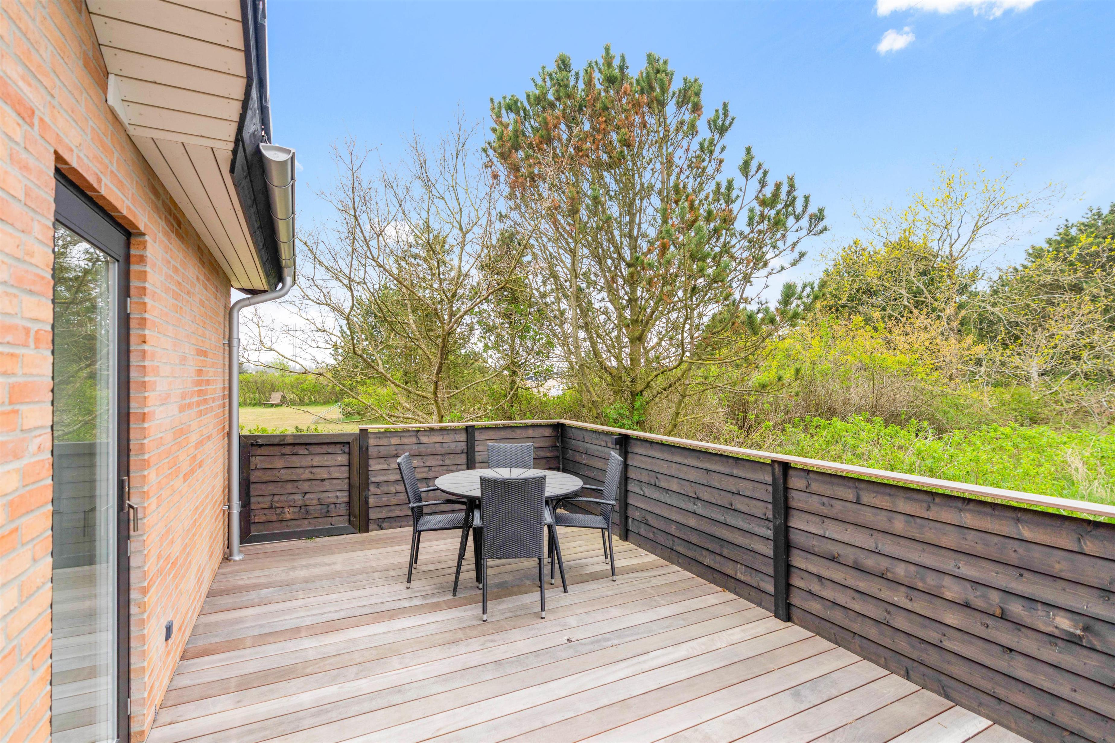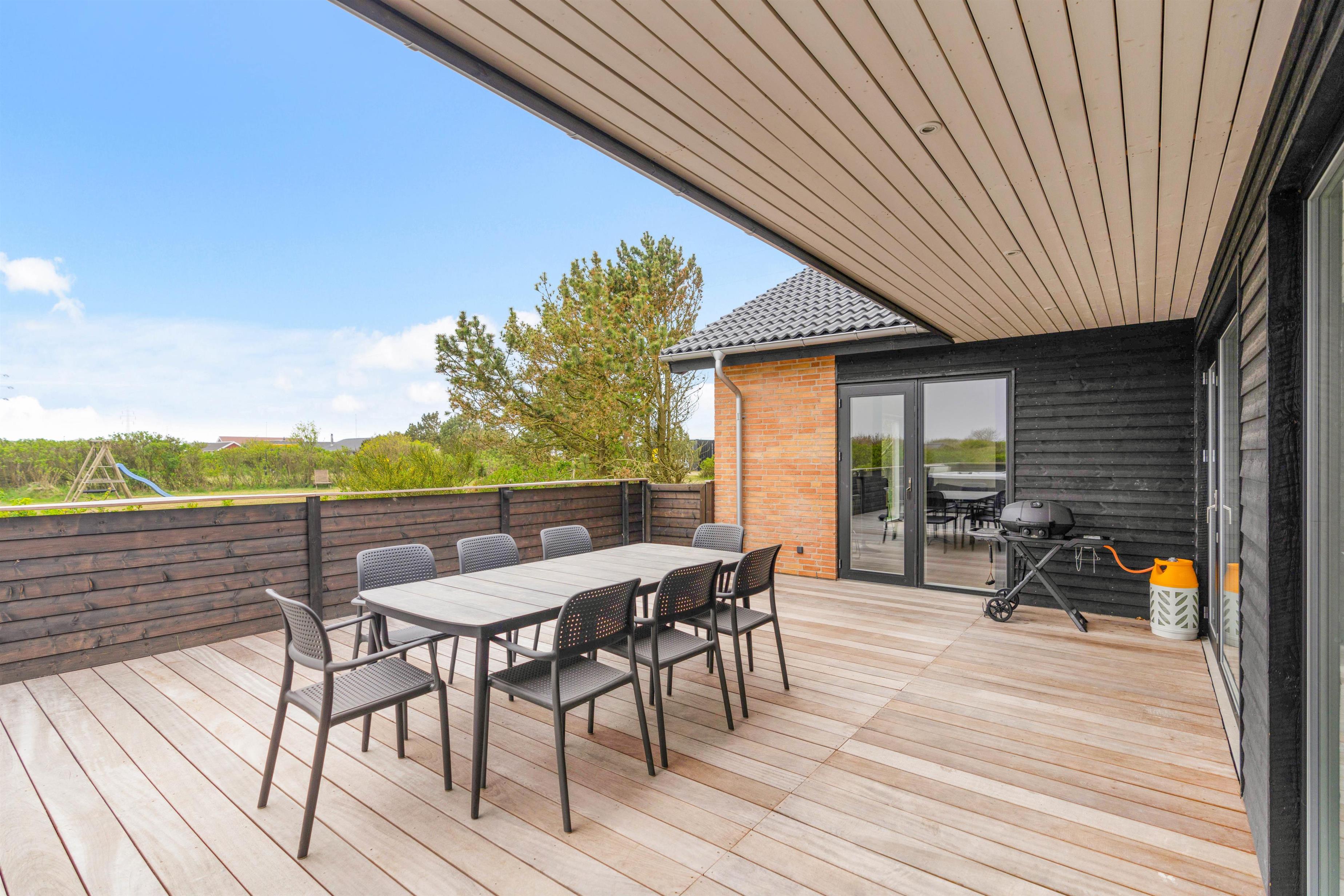 Den store sydvendte terrasse er lukket hele vejen rundt, hvilket især er praktisk, hvis I har hundene med på ferie. Der er både en åben, afskærmet og overdækket del, så I uanset vind og vejr kan sætte jer ud og nyde den friske luft og den vestjyske natur med en kold drink eller en friskbrygget kop kaffe. På de gode sommerdage kan I passende slutte af med en grillmiddag i aftensolen – som hurtigt kan tilberedes på den praktiske gasgrill.