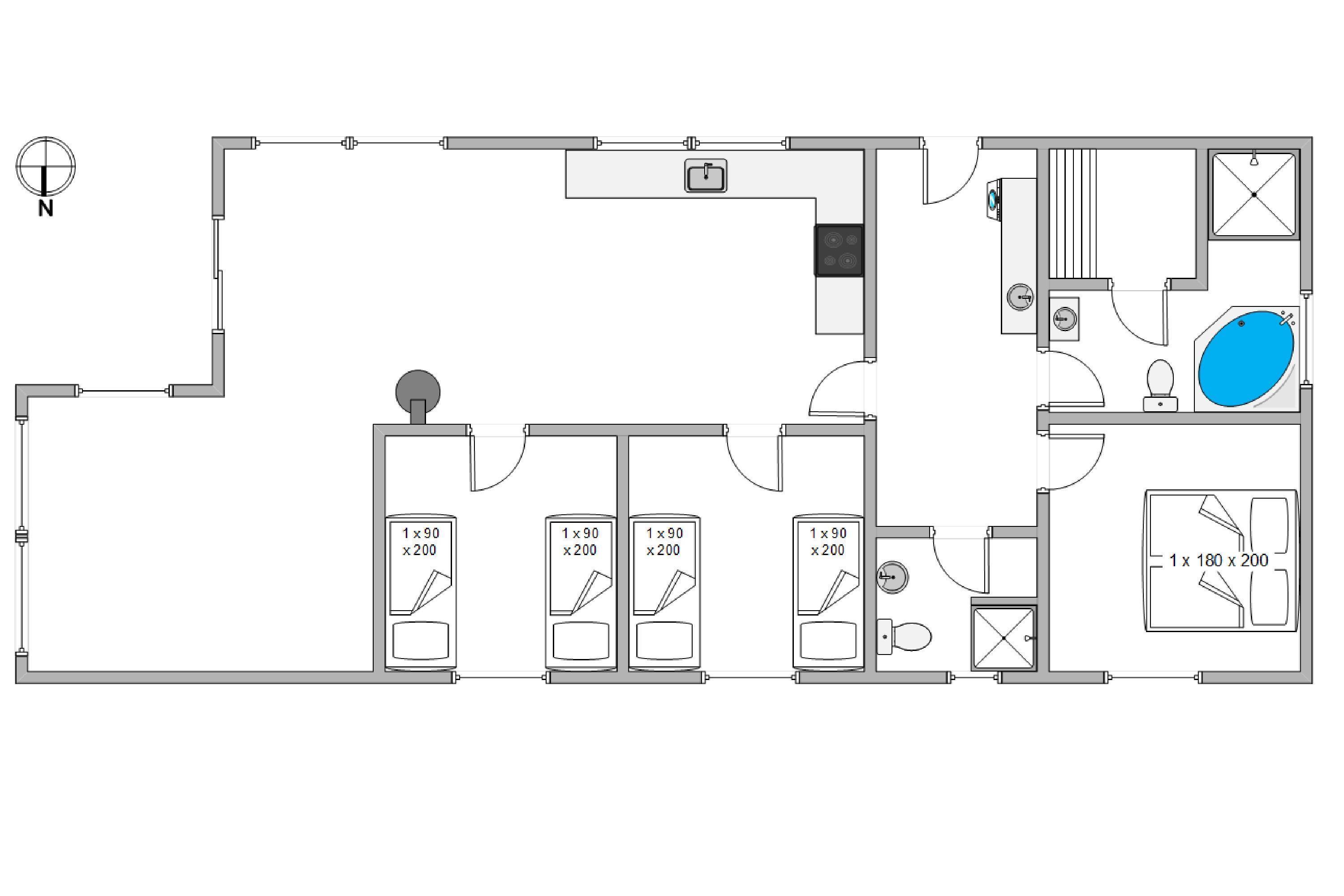 De store vinduespartier giver masser af dagslys i sommerhuset. Fra opholdsrummet har du en smuk udsigt over Ringkøbing Fjord, som du også kan nyde ved morgenmaden. I det store køkken kan feriekokken slå sig løs, naturligvis med hjælpe fra eventuelle små feriekokke. I husets bryggers er der god plads til overtøjet og vandrestøvlerne. Efter en god vandretur kan I tage en tur i saunaen for at blive varmet godt igennem.