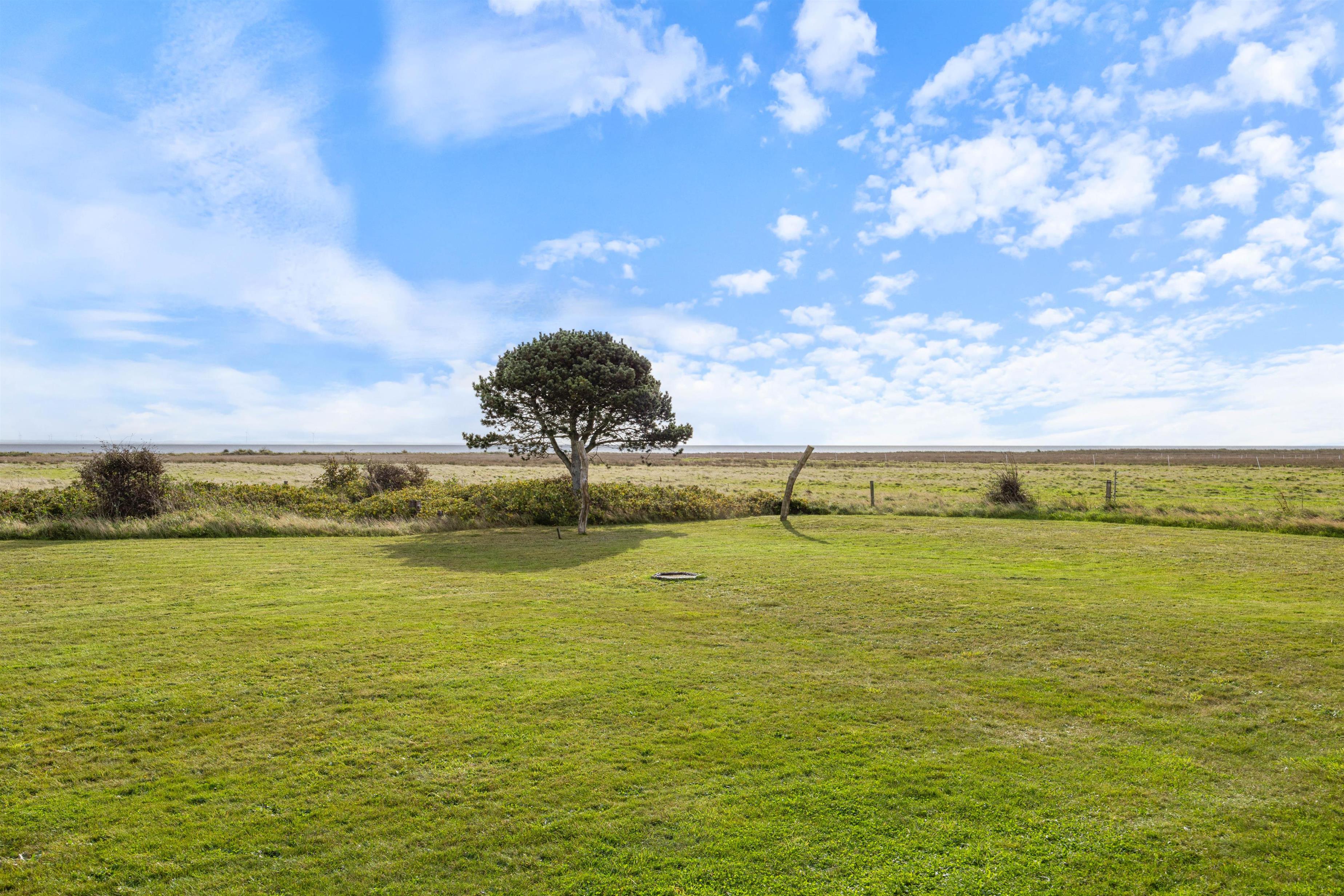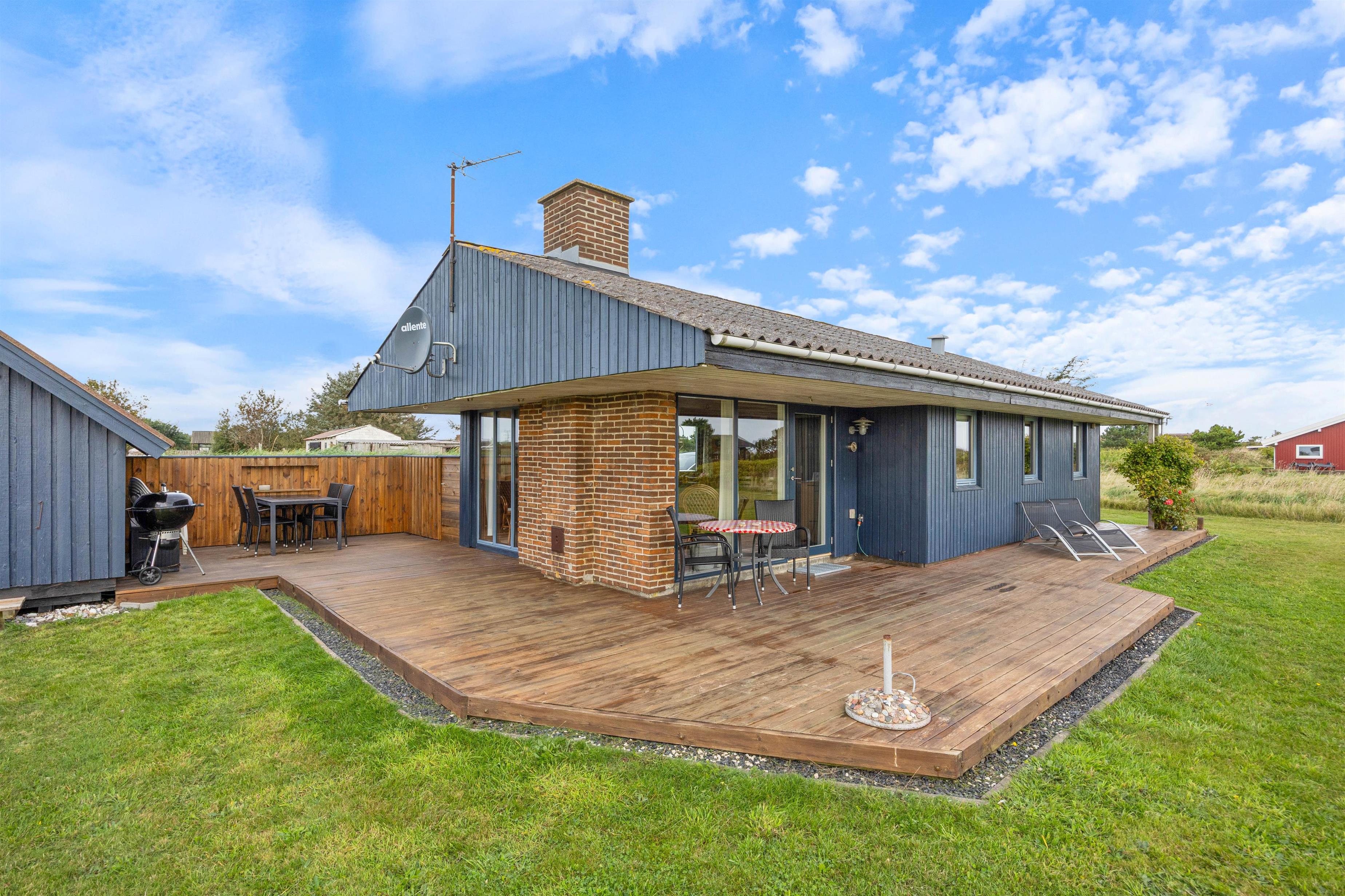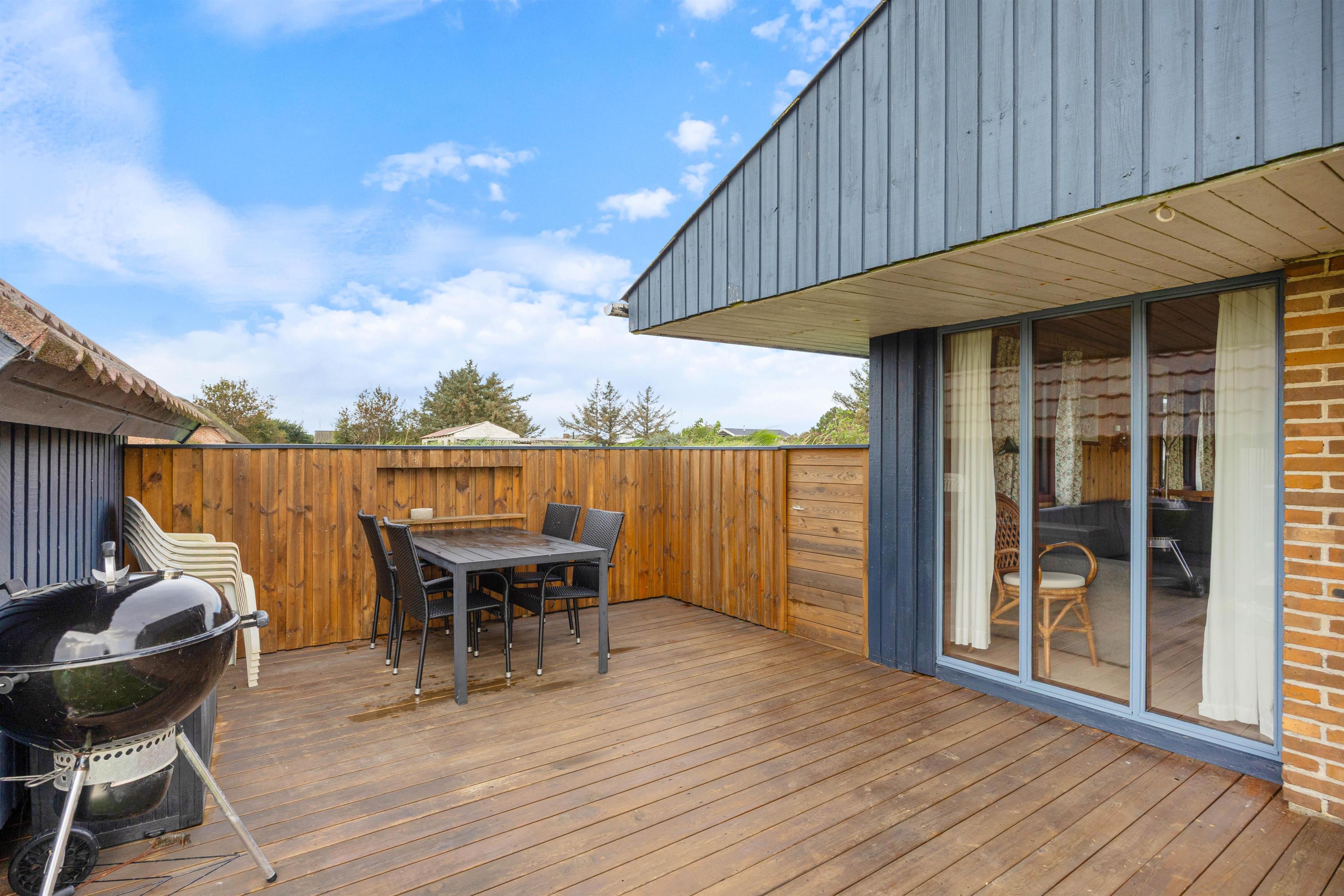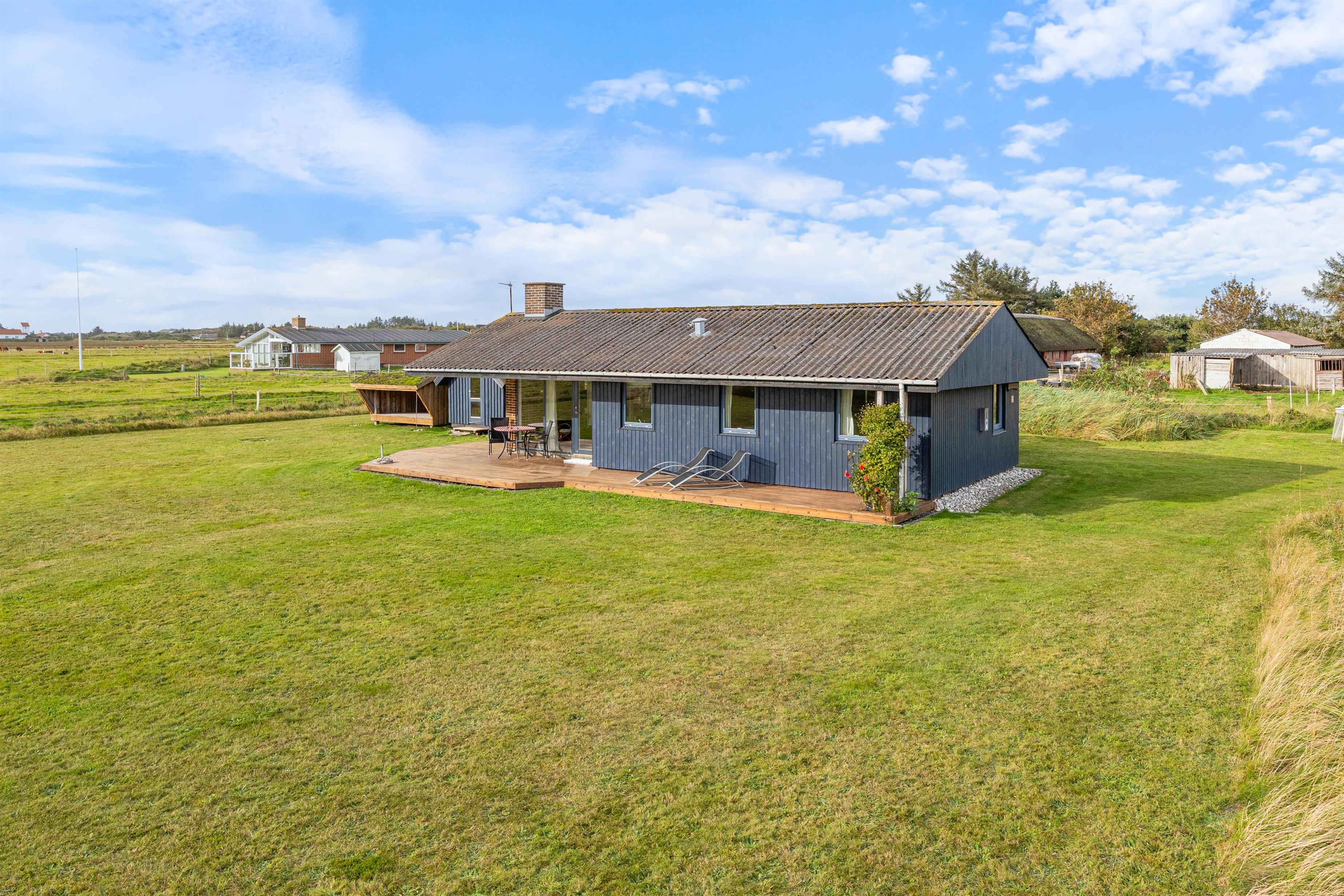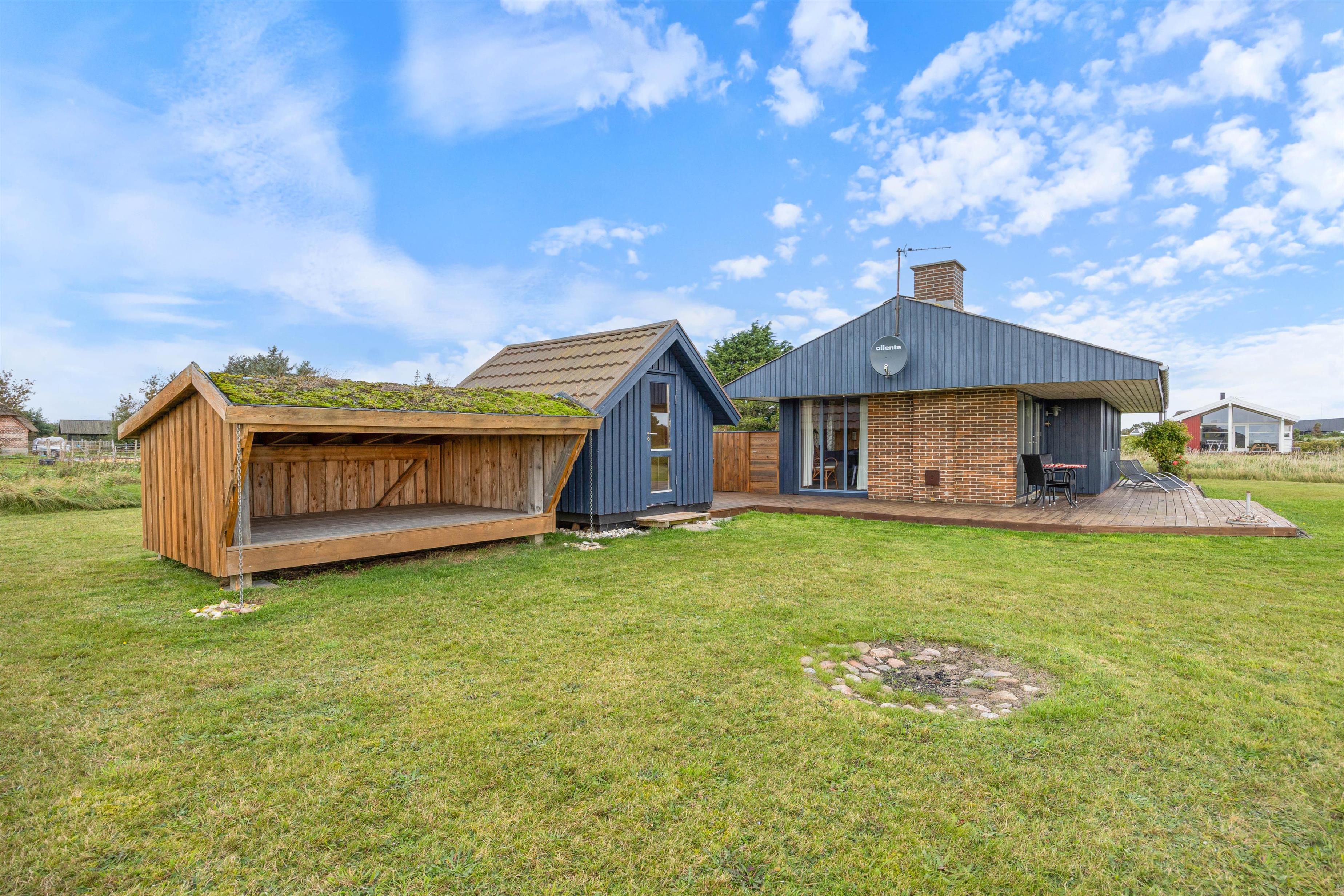 Feriehusets øst- og sydside er omkranset af en lækker træterrasse, som byder på forskellige hyggekroge, hvor I kan sætte jer godt til rette i den friske luft. I kan sidde direkte i solen eller finde et mere beskyttet og skyggefuldt sted på den delvist overdækkede terrasse. Lige meget hvor på terrassen I sidder, er der en enestående panoramaudsigt over engene og ned til fjorden.