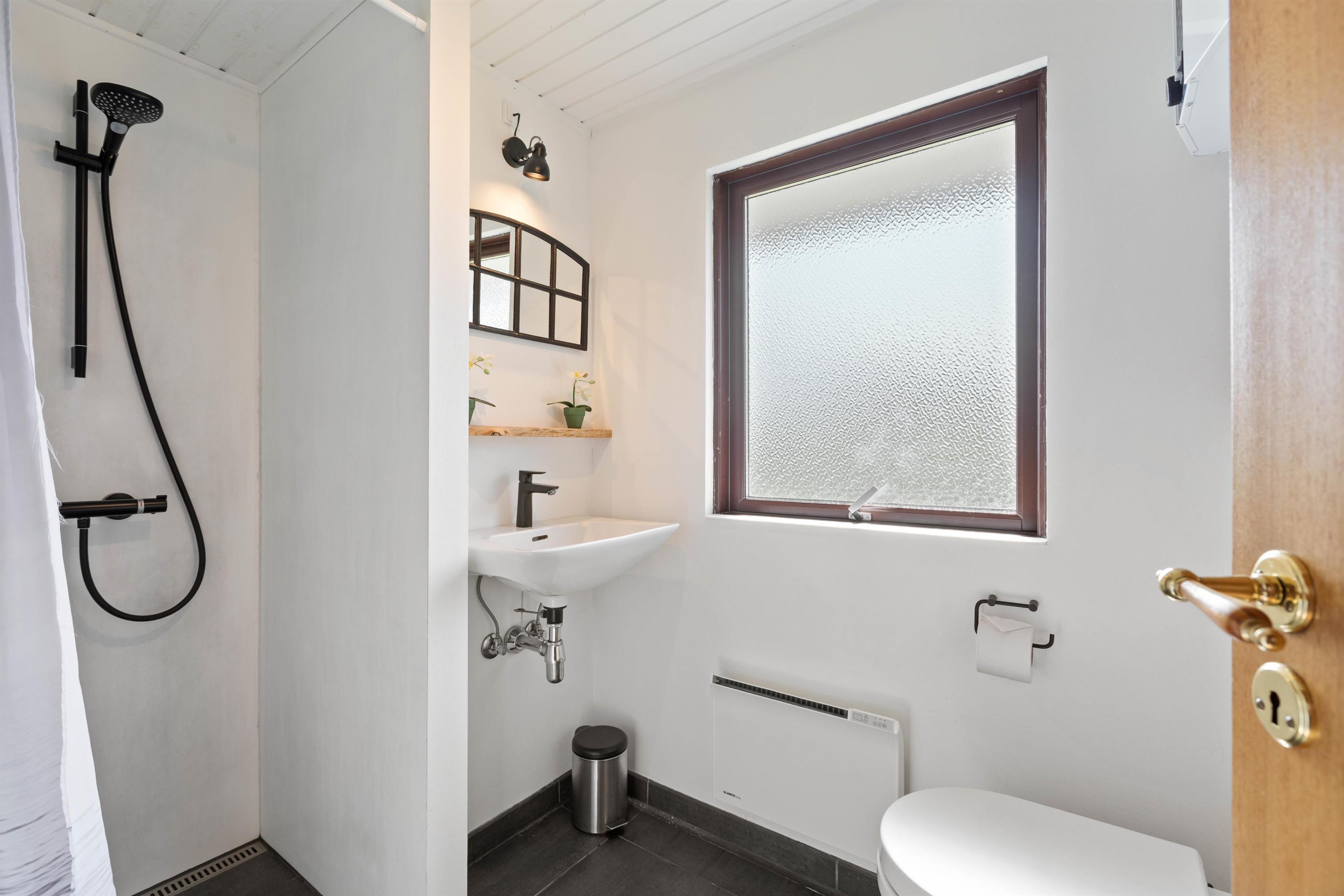 Det lyse og moderne badeværelse har et skønt naturligt lysindfald og en fin bruseniche. På badeværelset kan I nyde godt af den dejlige gulvvarme, der sørger for varme fødder lige fra morgenstunden.