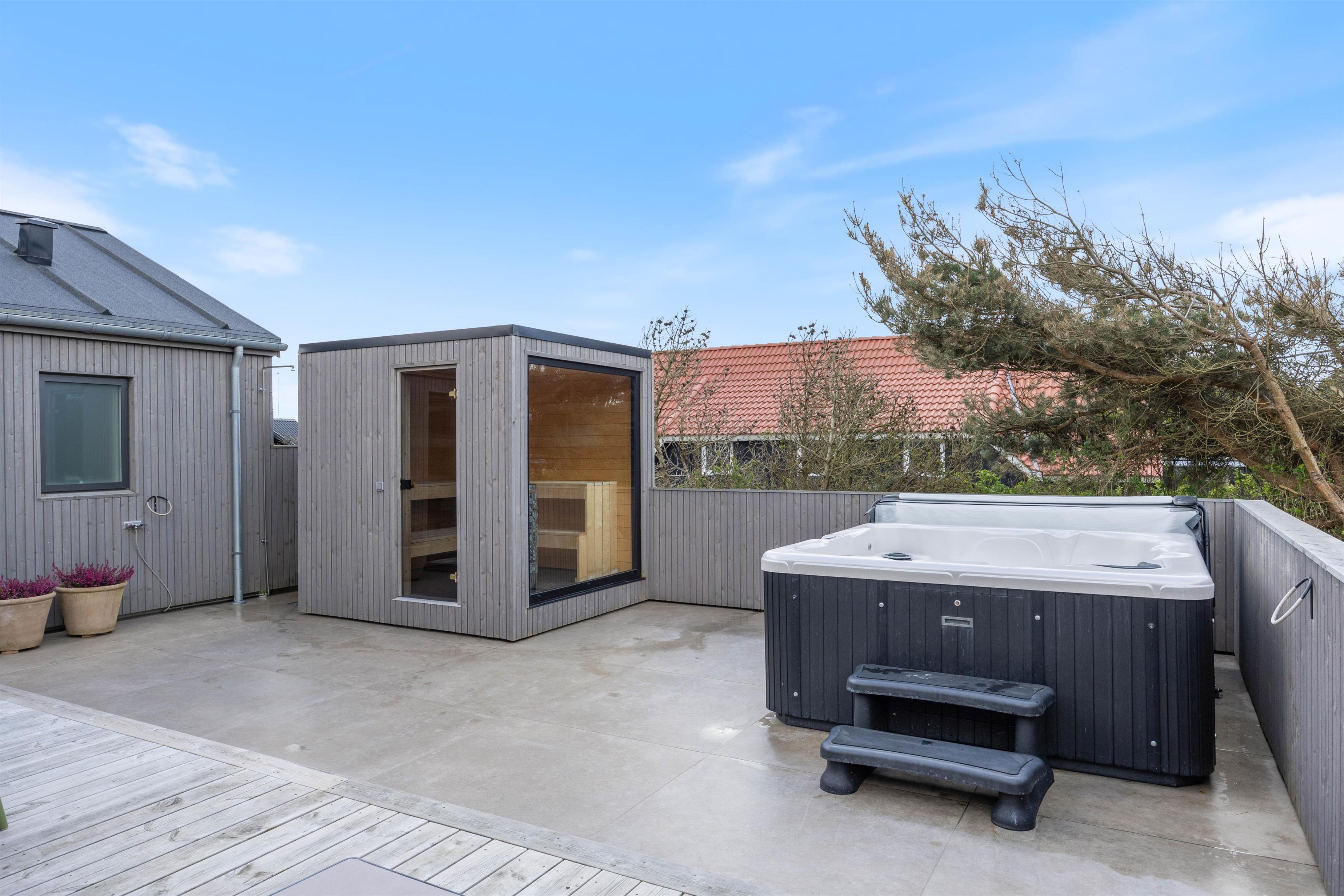 Stor lukket terrasse med udendørs sauna og spa