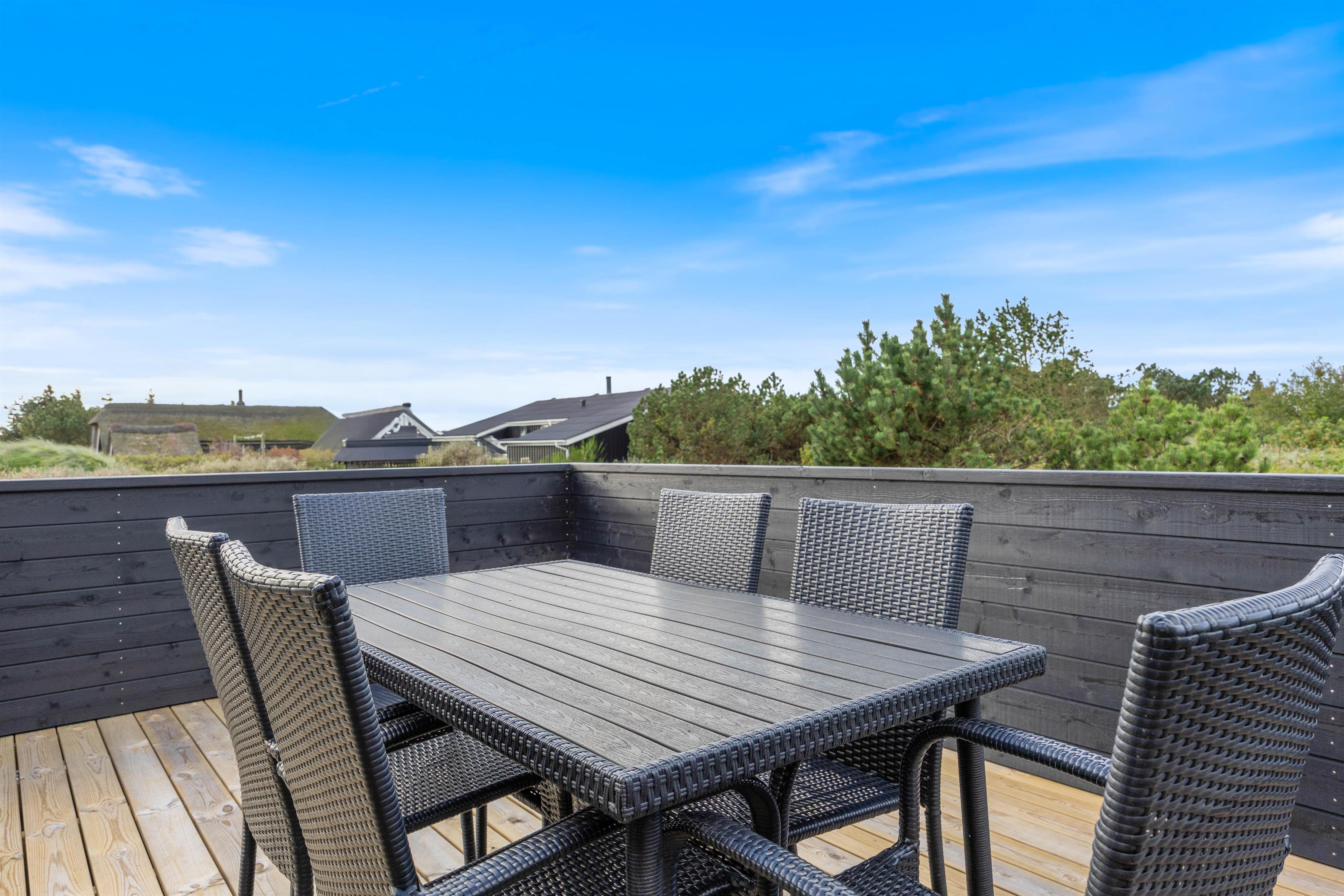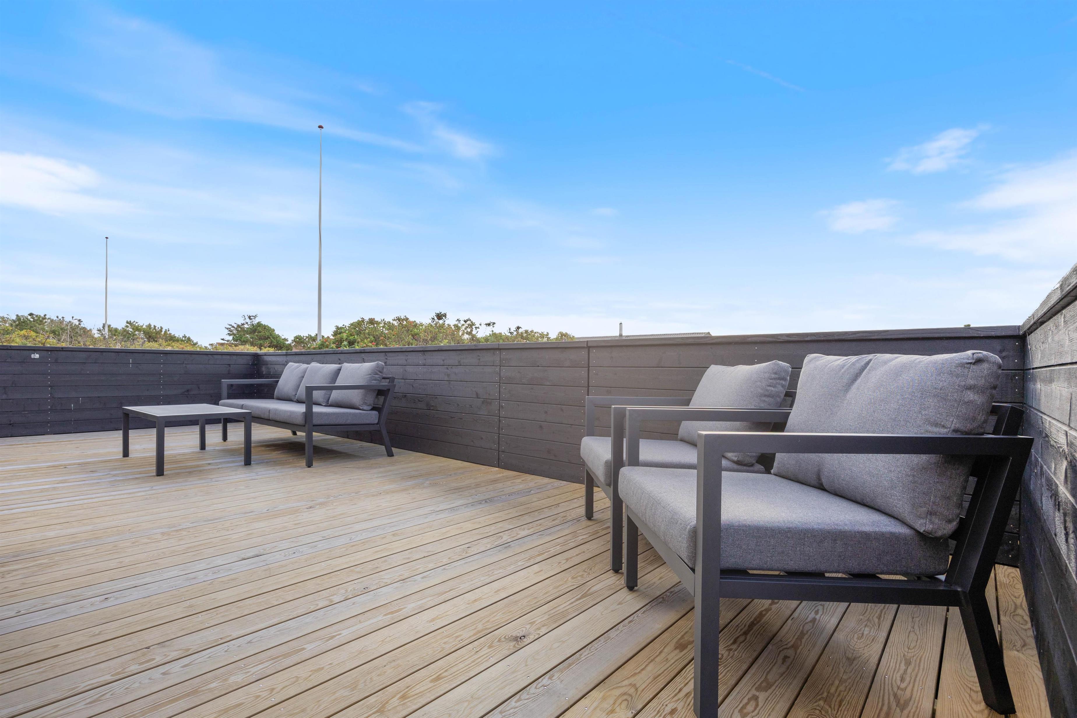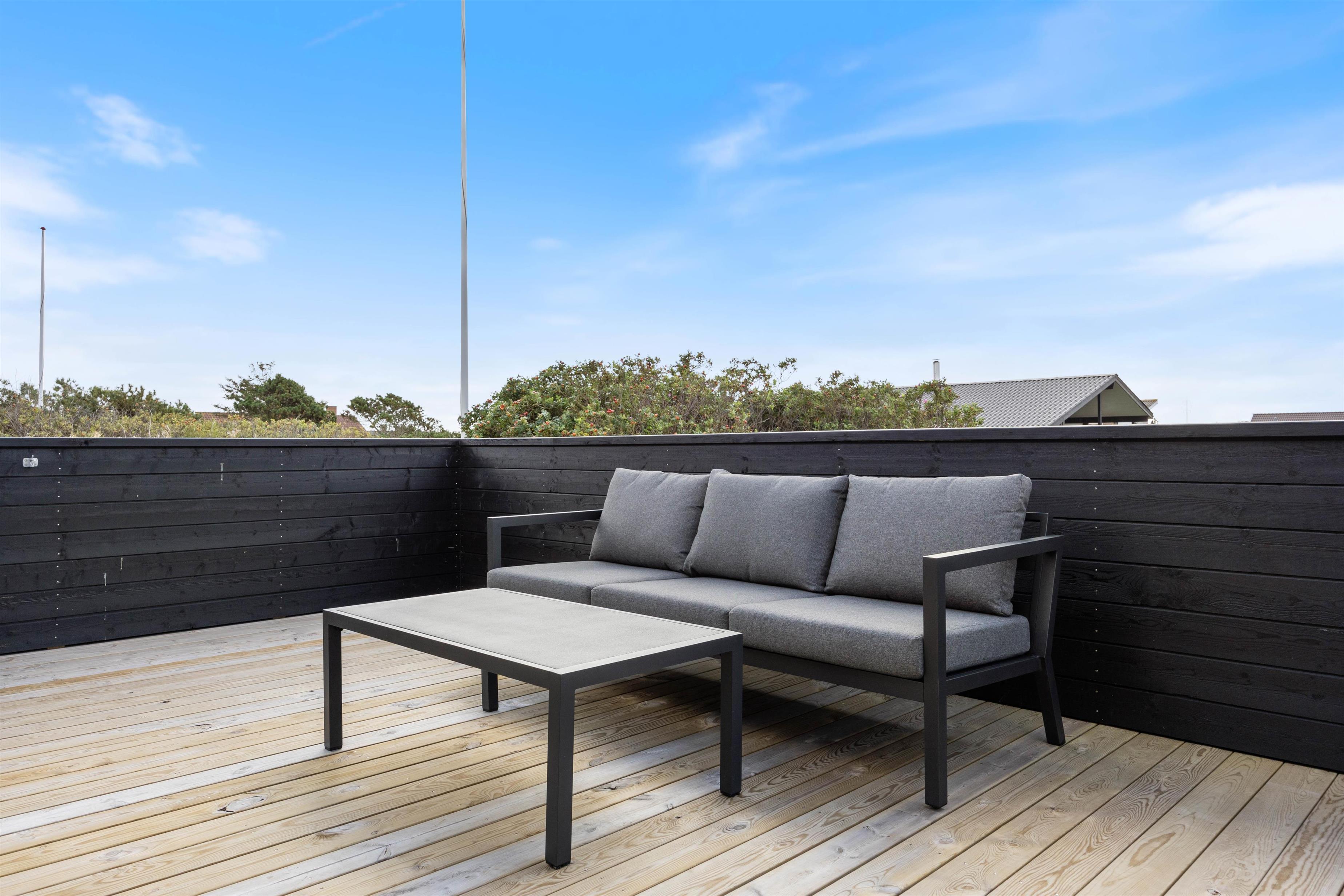 Når solen står højt på himlen og fuglene synger, er det oplagt at trække ud på terrassen, som ligger i forlængelse af alrummet. Terrassen er afskærmet med stakit, så I kan sidde ugerenet og nyde solen og det dejlige landskab.