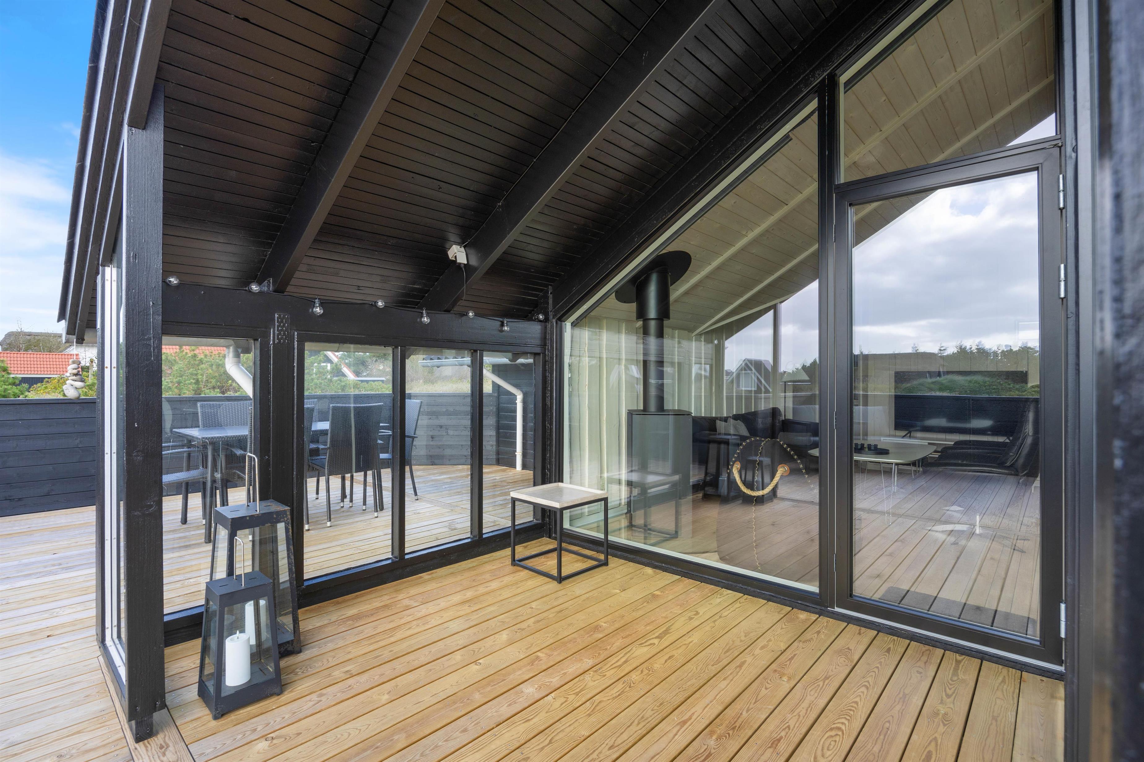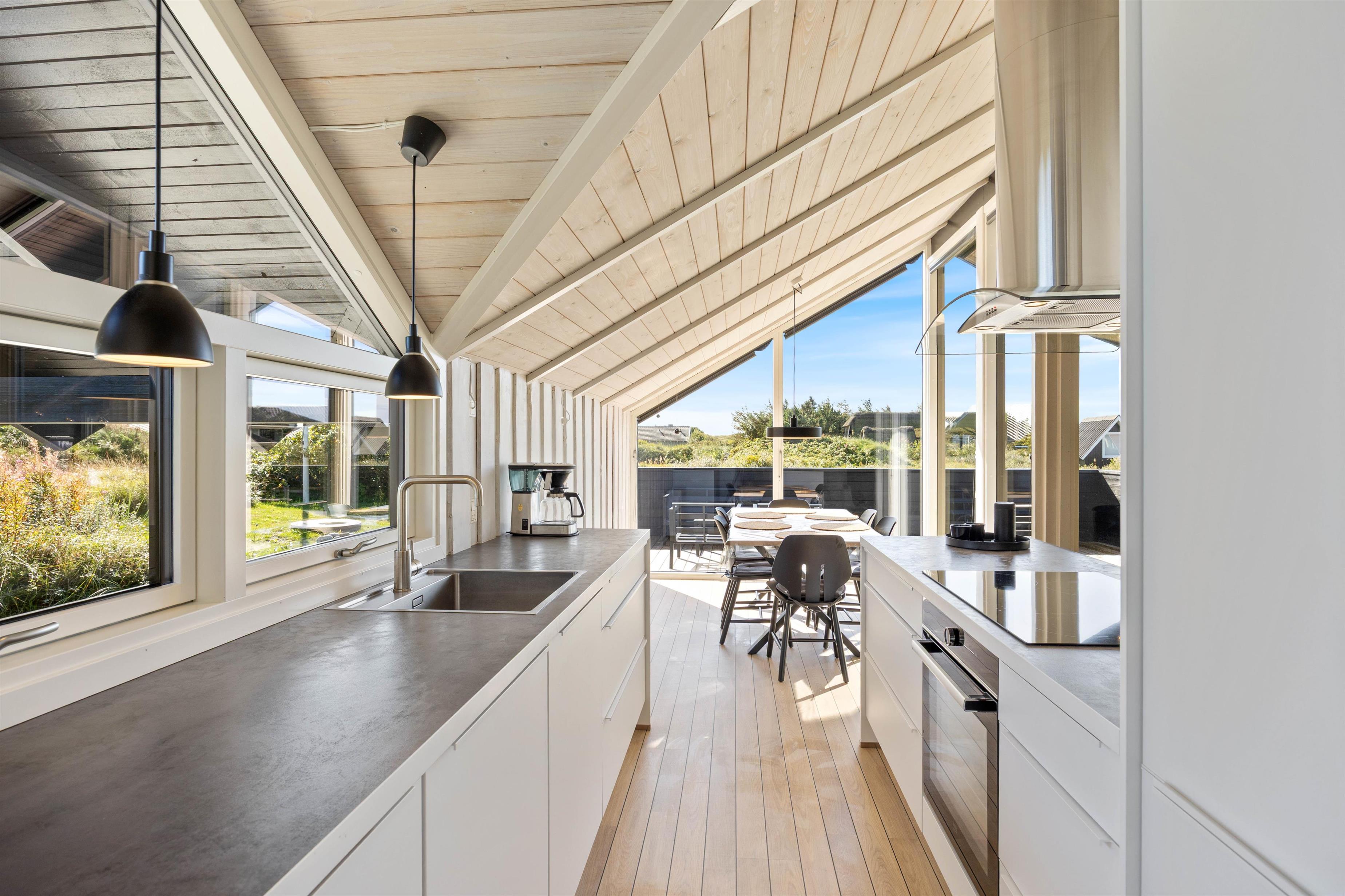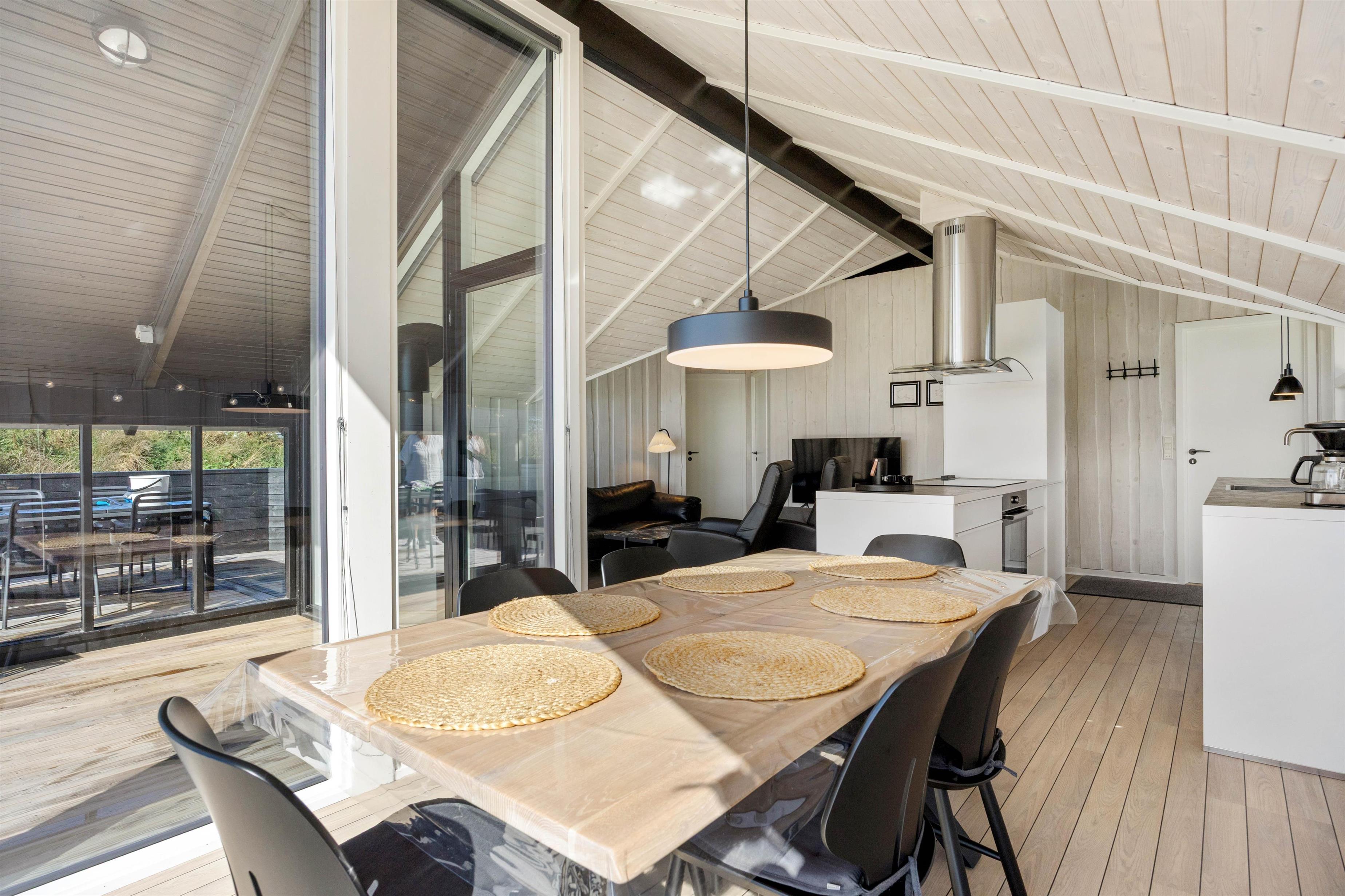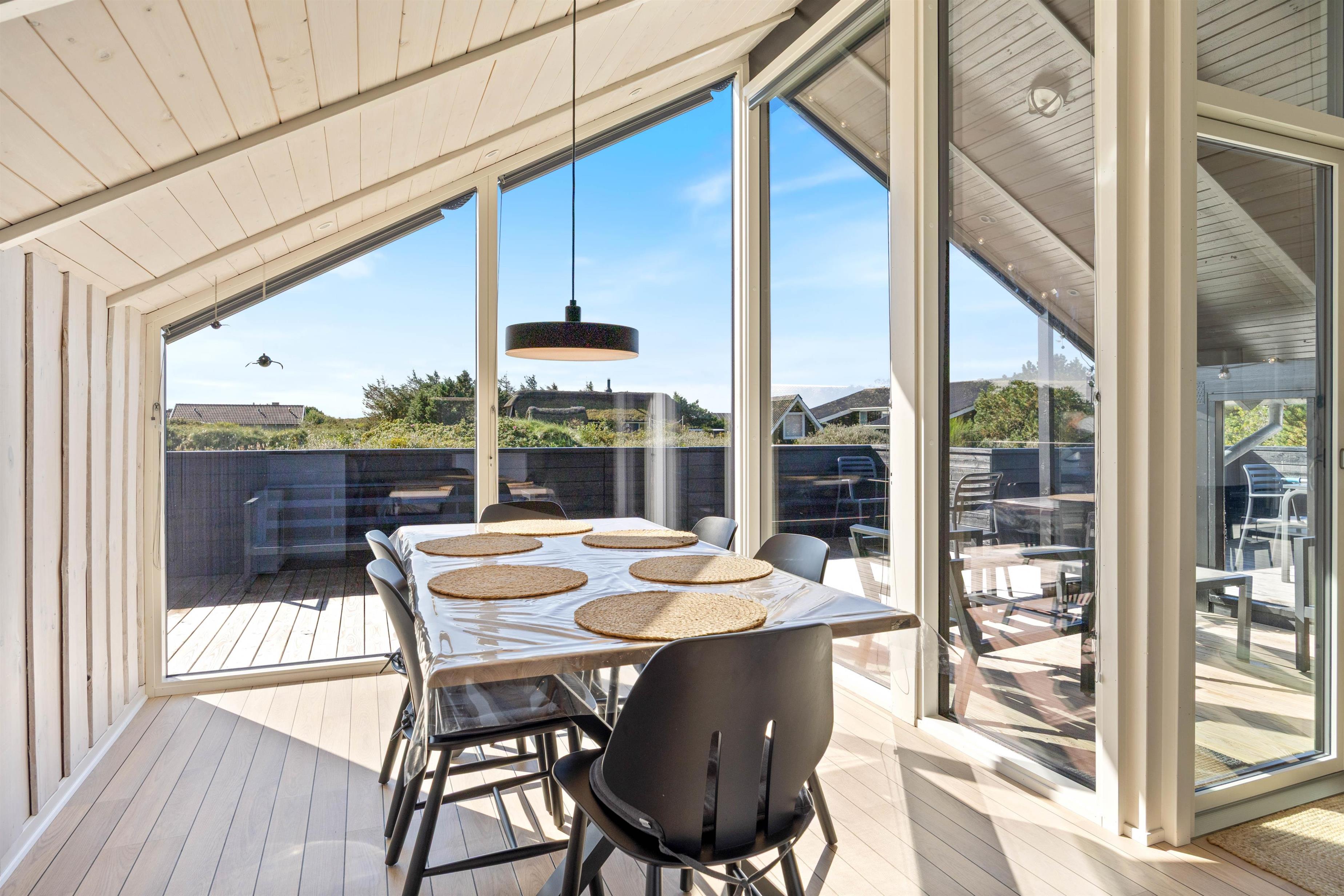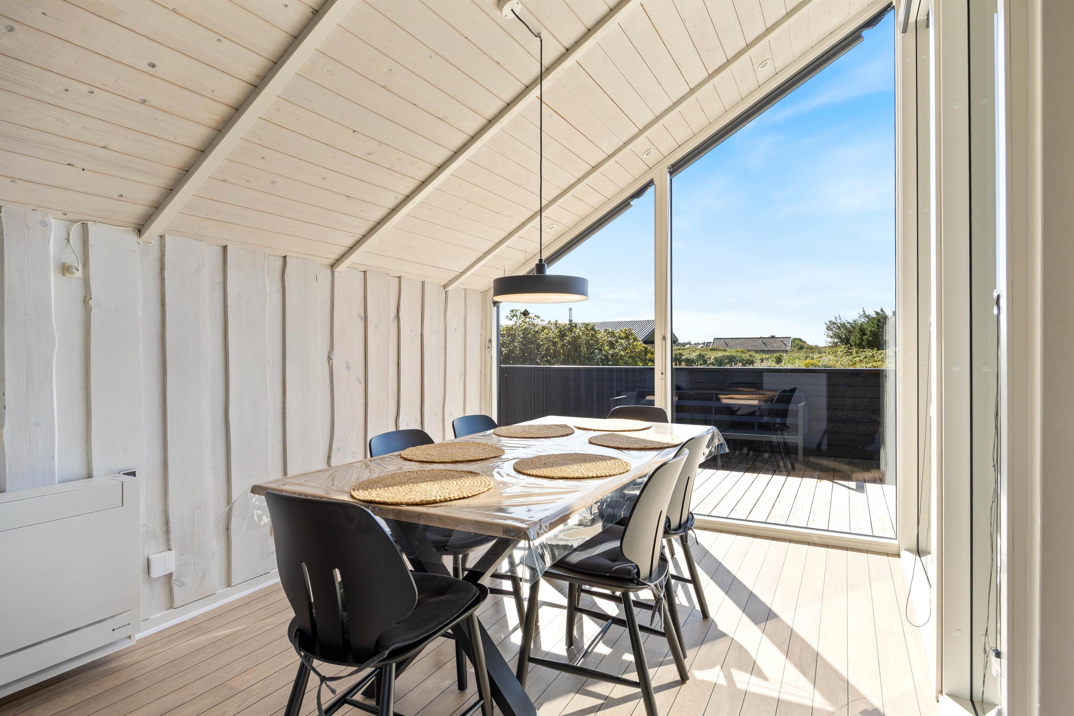 Spisepladsen er placeret ved de store vinduer, så I har mulighed for at nyde den dejlige udsigt over en dejlig middag med familien. På kolde og blæsende dage kan I tænde op i brændeovnen og nyde varmen og en kop kaffe i sofaen.