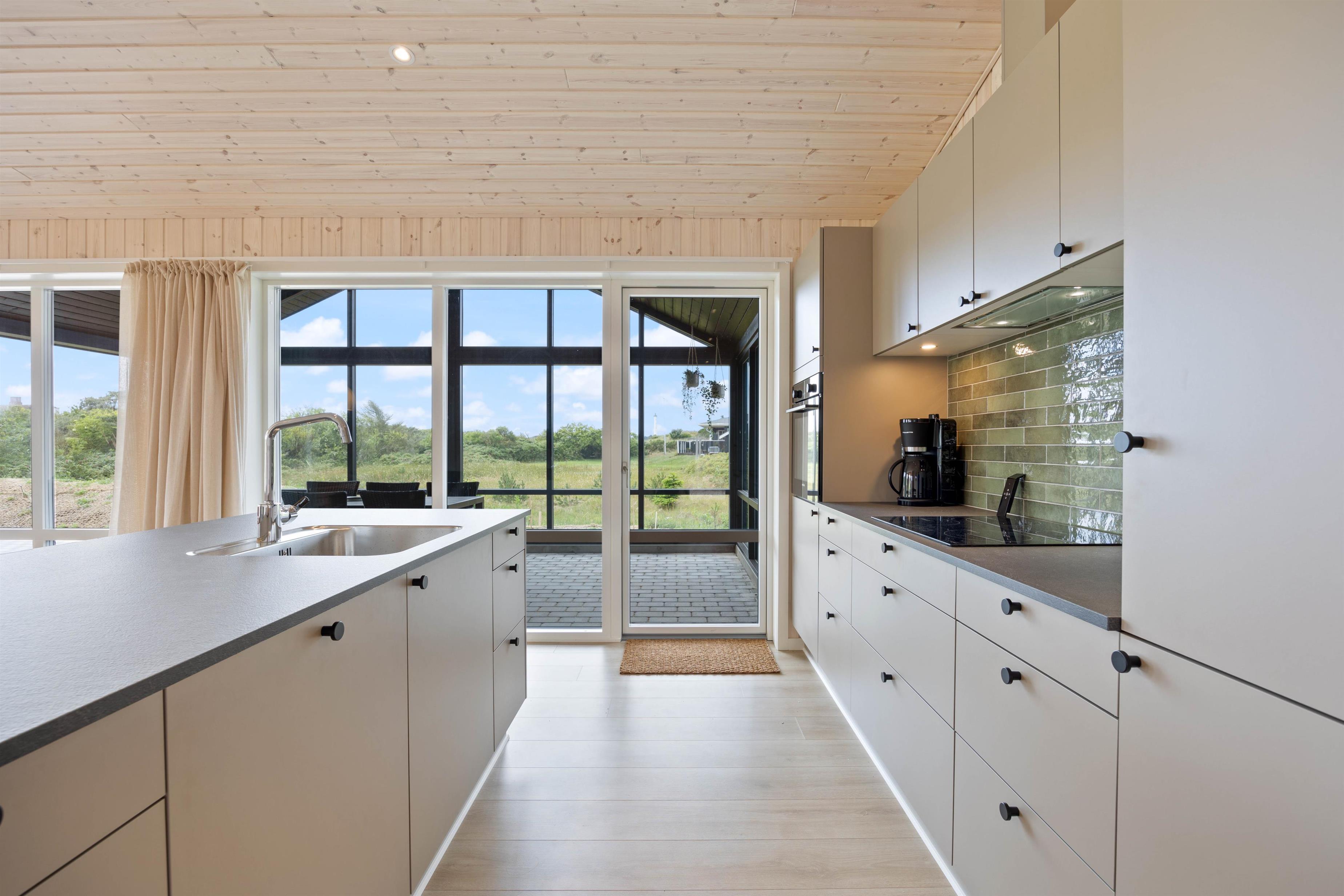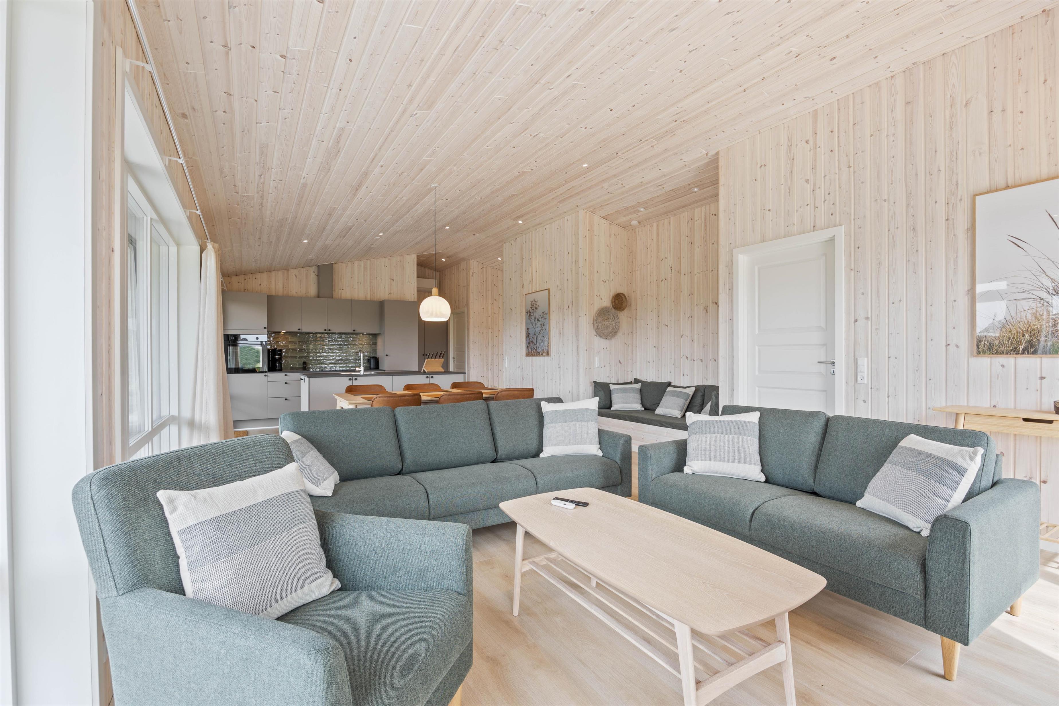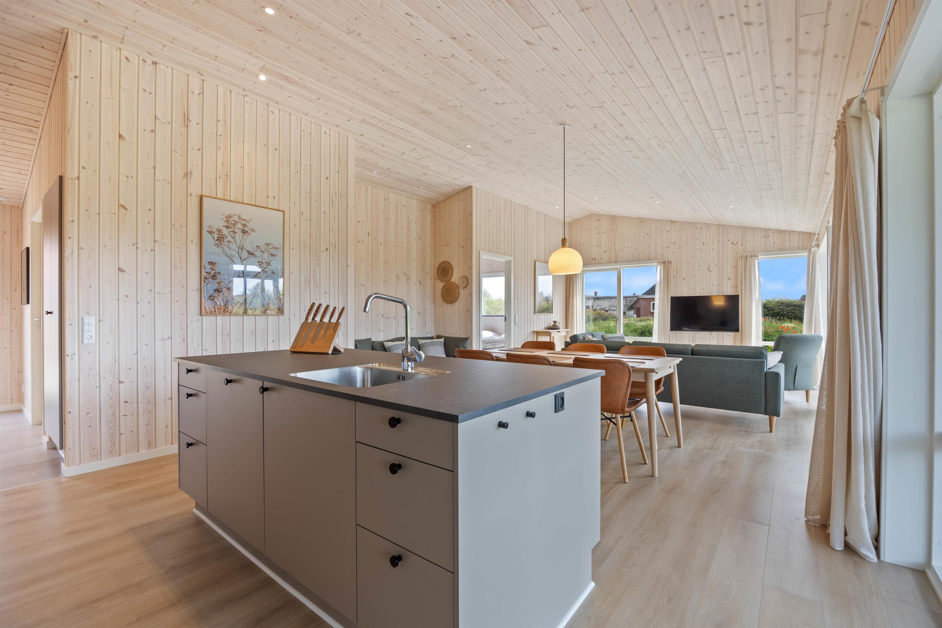 Det store køkkenalrum fremstår dejligt lyst og med plads til alle. I det åbne køkken kan I være fælles om madlavningen, mens andre kan spille brætspil ved køkkenbordet. Om aftenen kan I slå jer ned i stuen og streame en hyggelig familiefilm via sommerhusets chromecast.