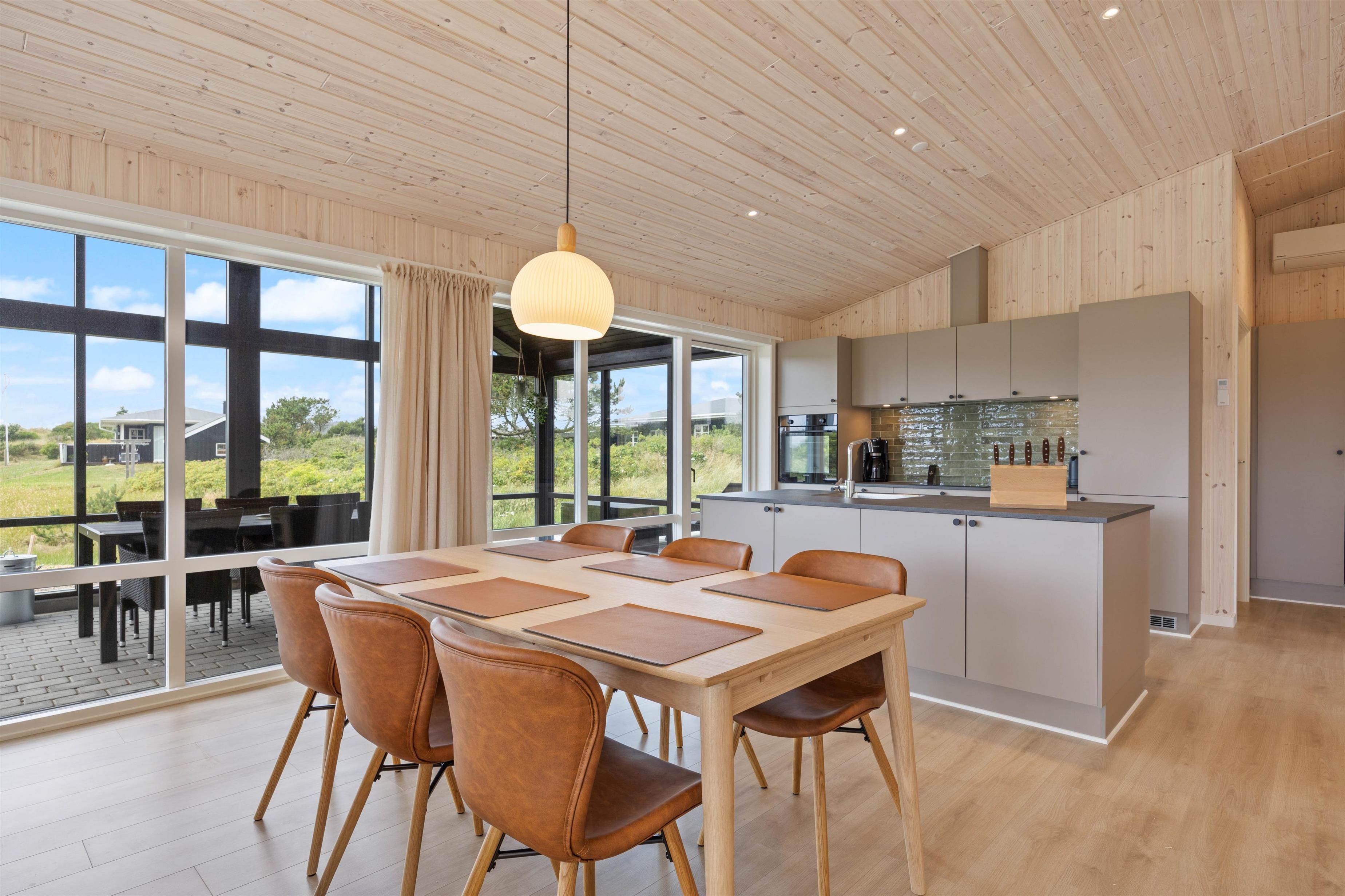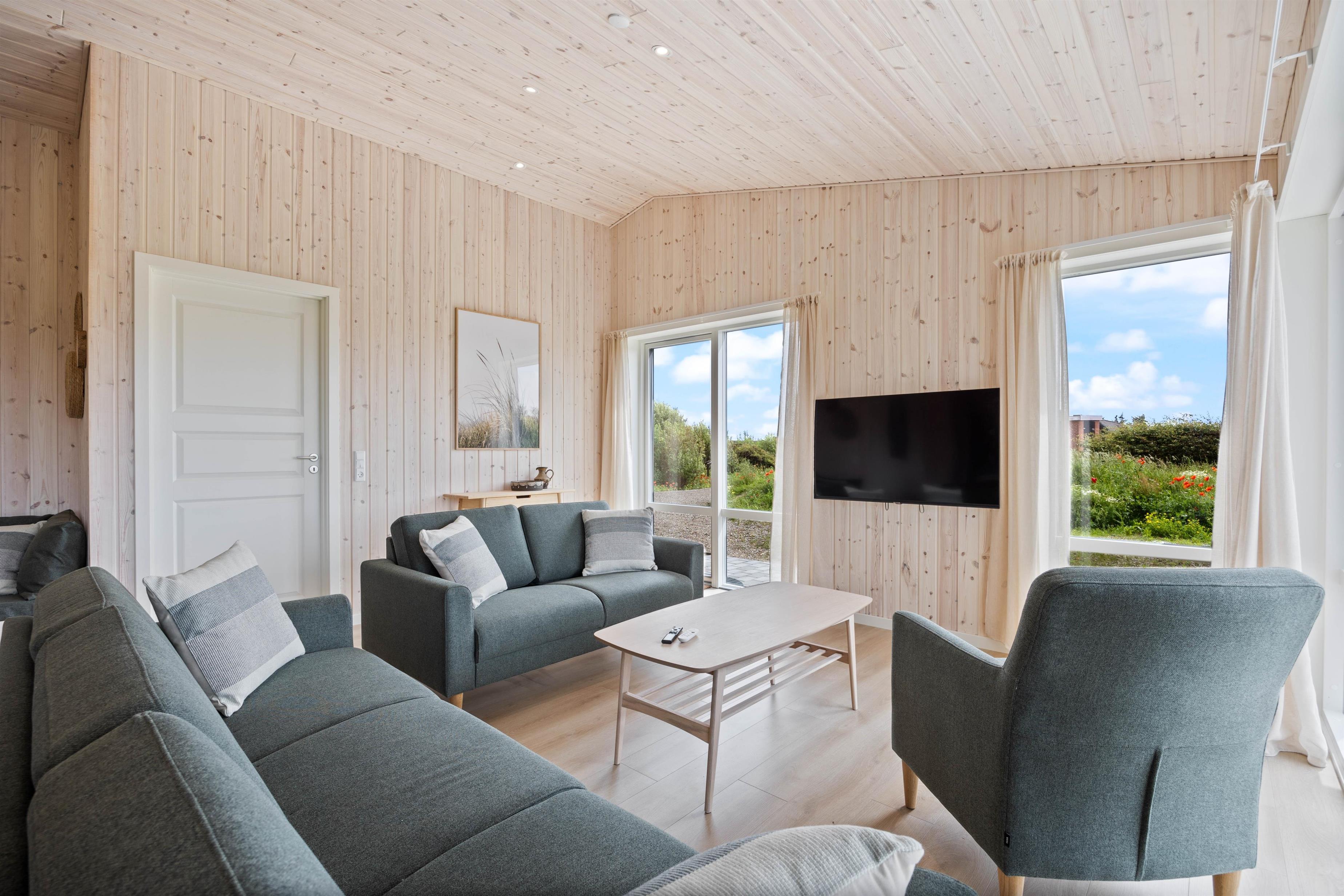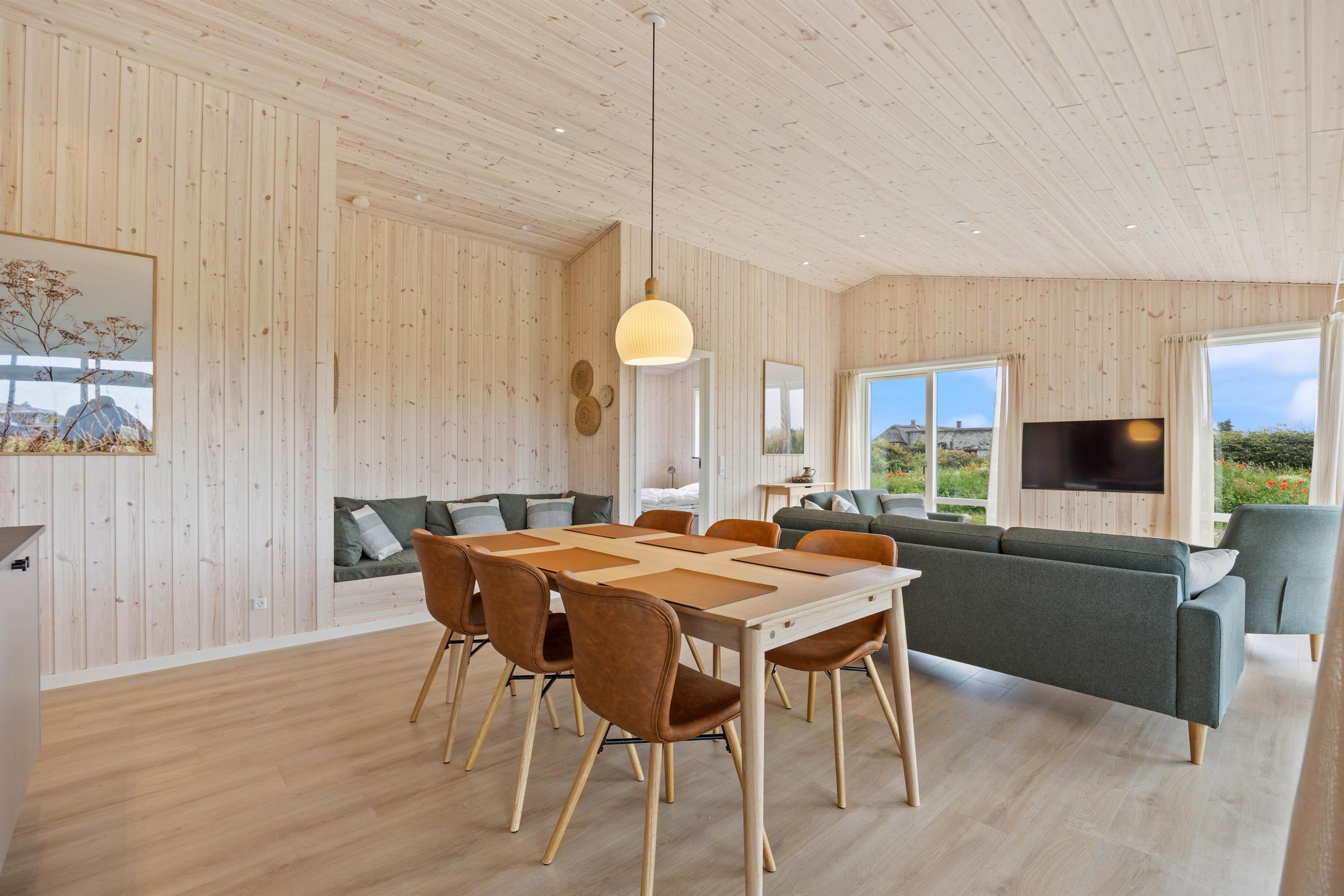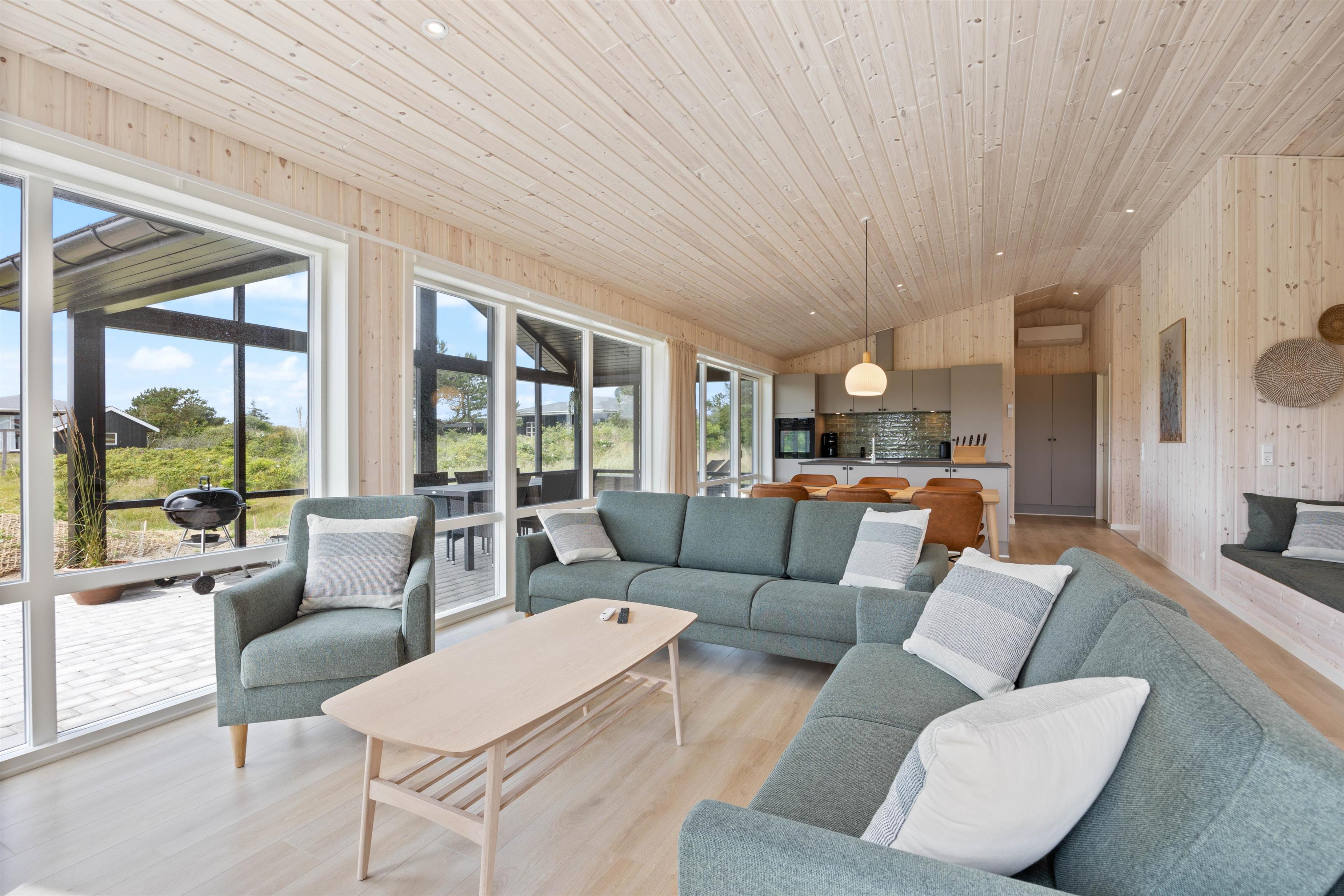 Det store køkkenalrum fremstår dejligt lyst og med plads til alle. I det åbne køkken kan I være fælles om madlavningen, mens andre kan spille brætspil ved køkkenbordet. Om aftenen kan I slå jer ned i stuen og streame en hyggelig familiefilm via sommerhusets chromecast.