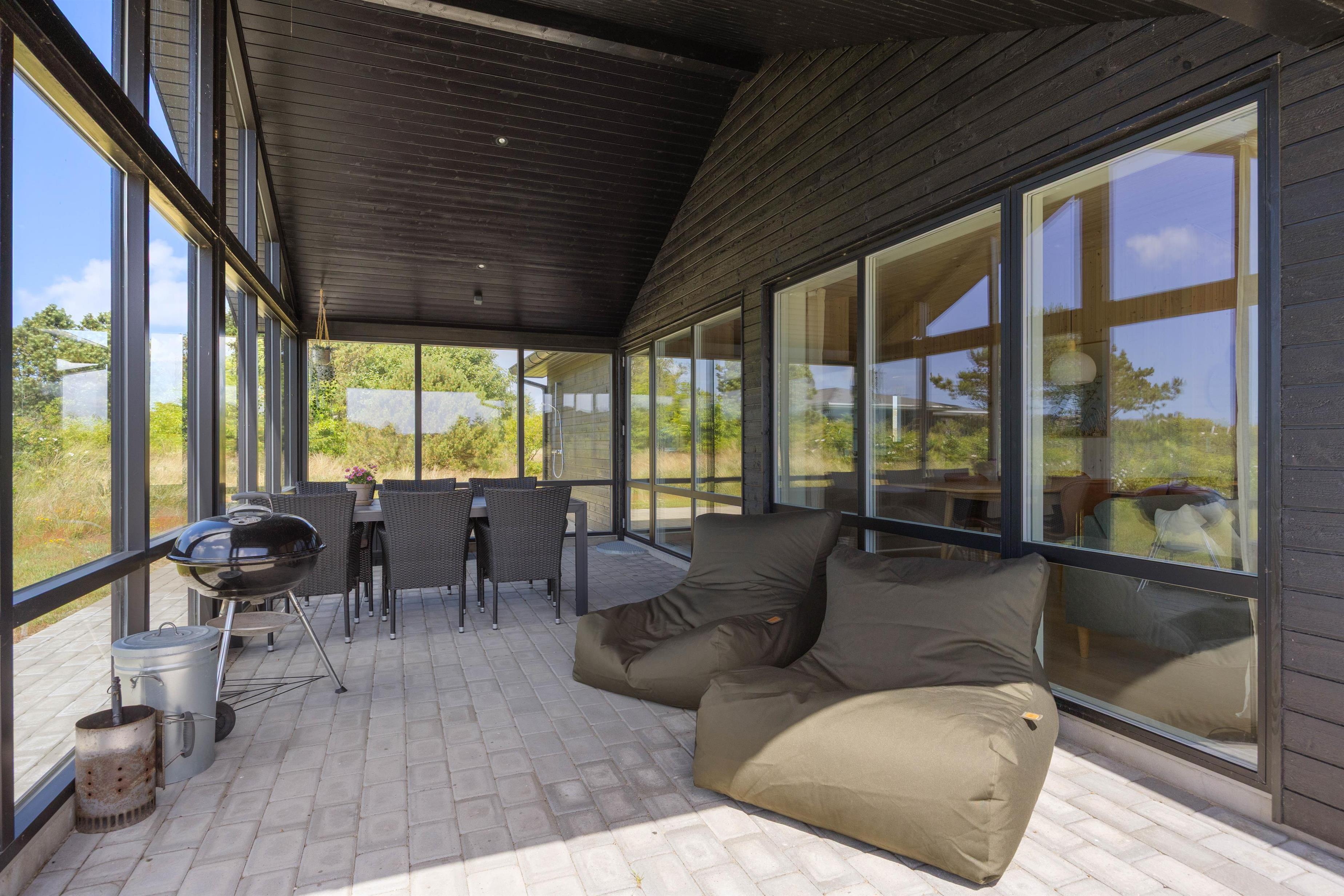 Fra køkkenet er der udgang til sommerhusets åbne udestue, hvor man kan sidde afskærmet og i læ i alt slags vejr under den overdækkede terrasse. Her kan I nyde en smagfuld middag, som I kan tilberede på sommerhusets grill. Slå jer ned i havemøblerne og solvognene på en solrig dag og få lidt kulør. På den åbne del af terrassen har I udsigt til den store naturgrund, som sommerhuset er beliggende på.