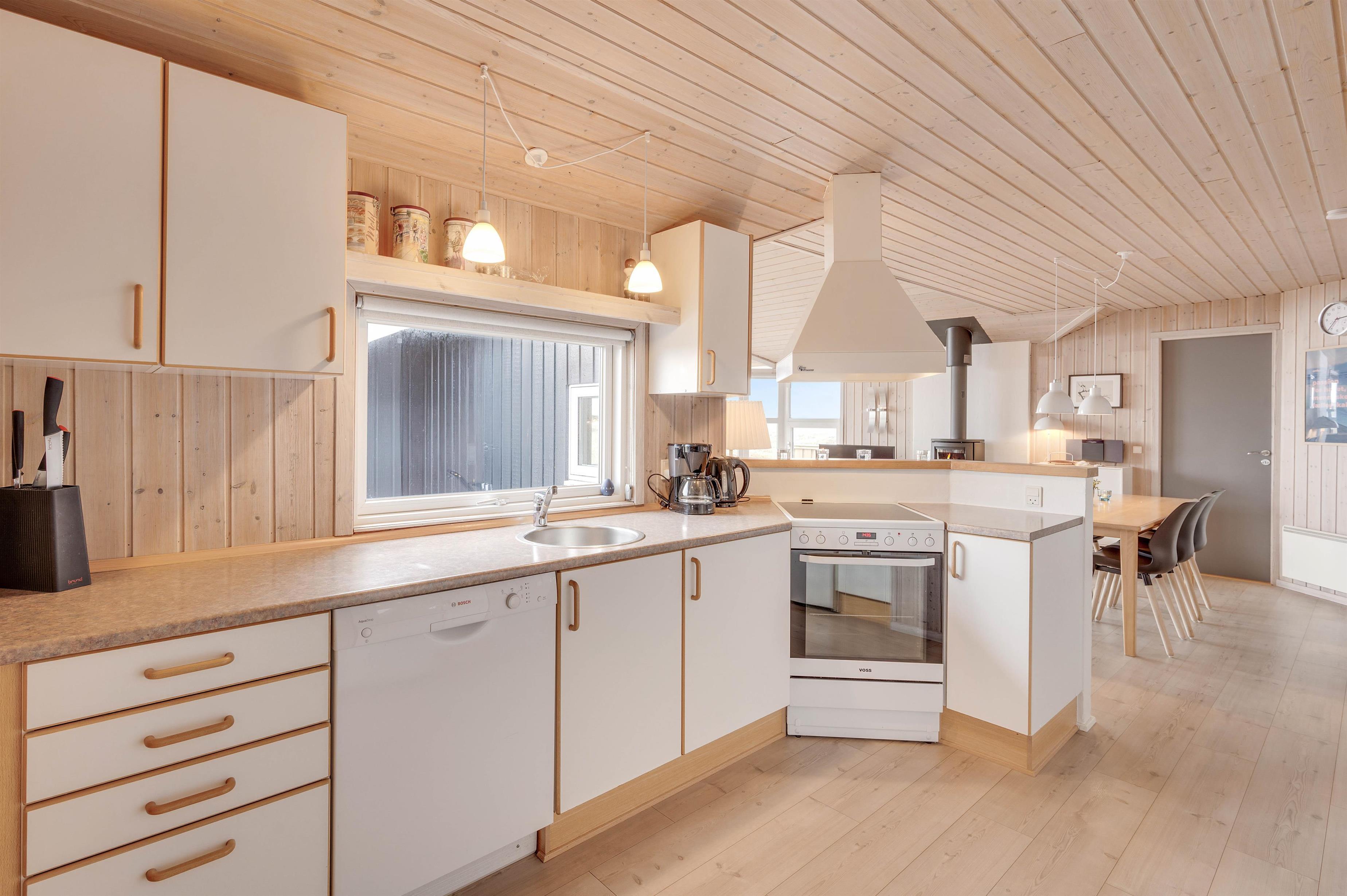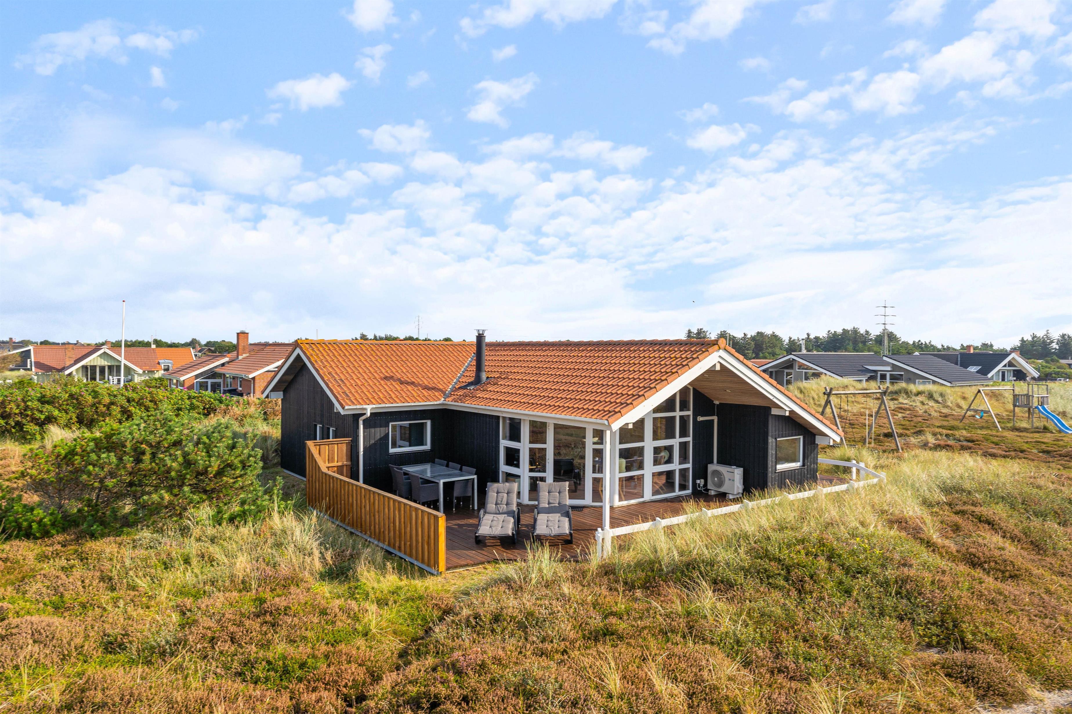 Huset er velindrettet og fra dets centrale opholdsrum er der smuk udsigt til hede og klitter. Stuen er indrettet med komfortable lædermøbler, gulvtæppe og brændeovn. Her er også er lille alkove til ungerne eller til middagsluren. Køkkenet har alt i hårde hvidevarer og står i åben forbindelse med stuen. De 3 værelser har alle boksmadrasser. Her er 2 badeværelser, et med boblebad og adgang til sauna.