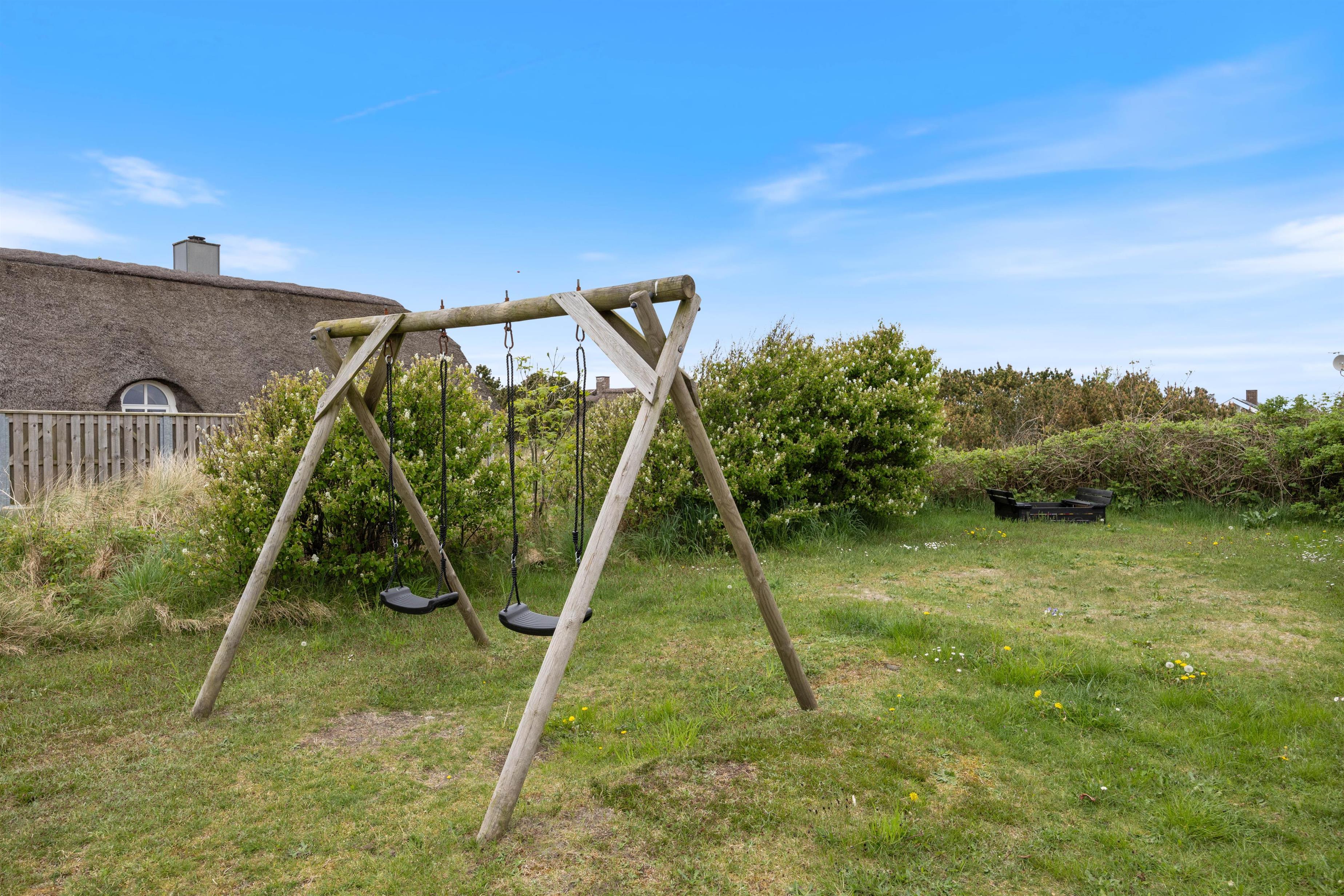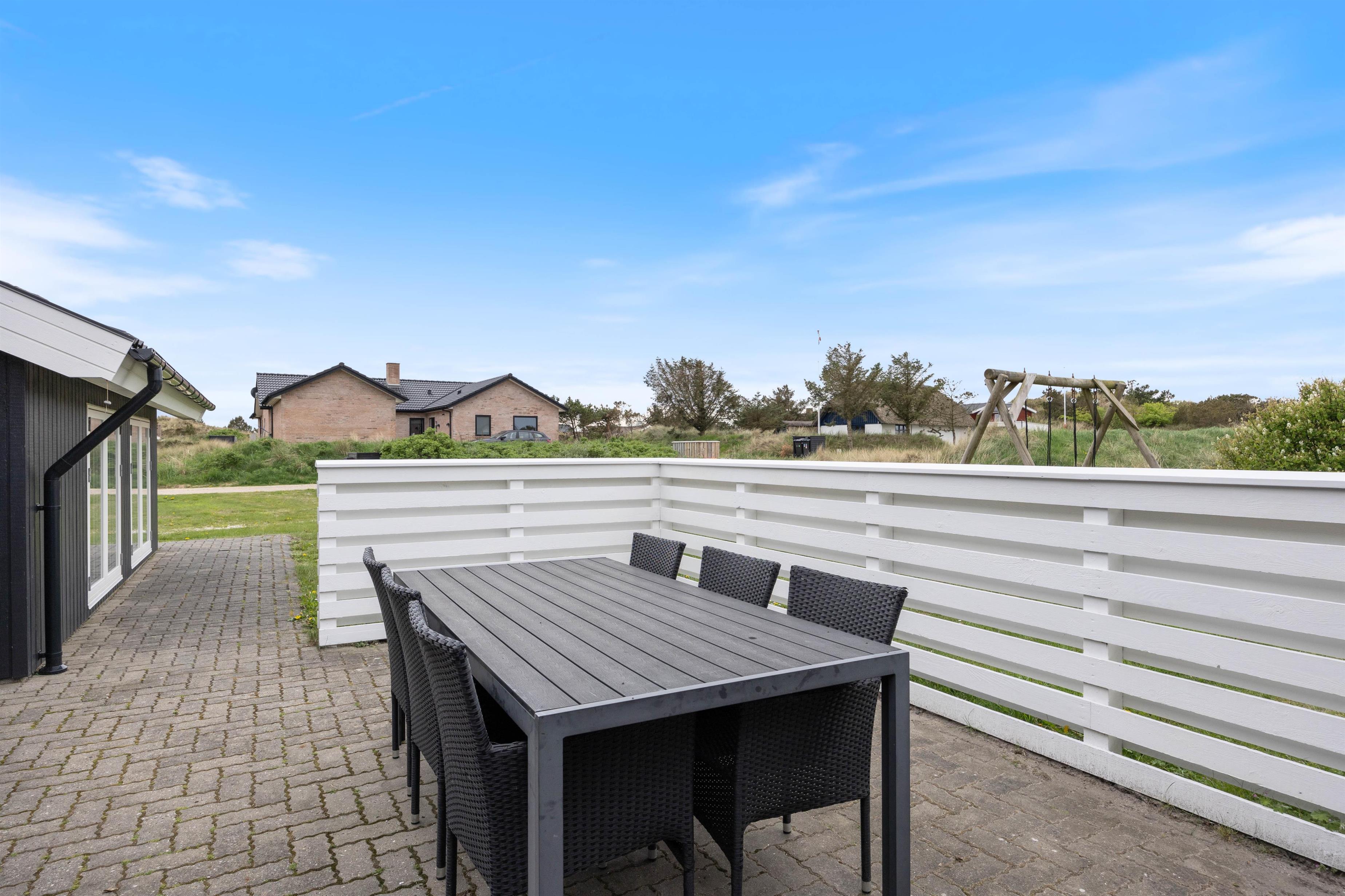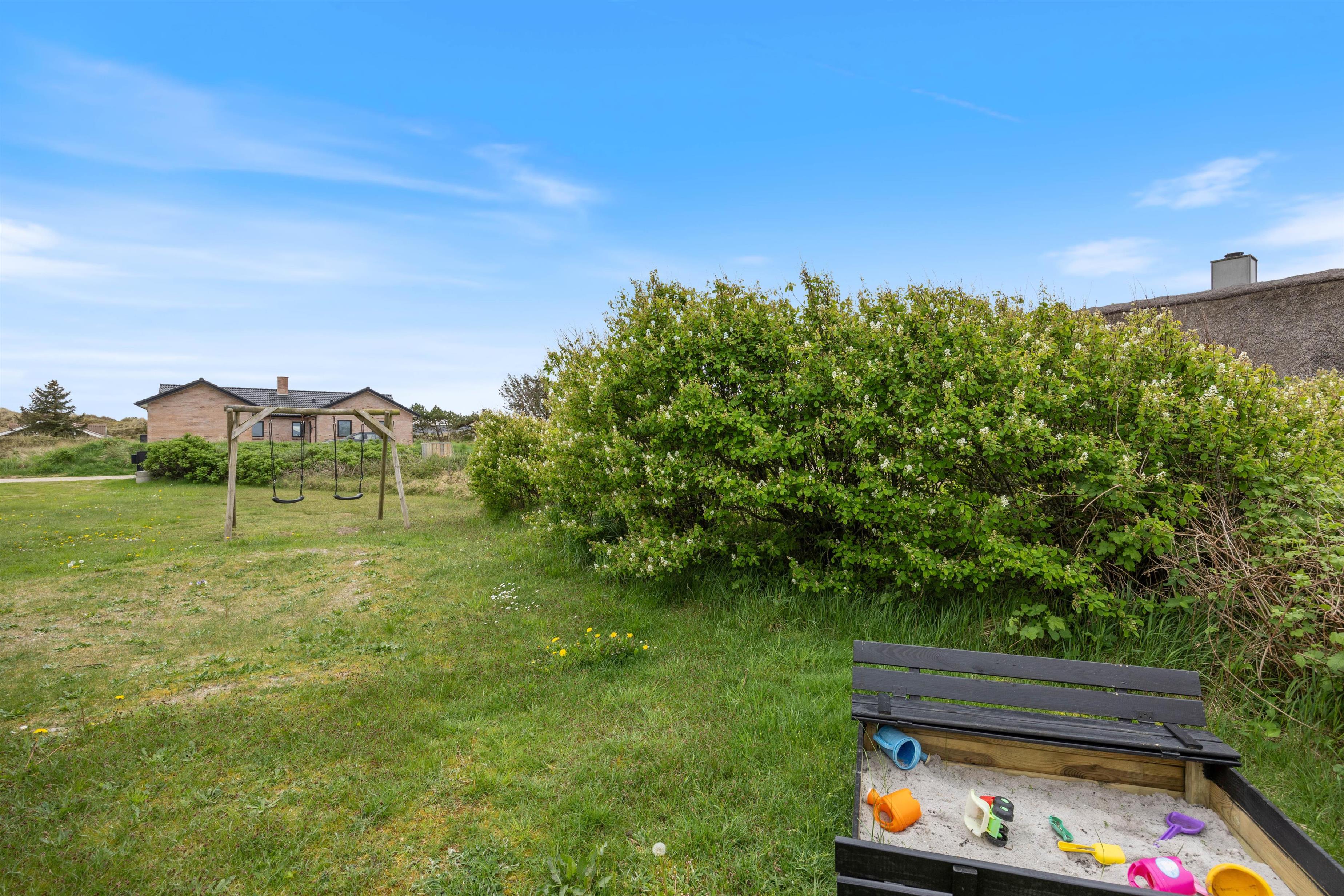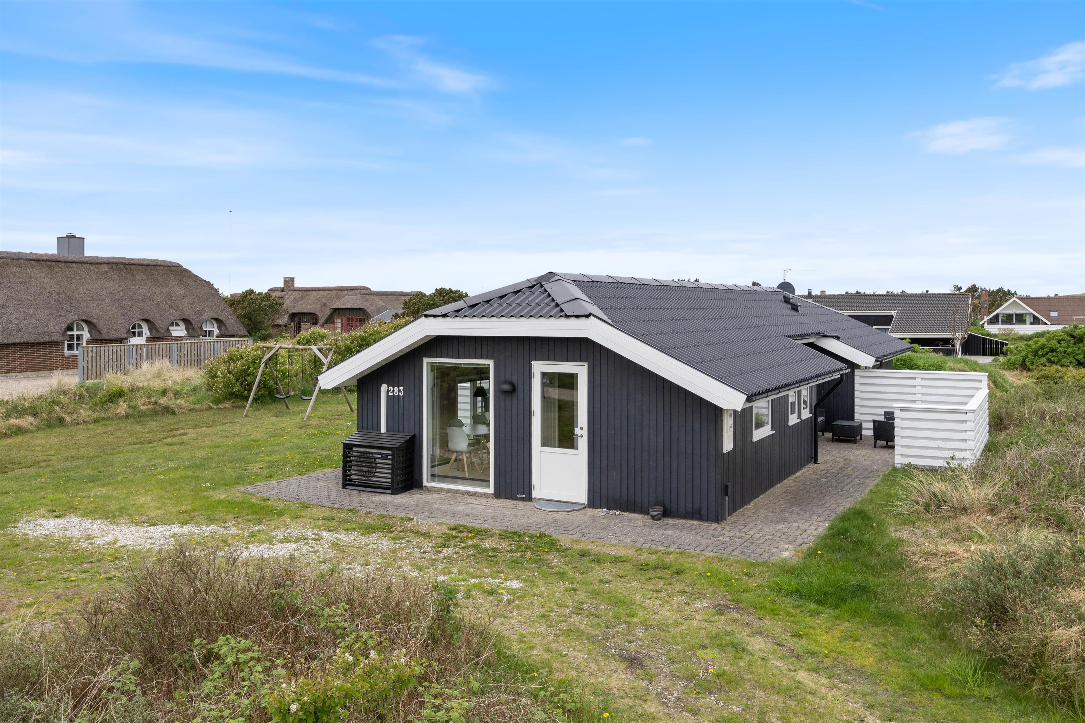 Sommerhuset på Fyrmarken 283 ligger på en naturgrund, godt 900 m fra Vesterhavet og har nogle skønne, delvist afskærmede terrasser, hvor I kan sætte jer med en god bog og lidt koldt at drikke og suge solens stråler til jer. Om aftenen kan I tænde op i grillen og tilberede en lækker middag i aftensolen, mens de yngste i familien leger i sandkassen eller på gyngestativet i haven.