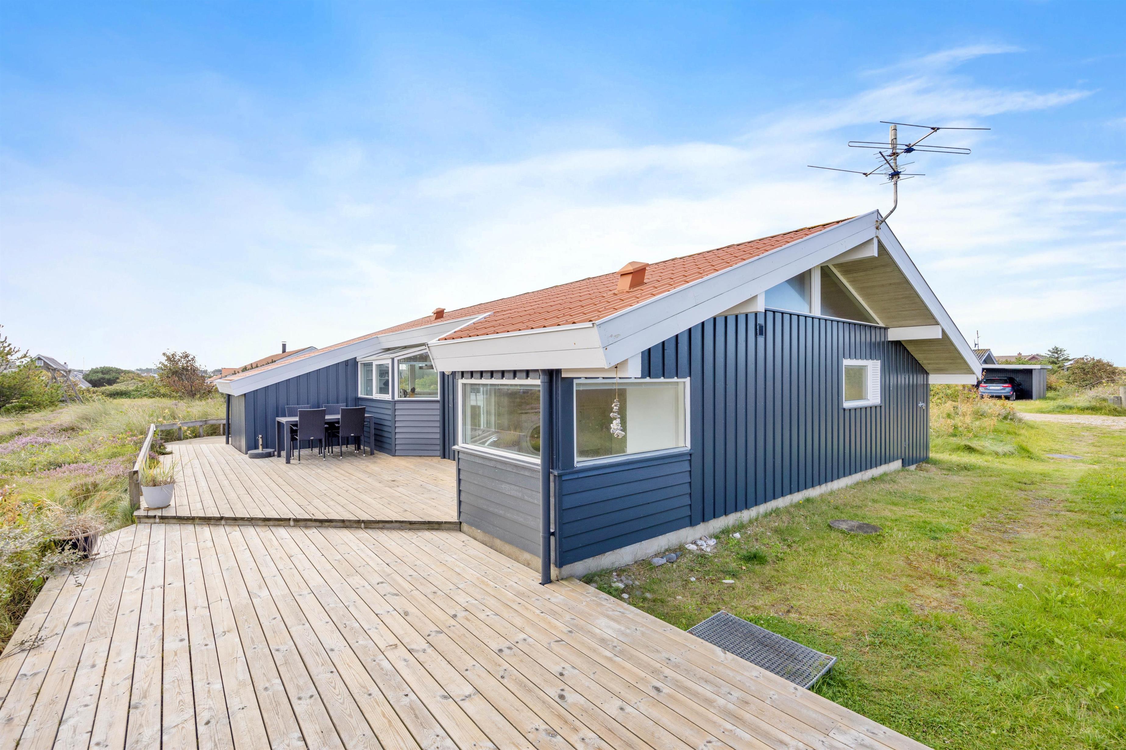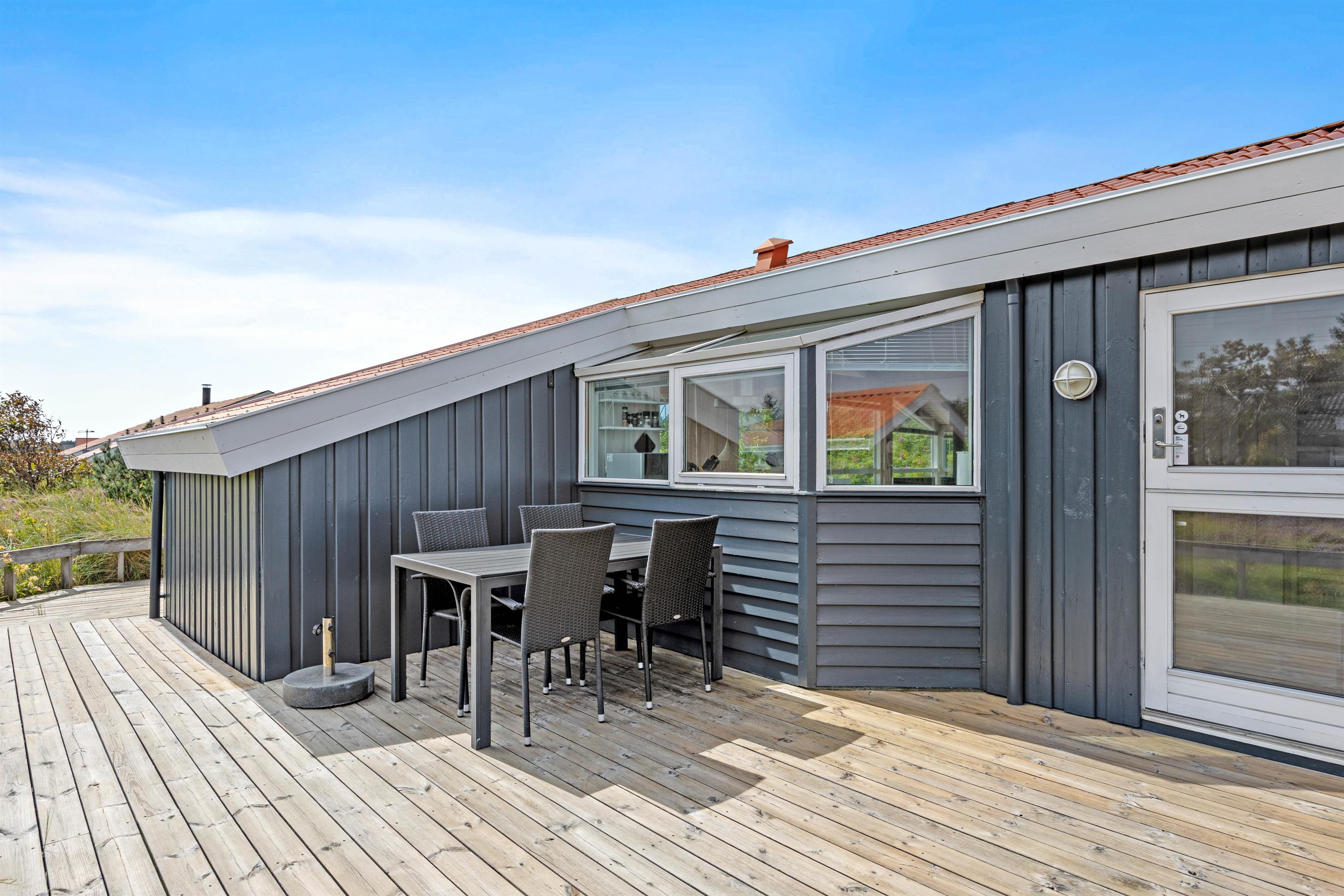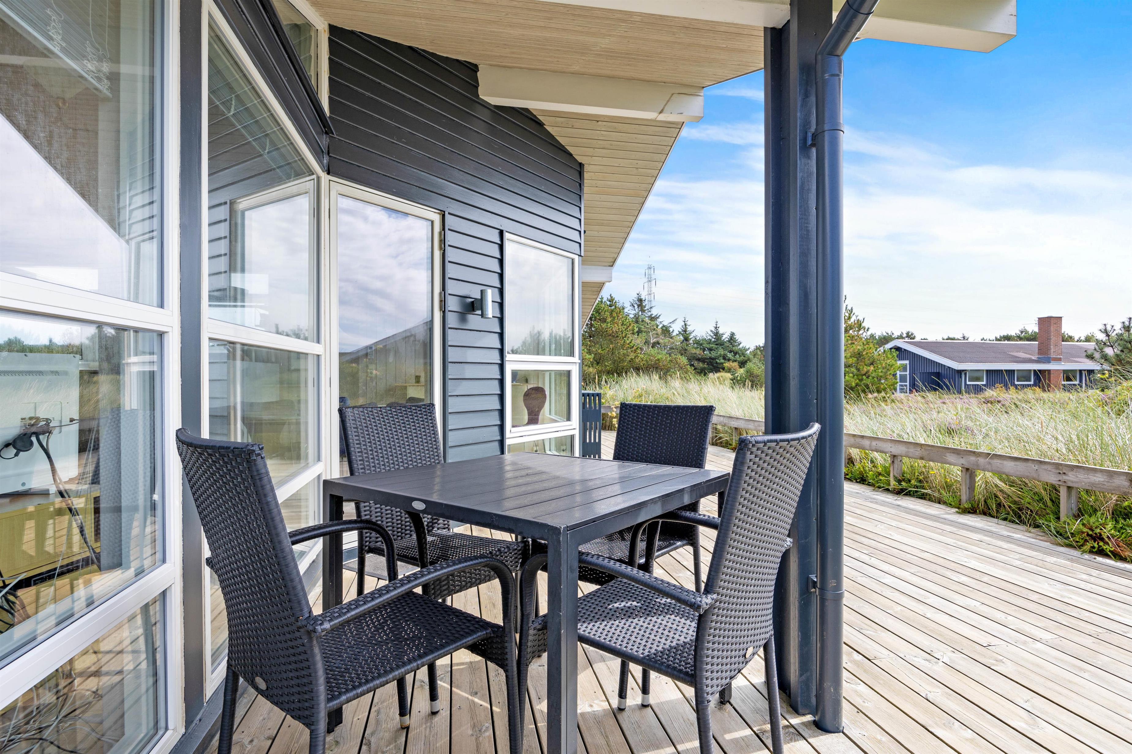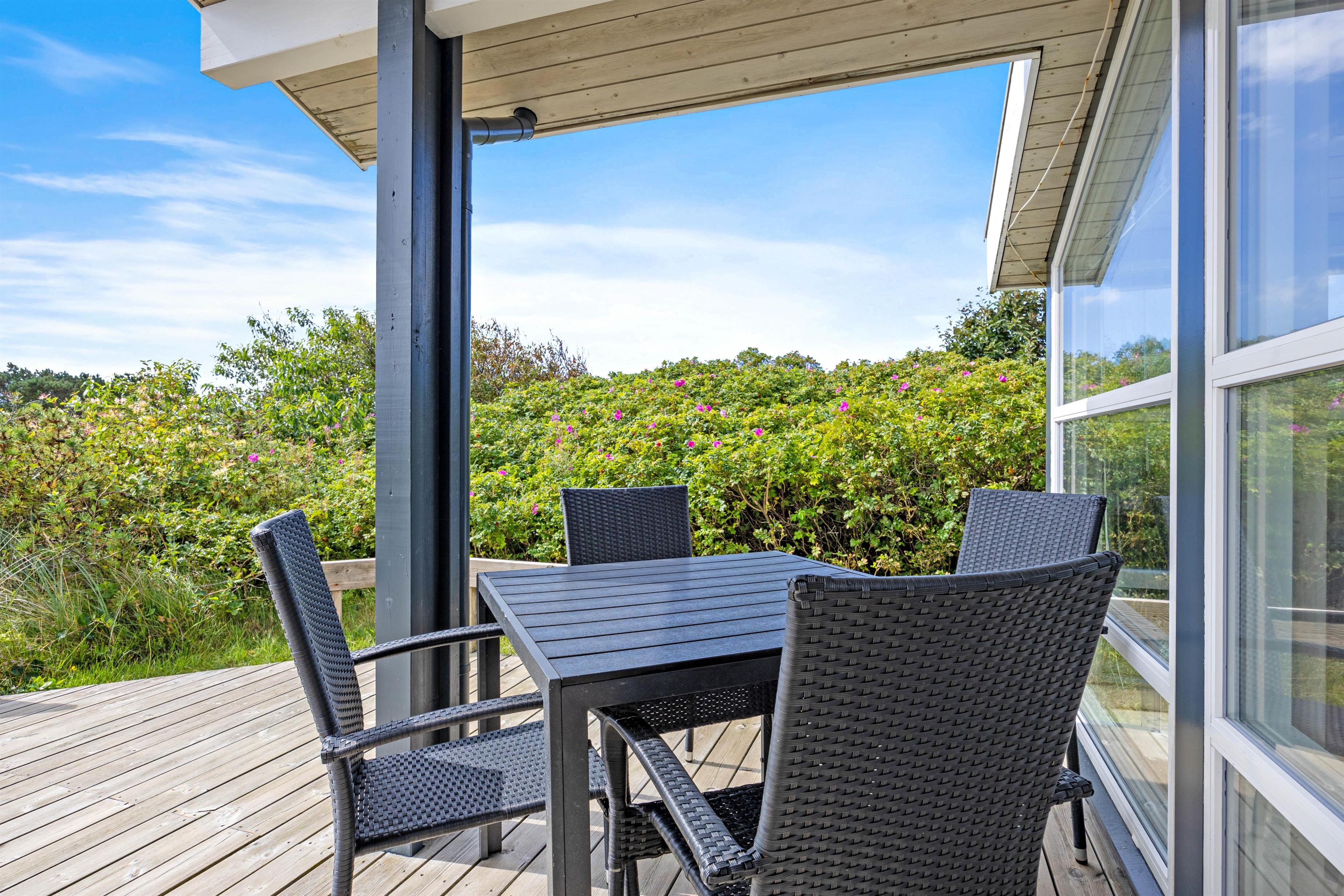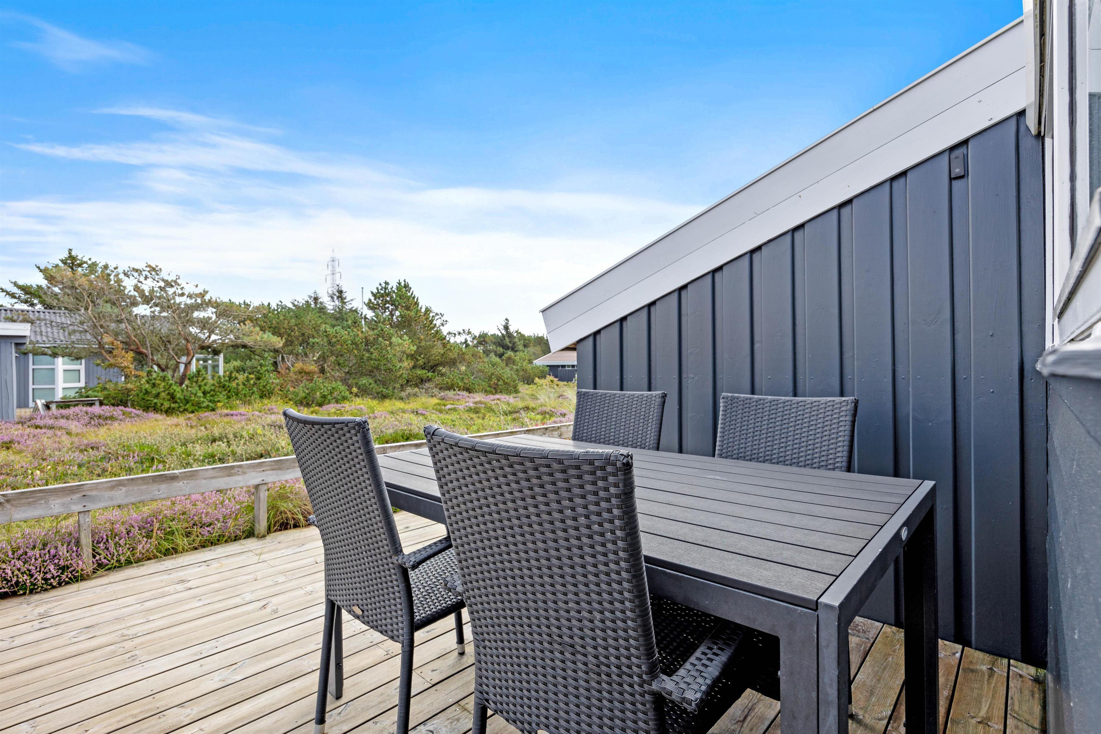 På træterrassen kan I nyde et lækkert grillmåltid fra sommerhusets gasgrill. Ellers kan I blot nyde det dejlige vejr i en solseng eller under parasollen i havemøblerne. Her er det helt oplagt at tilbringe så mange af dagene som muligt, for at opleve den vestjyske natur.