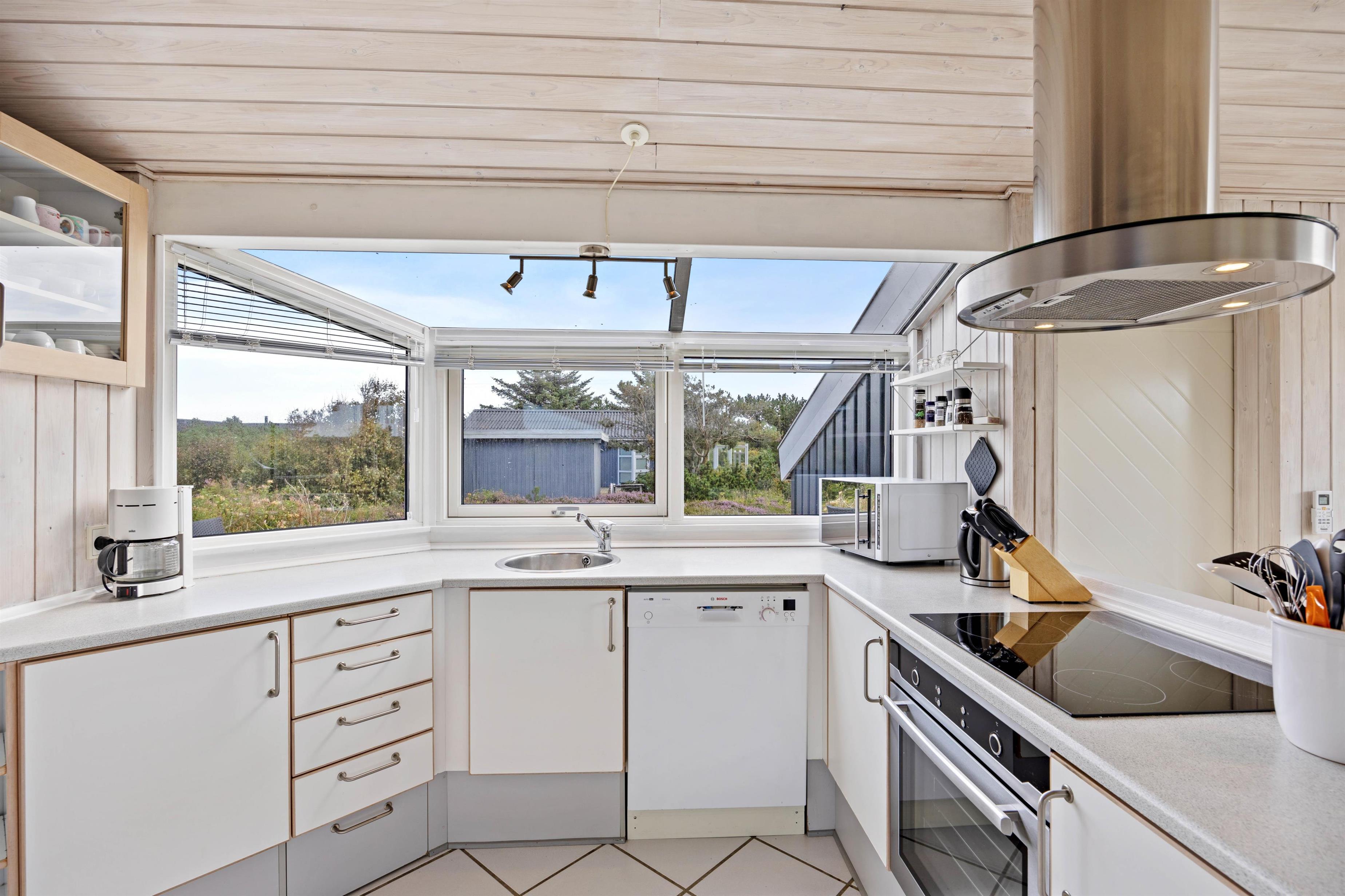 Efter et behageligt bad i spabadet, kan I med fordel nyde det åbne og lyse køkkenalrum, som byder til hyggeligt samtaler, afslapning i sofaen foran brændeovnen og lækre måltid fra det funktionelle køkken. I køkkenet er der desuden en mikroovn, opvaskemaskine og en 40 liter fryser, som er medvirkende til at gøre madlavningen simpel.