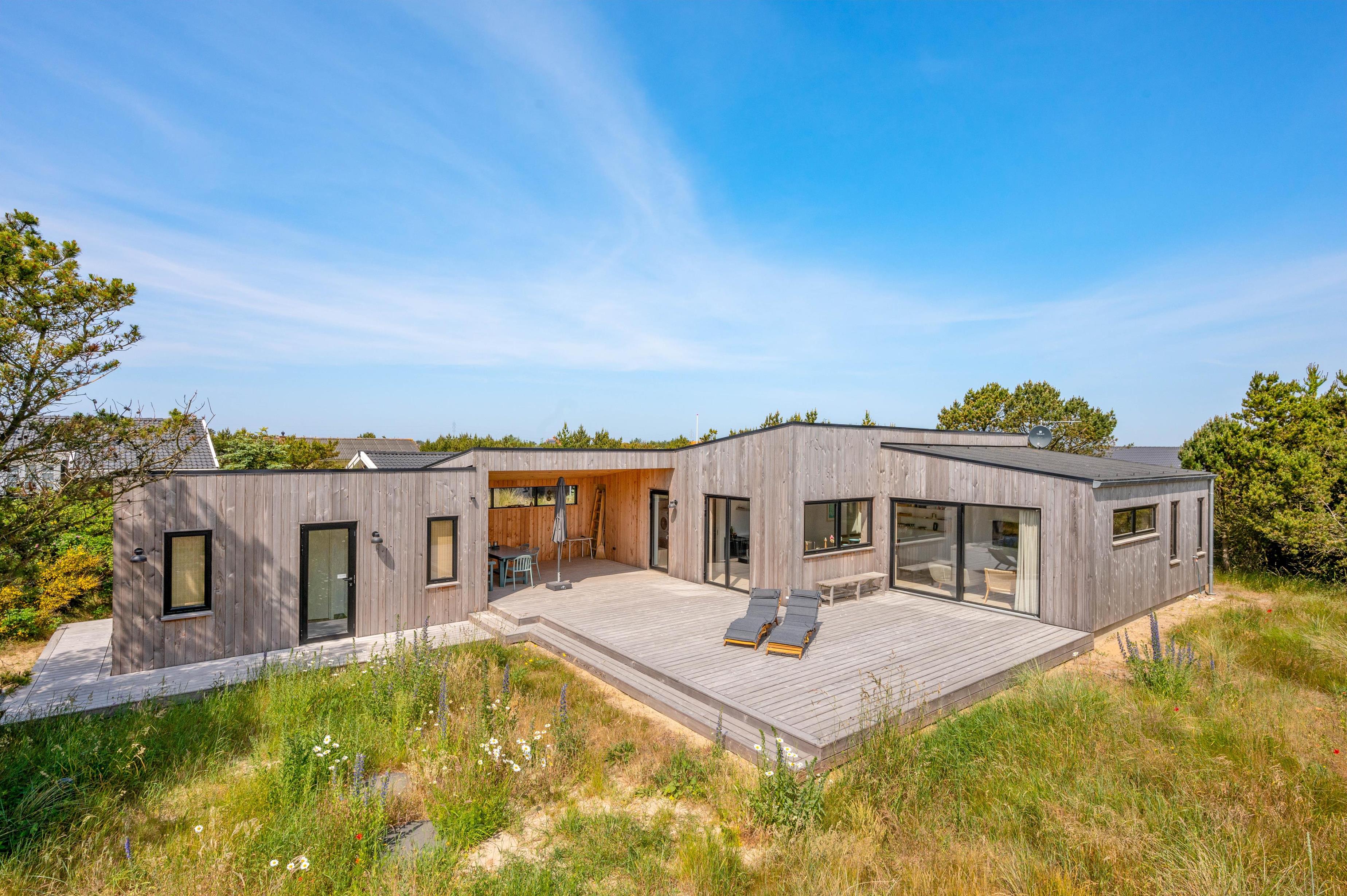 Dette moderne sommerhus ligger i skønne omgivelser på den vestjyske hede, som også er trukket med ind i selve sommerhuset. Sommerhuset er opført i naturmaterialer og i rolige farver, som skaber en rolig og hjemlig atmosfære i feriehuset.