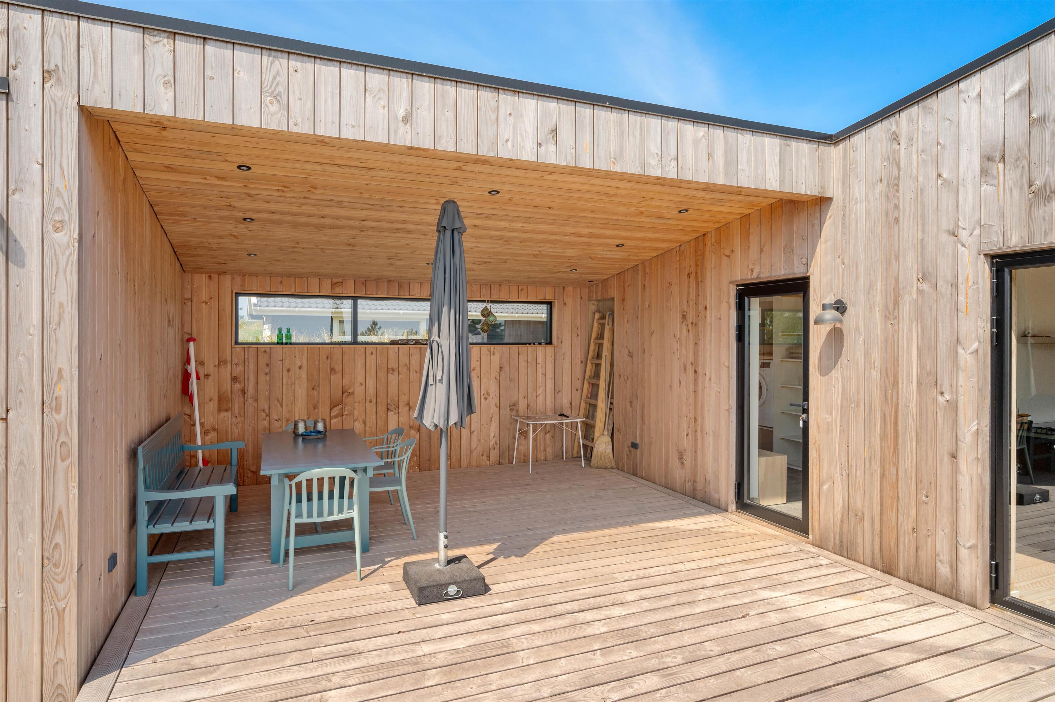 På de lune sommeraftener kan I nyde aftensolen på den skønne træterrasse, som også er delvist overdækket. Her finder I skønne havemøbler samt liggestole, som hører ferien til. Tilbered en lækker fisk på sommerhusets tilhørende gasgrill og nyd solnedgangen ved Vesterhavet, der ligger en lille gåtur herfra. Fra feriehuset kan I også få øje på den hyggelige lille havn i Nr. Lyngvig, som også klart er et besøg værd - og kun ligger 2 minutters gang væk.