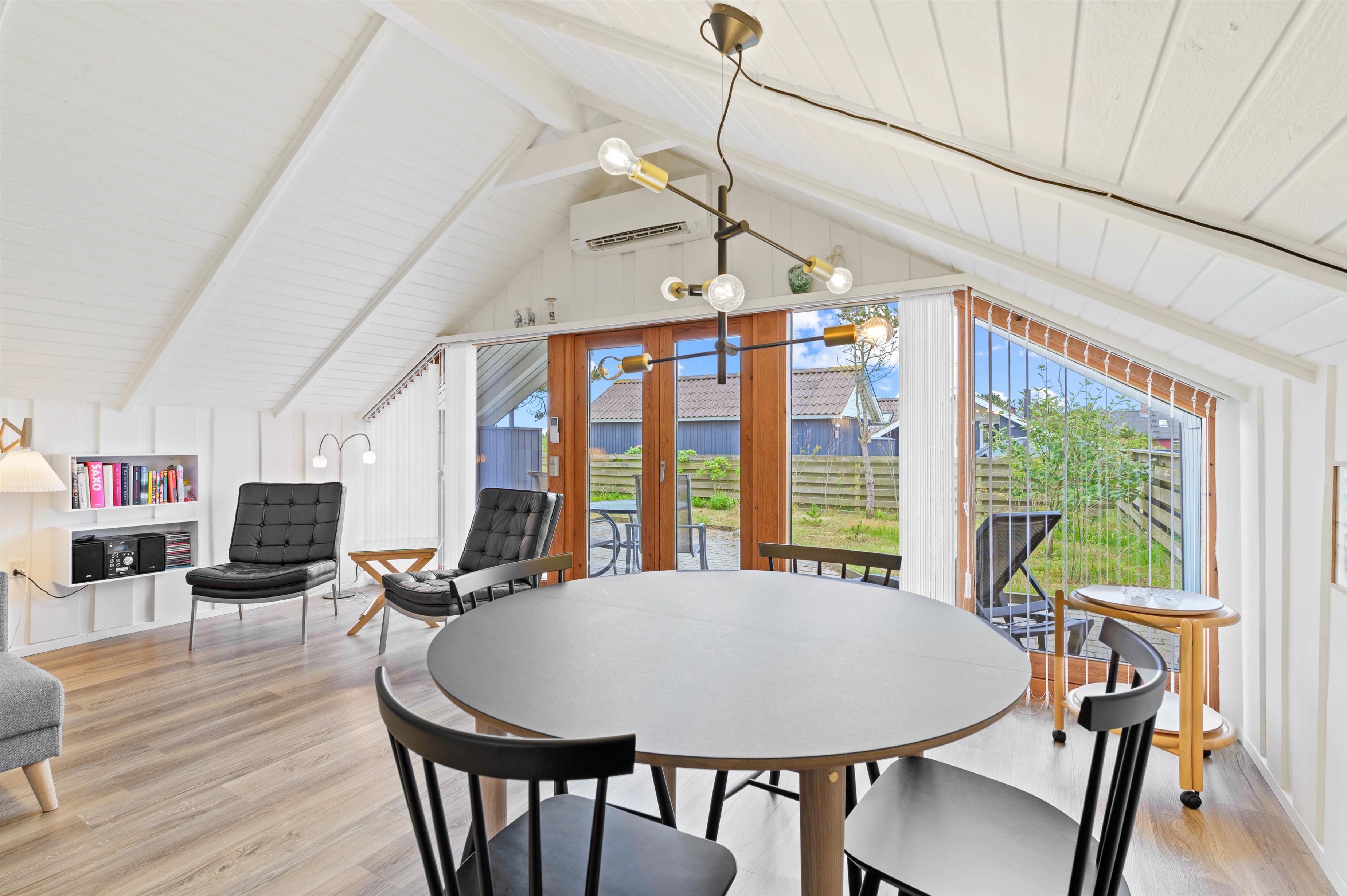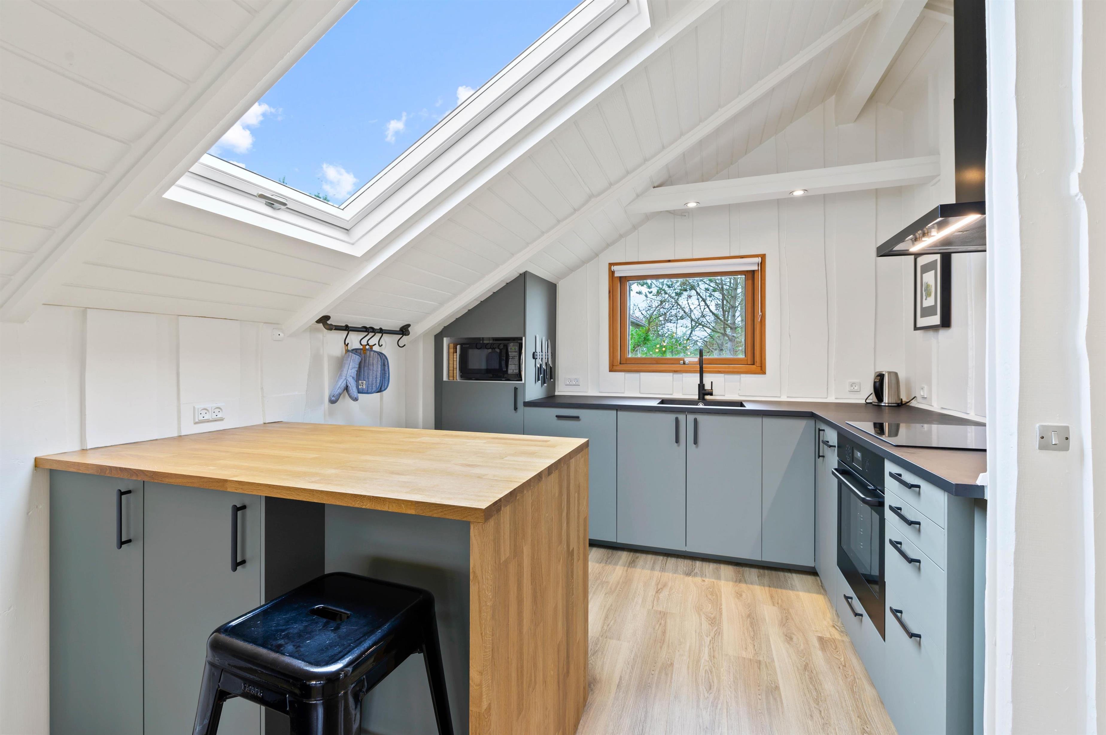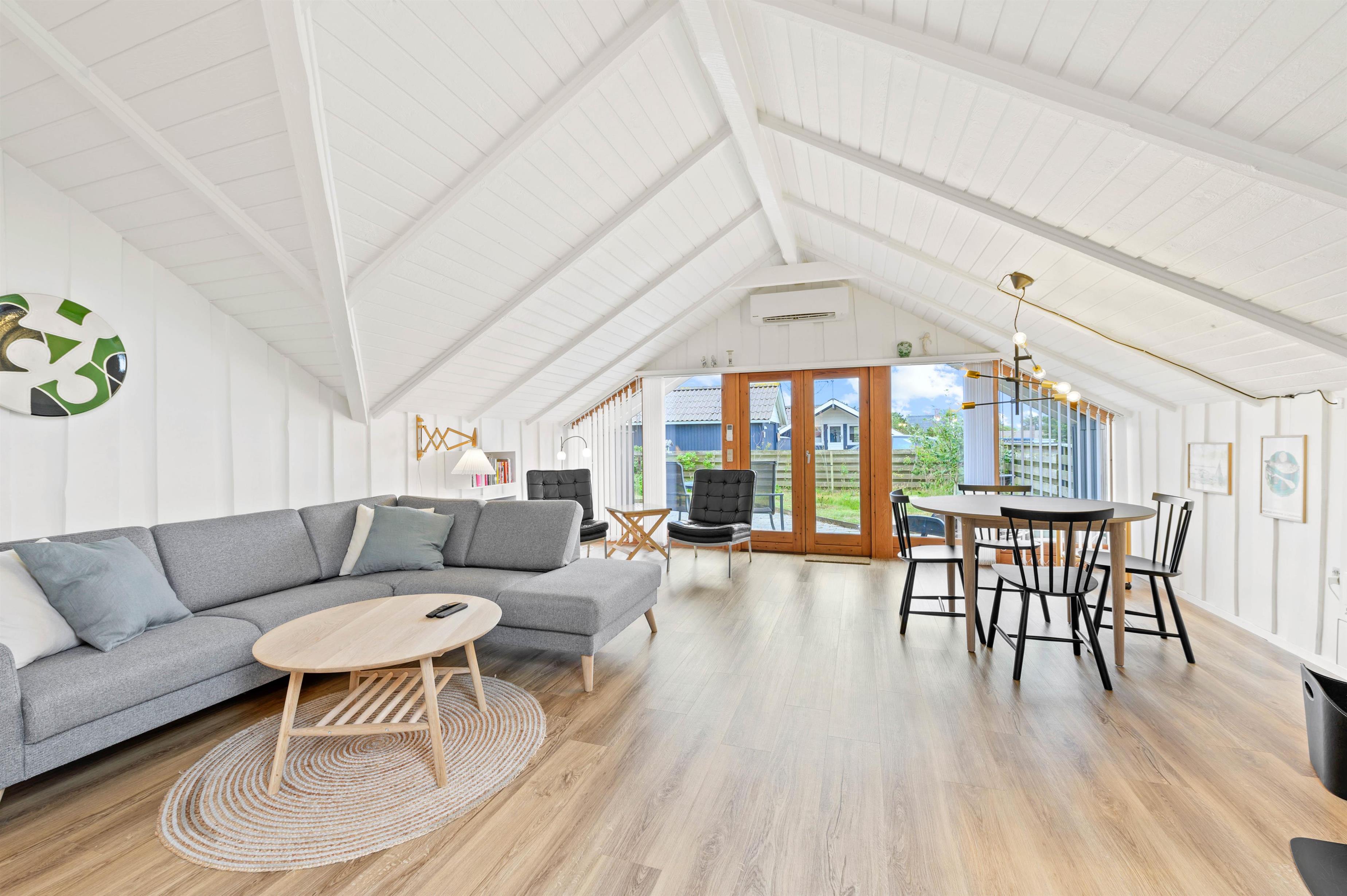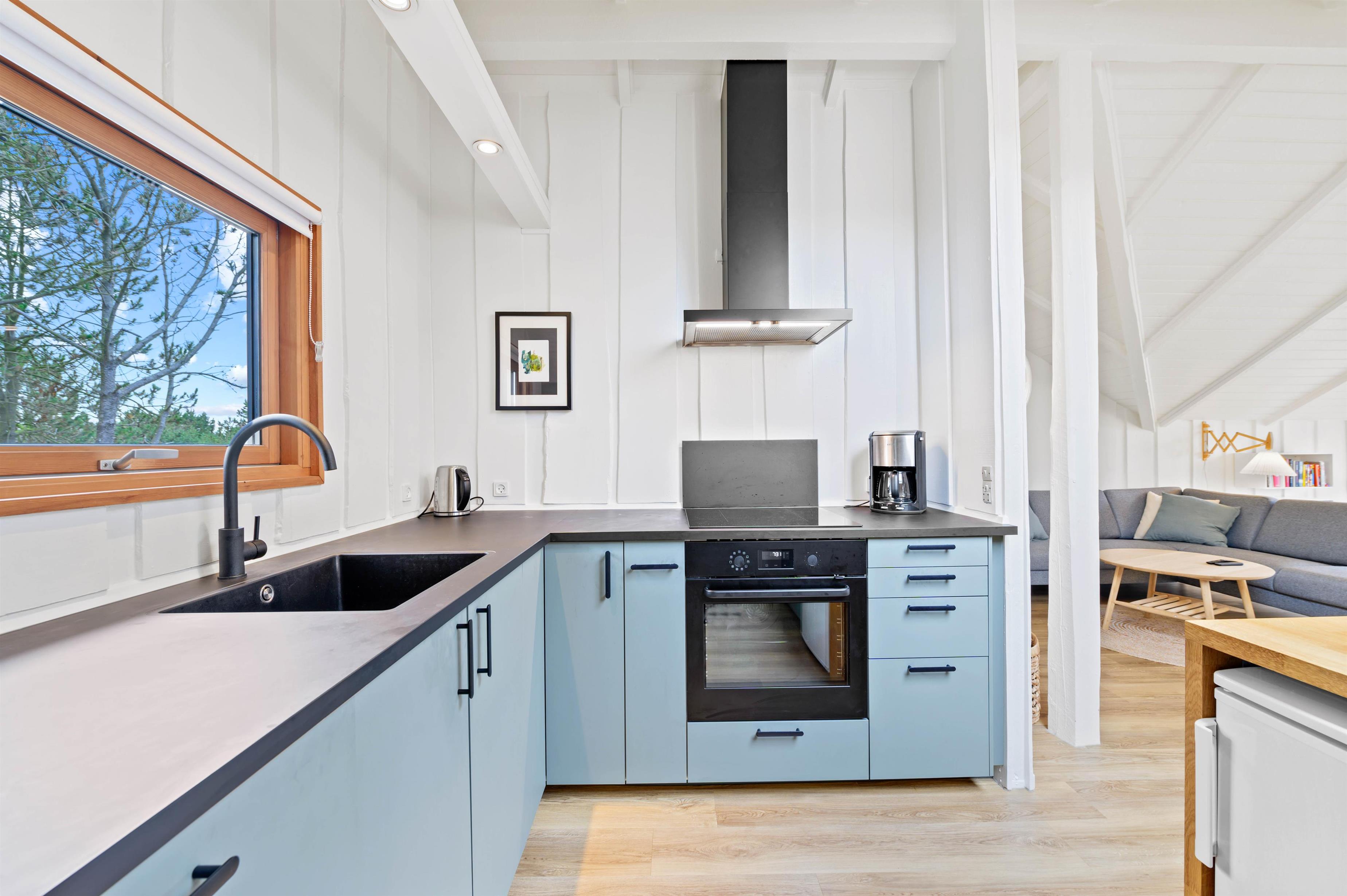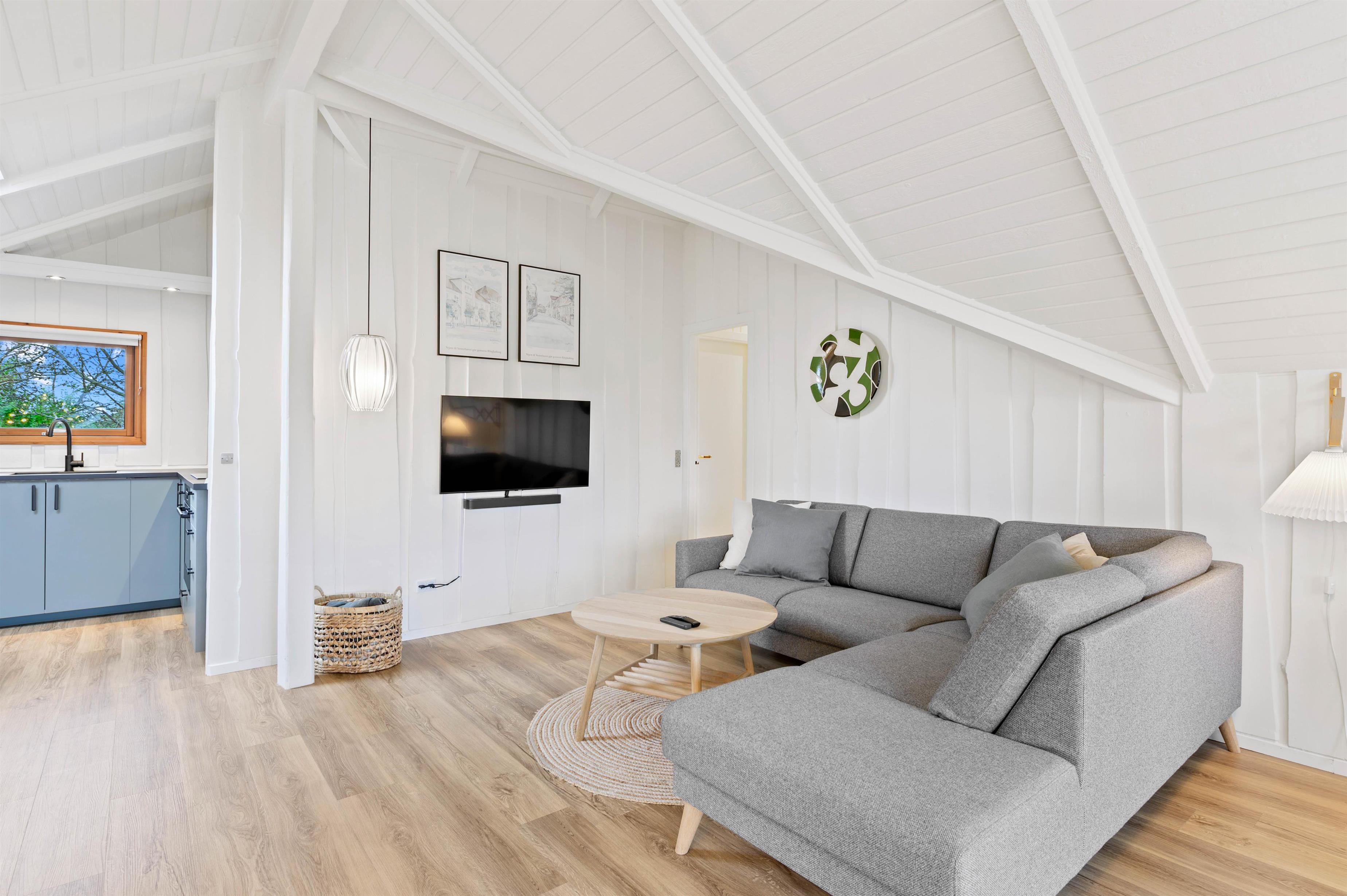 Hjertet i det 70 kvadratmeter store sommerhus på Fyrmarken 78 i Nr. Lyngvig er det hyggelige alrum. Her ligger køkkenet, stuen og spisepladsen i åben forbindelse, og derfor er rammen sat for gode stunder med madlavning, spil og film. Her er også Chromecast, så I kan streame jeres yndlingsfilm i tv’et.