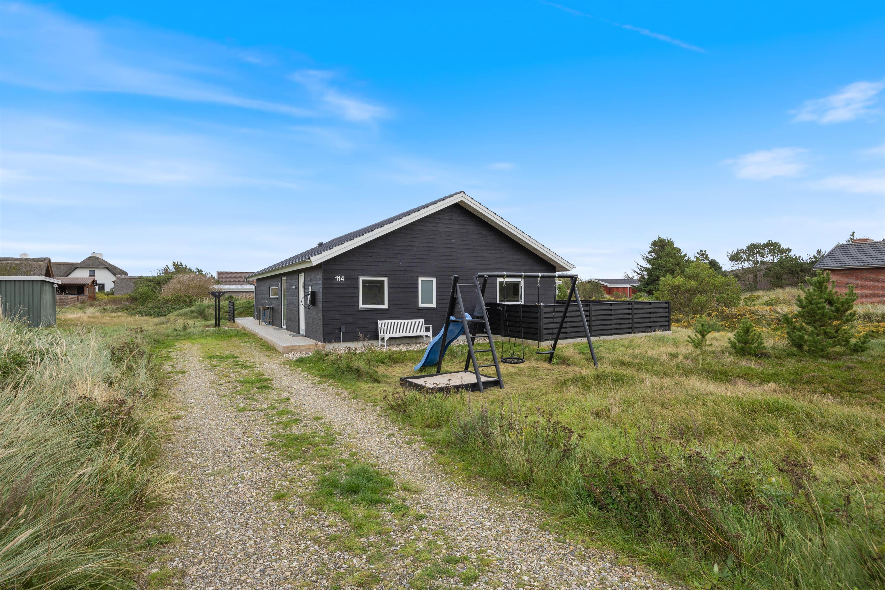 På Anker Eskildsens Vej 114 ligger dette skønne, i år 2019 byggede feriehus, kort vej fra en lille fjordhavn. Huset er rigtig veludstyret, og blandt faciliteterne finder I bl.a. en sauna. Alt i alt er huset hyggeligt og moderne indrettet med plads til 6 personer. Der er kort vej til havnebyen Hvide Sande.