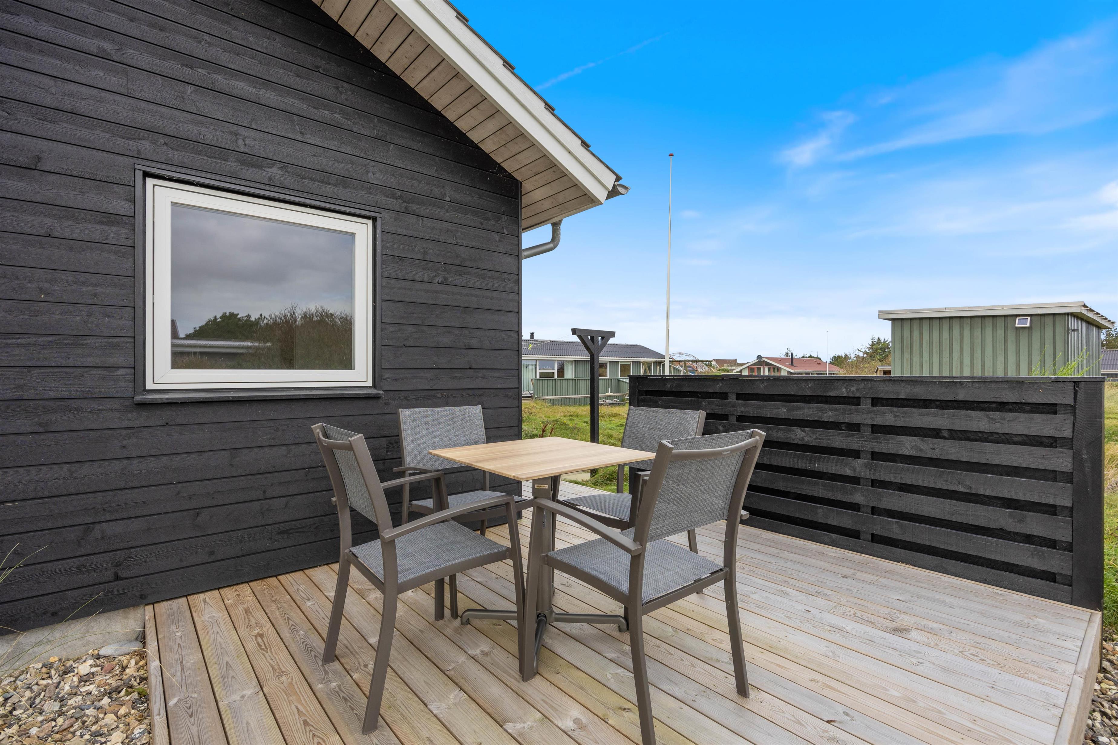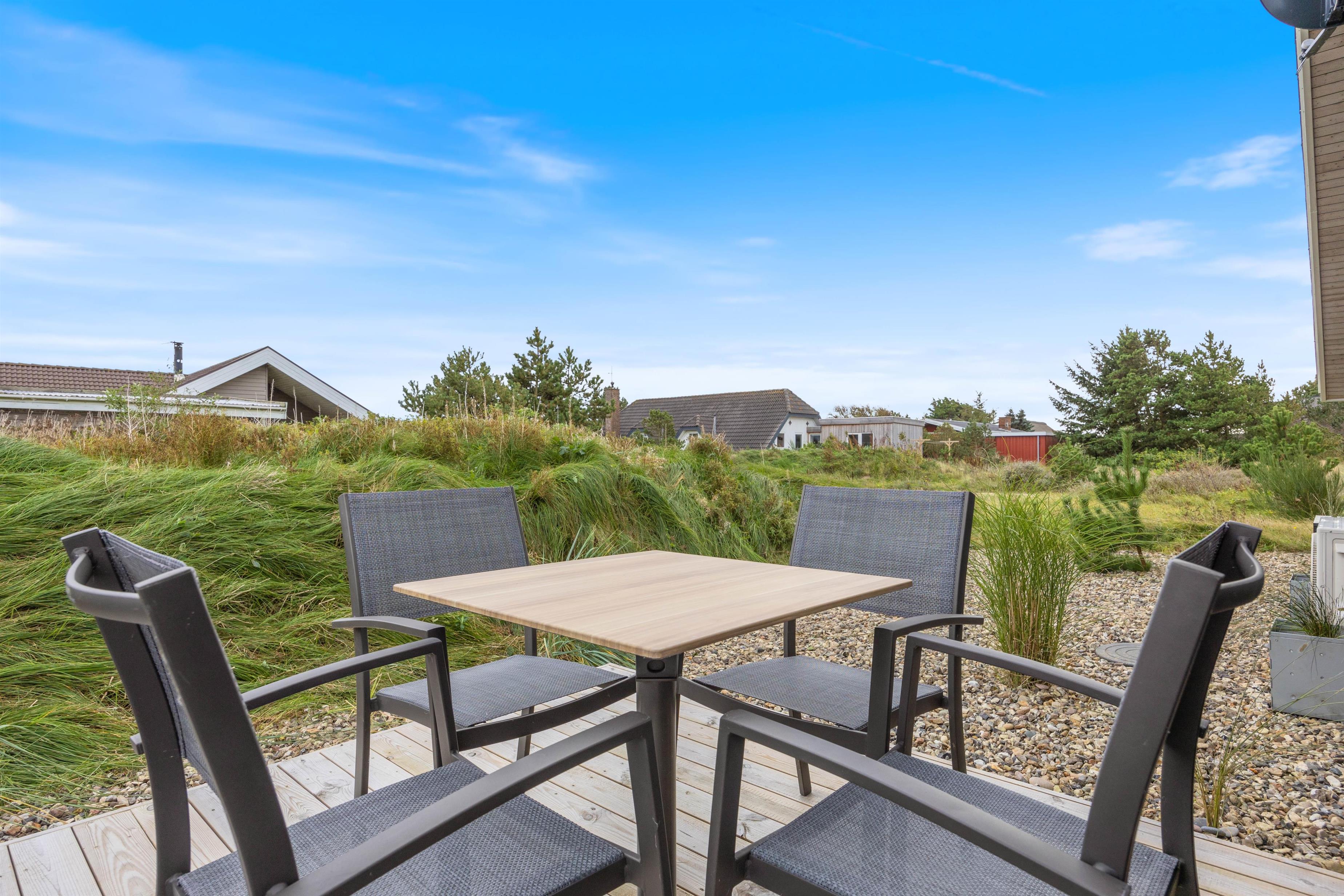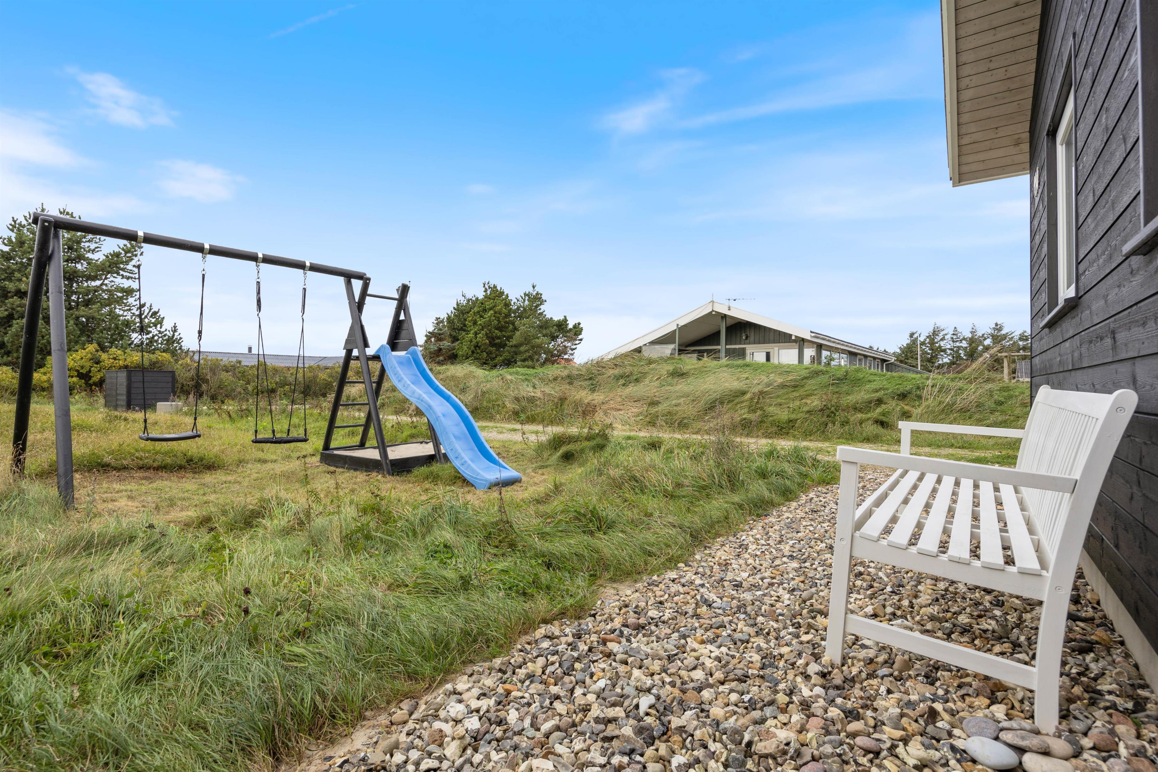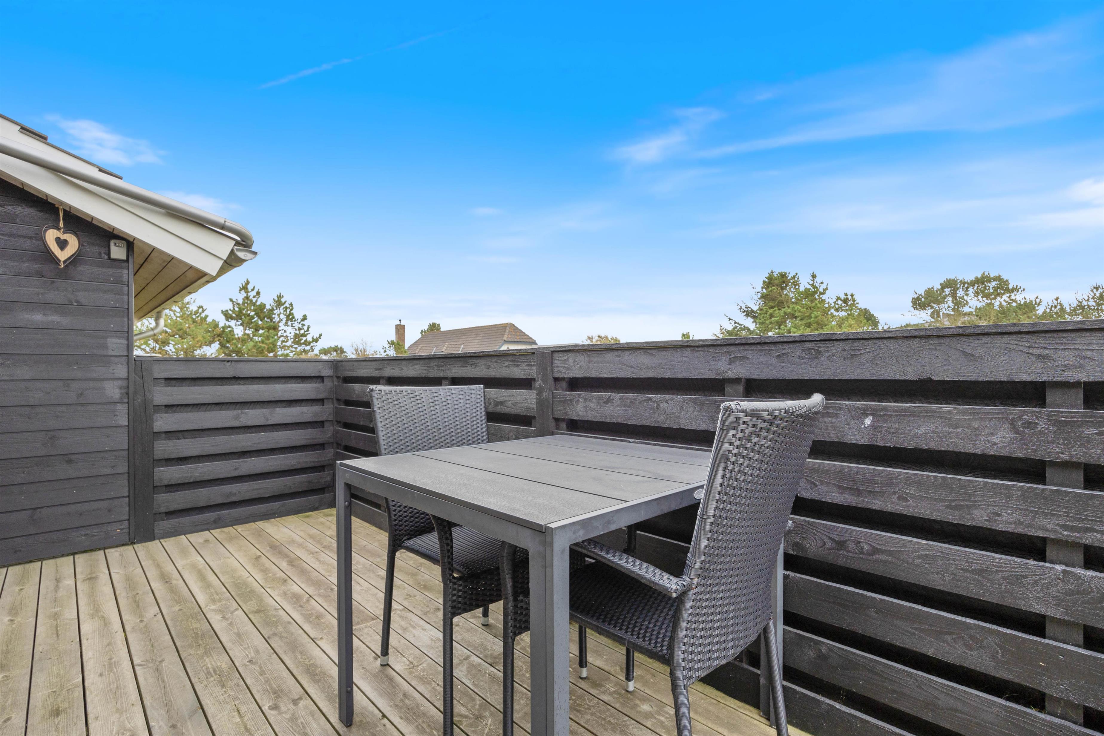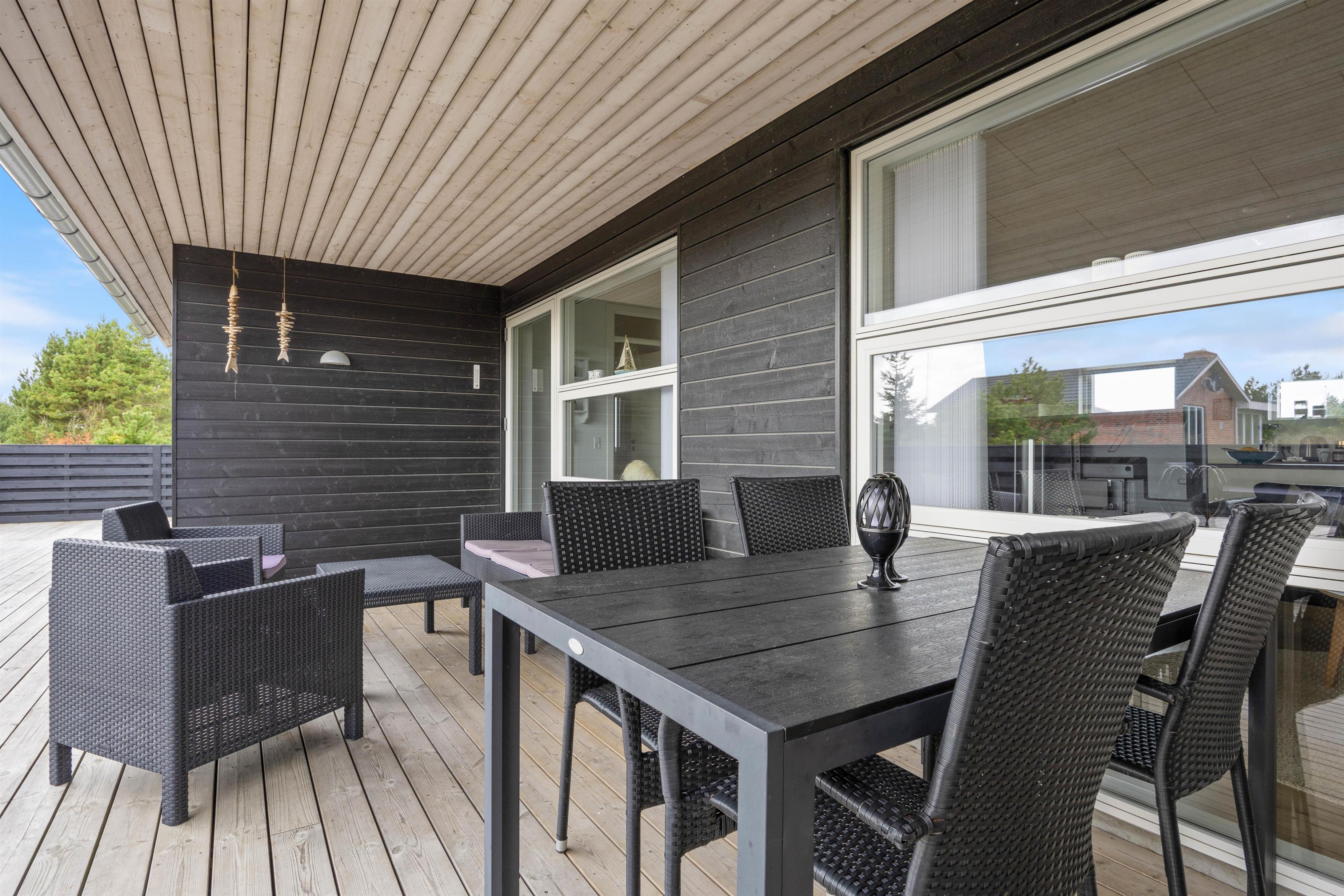 På den store, lukkede terrasse kan I nyde de tørre og solrige, såvel som de regnfulde feriedage under overdækningen. Der er også mulighed for at holde en hyggelig grillaften med en god flaske rødvin, så aftenen kan blive rundet af på bedste vis, og nye ferieplaner for morgendagen kan blive lagt. Samtidig med er der rig mulighed for, at børnene kan få frisk vind i kinderne med en rask gyngetur eller rutschebanetur.