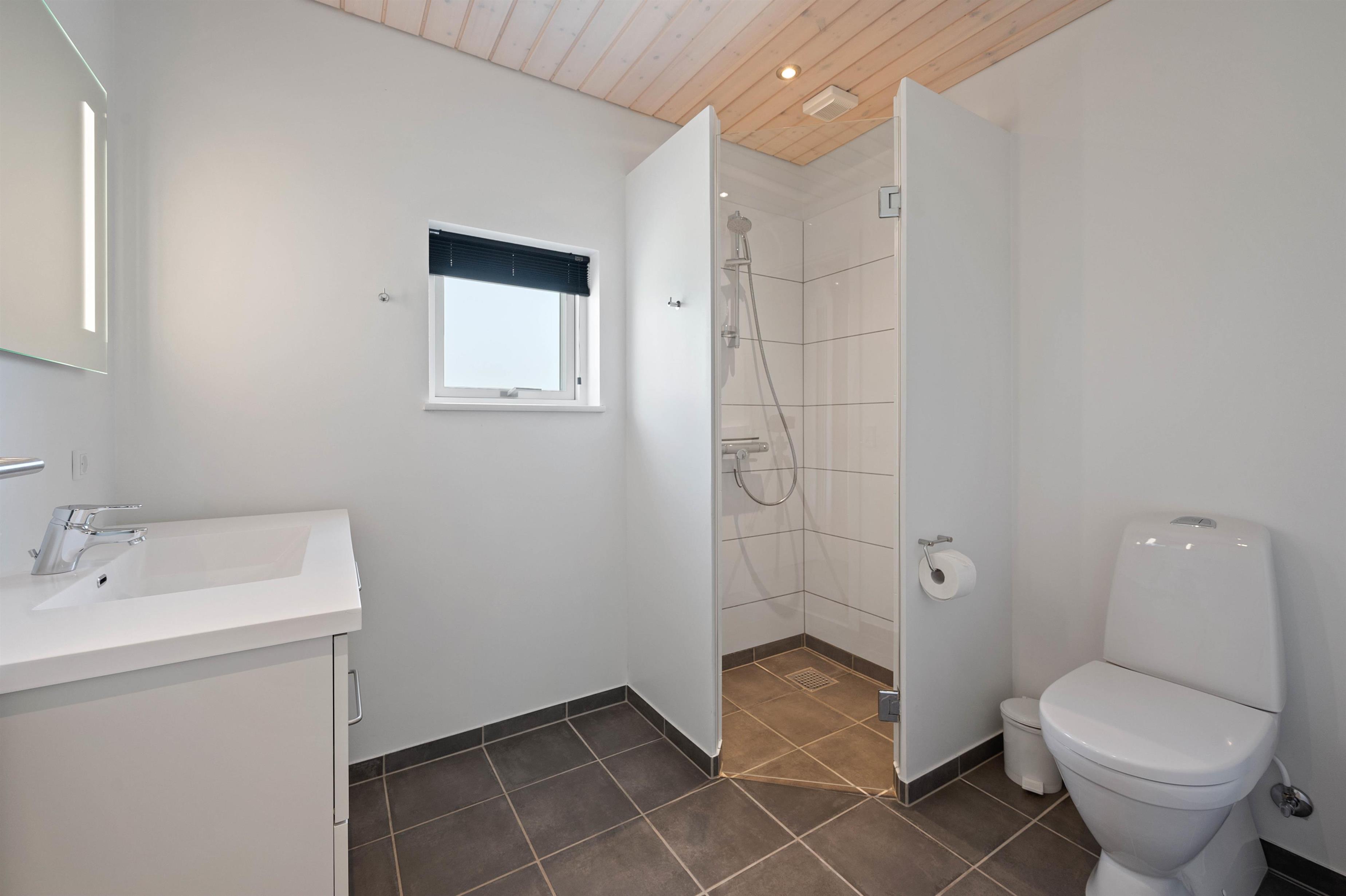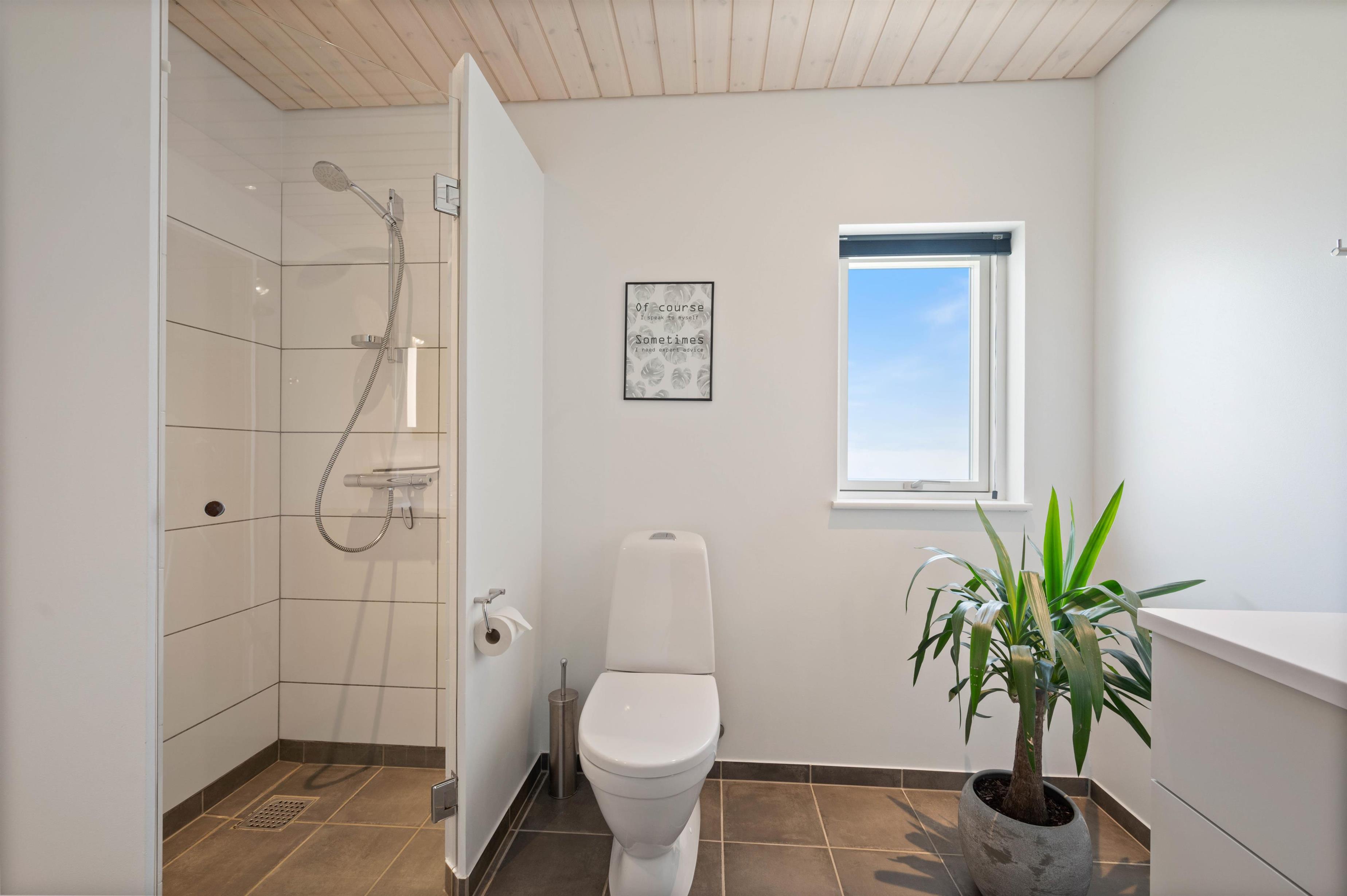 Med 2 badeværelser (med gulvvarme) slipper I for lange køer til badet om morgenen, og på det største badeværelse finder I tilmed den lækre sauna, hvor I kan varme jer og tanke nye kræfter efter en lang gåtur i den friske havluft.
