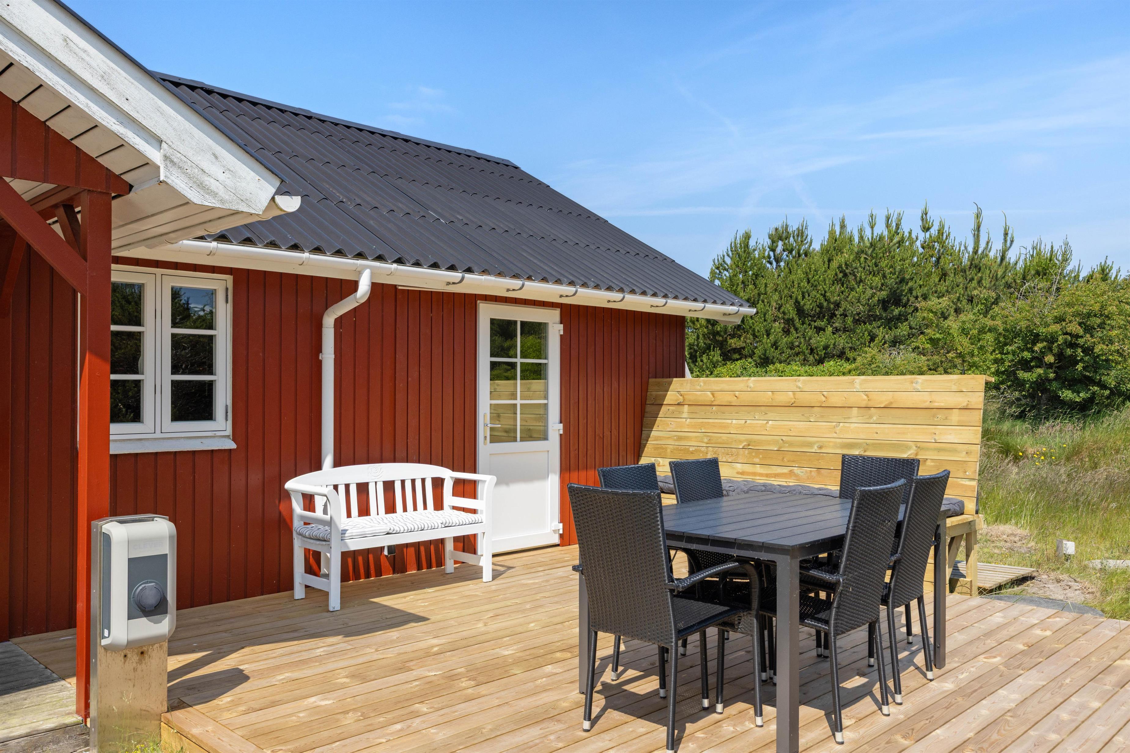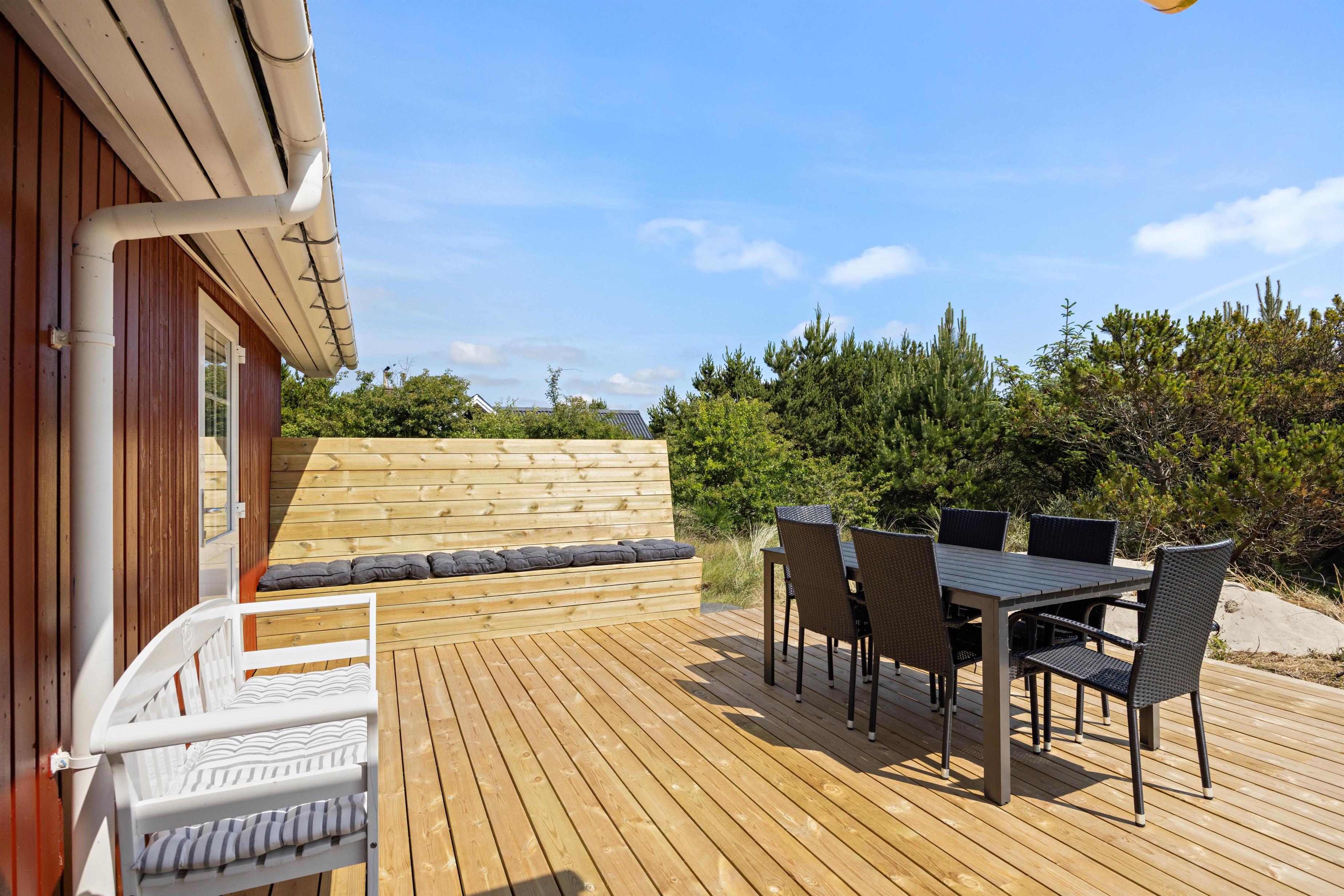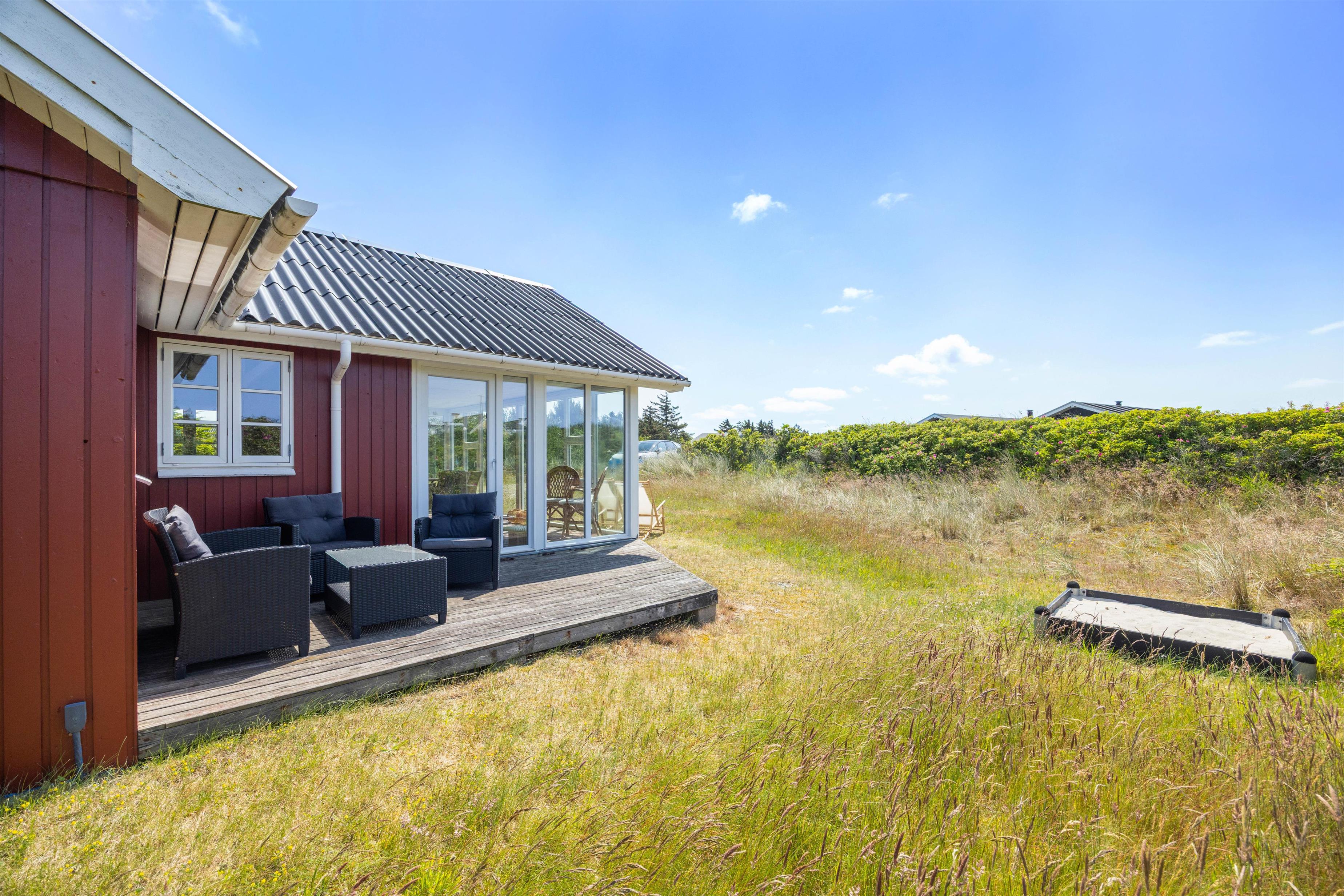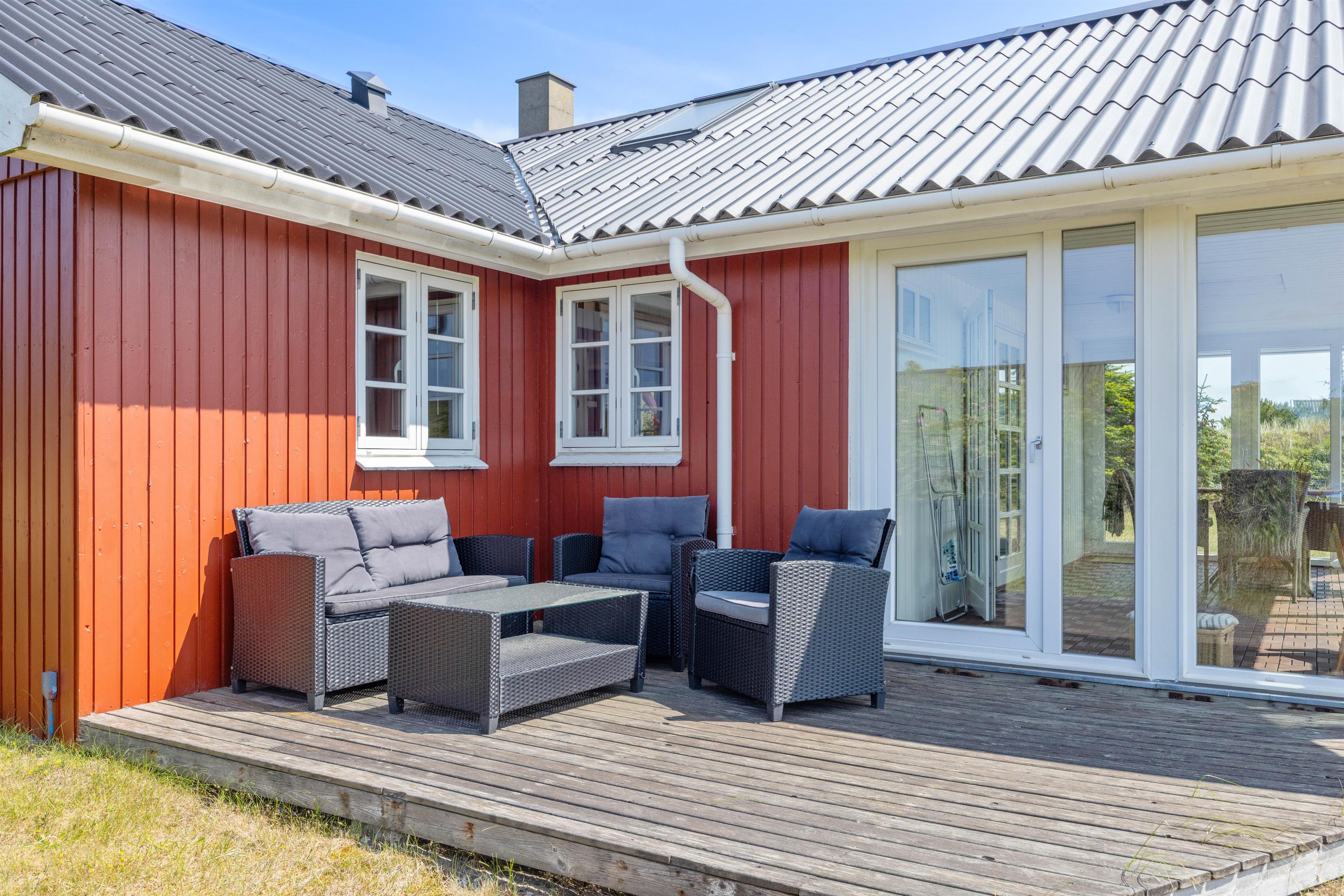 På den åbne terrasse har I frit udsyn til den skønne og fredfyldte natur der ligger omkring sommerhuset. Sommerhuset er nemlig beliggende på en smuk natur- og klitgrund, som er præget af de karakteristiske lyng og marehalms områder.