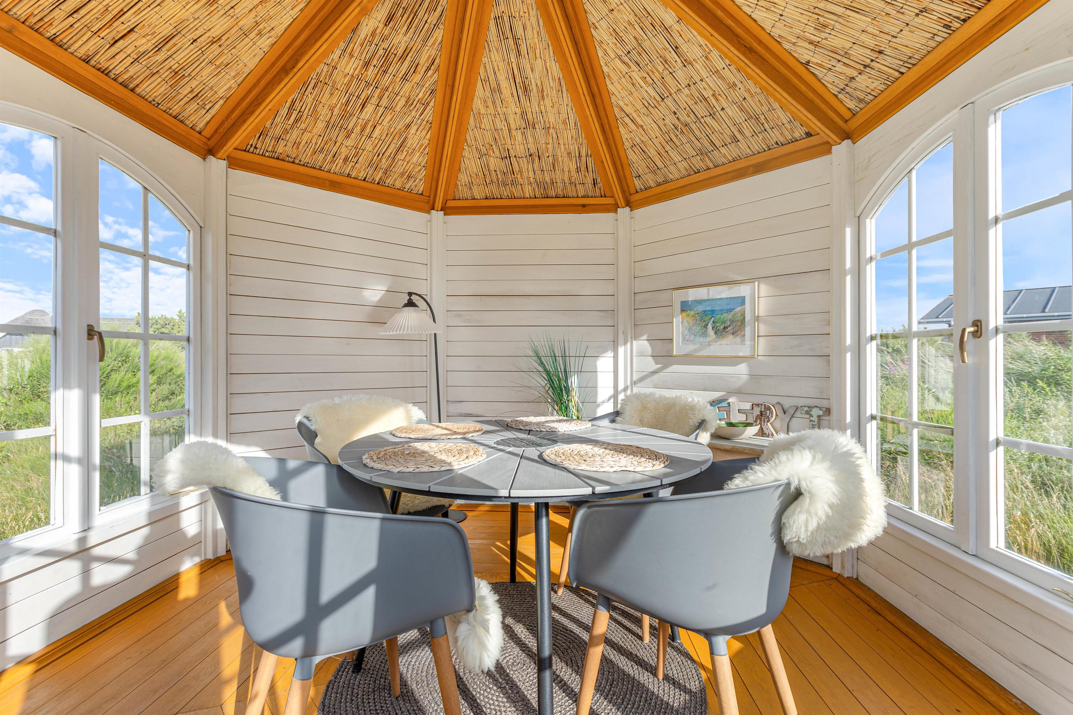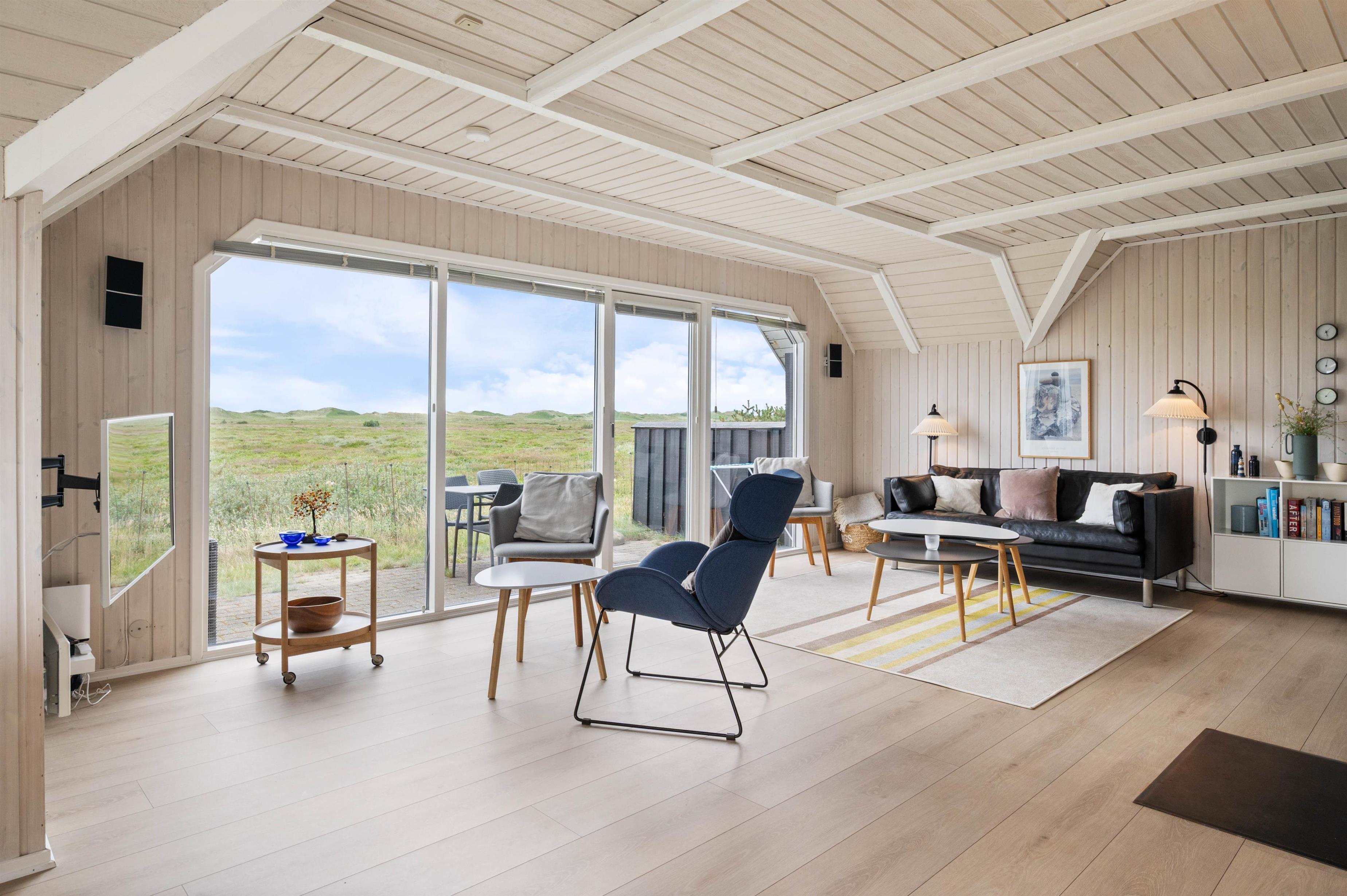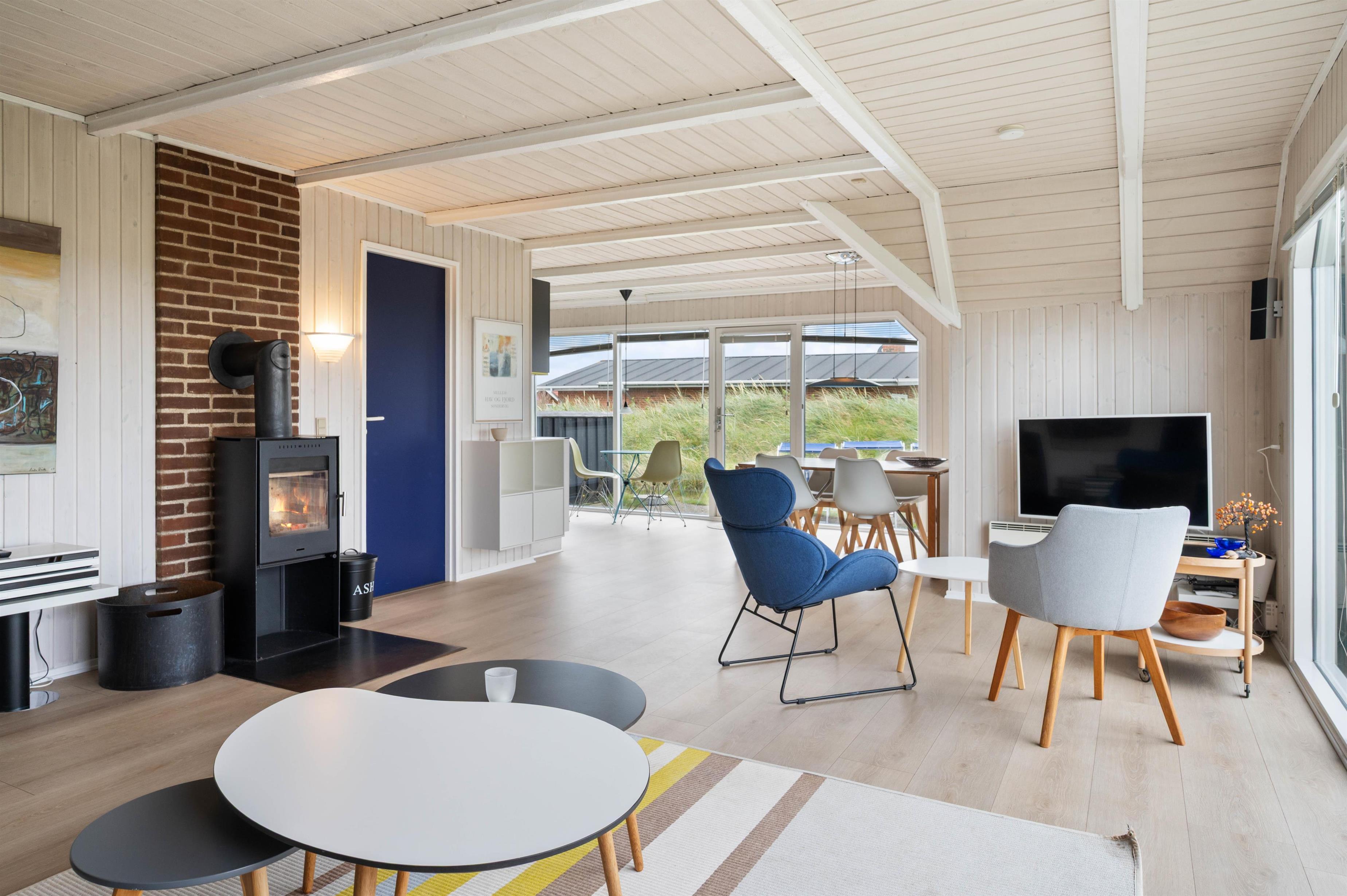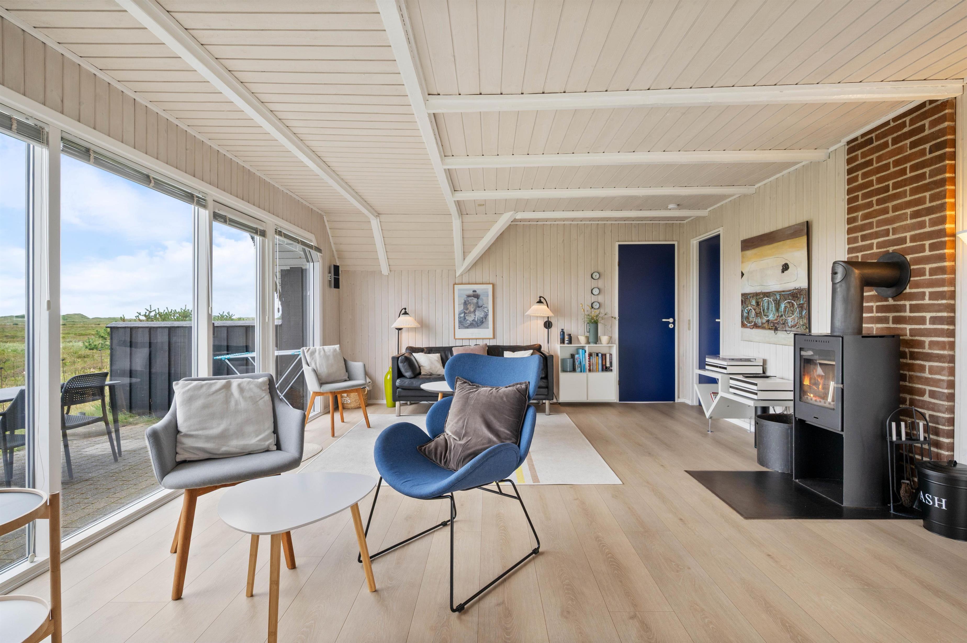 De mange store vinduer lader hver eneste solstråle slippe ind og sørger samtidig for, at I i al slags vejr kan nyde den smukke udsigt ud over heden og mod fyrtårnet fra sofaen, mens brændeovnen spreder god varme og stemning i stuen.